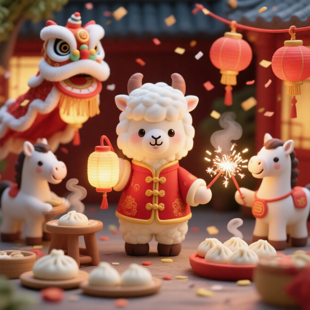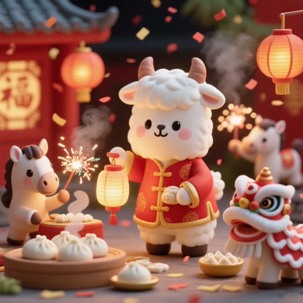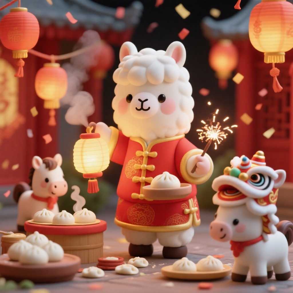 PROMPT: Cute Popmart-style 3D miniature [festival] courtyard, natural candid moment, no posing, no one looking at camera. An adorable anthropomorphic [SUBJECT1] in red traditional clothing stands at the center, holding a glowing lantern and gently greeting. Around it, super cute Popmart-style [SUBJECT2] are naturally busy with their own activities: making dumplings, serving steaming baozi, playing sparklers, performing lion dance, hanging lanterns not looking at the llama.Warm lantern light, soft confetti and smoke, asymmetrical lively composition, shallow depth, tilt-shift, ultra-detailed soft clay toy texture, vivid red and gold, cinematic Octane render, joyful natural atmosphere