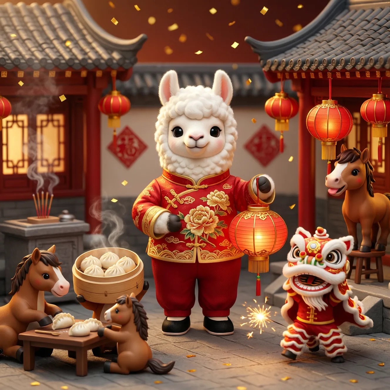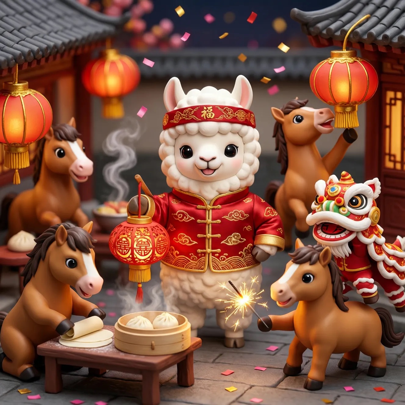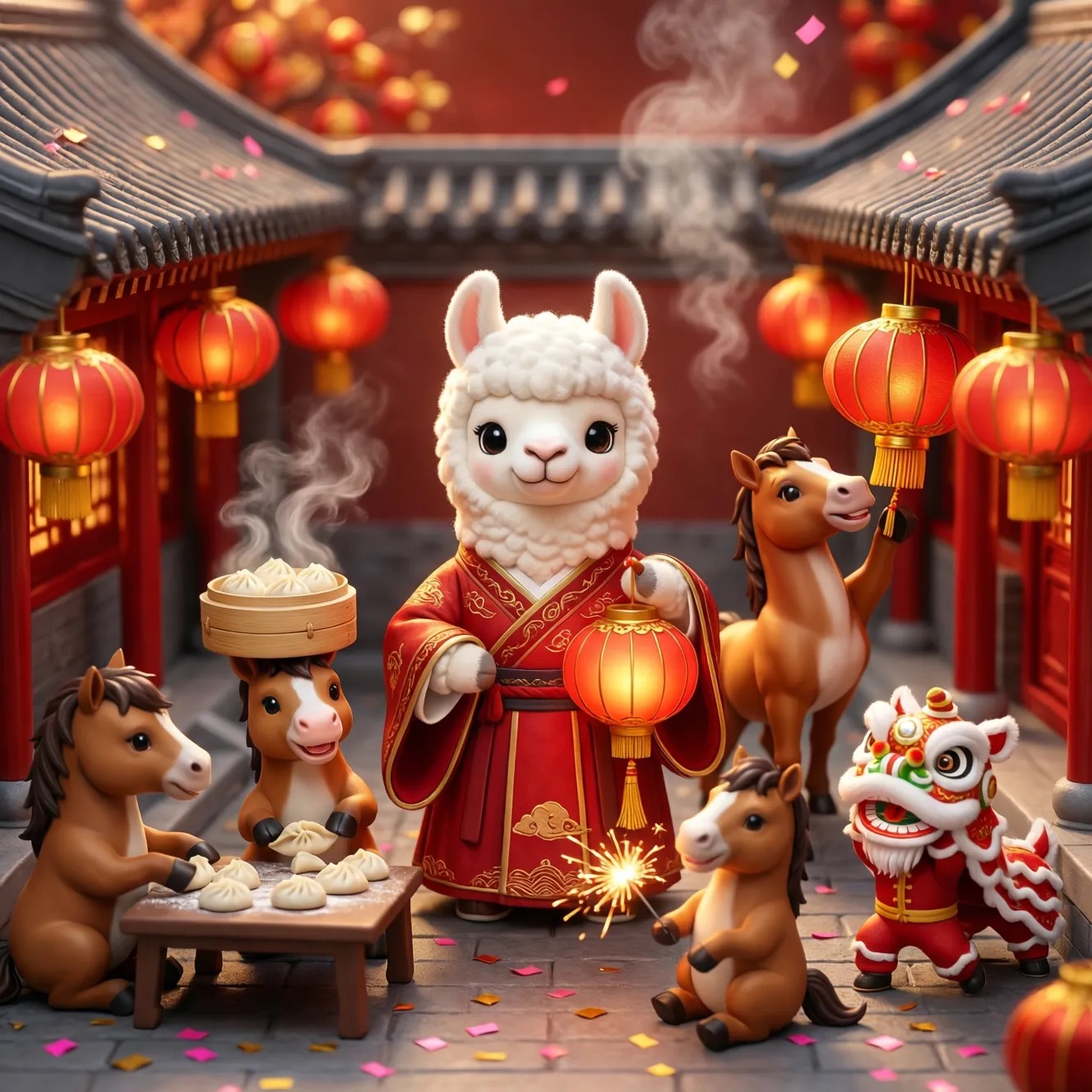 Cute Popmart-style 3D miniature Chinese New Year courtyard, natural candid moment, no posing, no one looking at camera. An adorable anthropomorphic white llama in red traditional clothing stands at the center, holding a glowing lantern and gently greeting. Around it, super cute Popmart-style horses are naturally busy with their own activities: making dumplings, serving steaming baozi, playing sparklers, performing lion dance, hanging lanterns not looking at the llama.Warm lantern light, soft confetti and smoke, asymmetrical lively composition, shallow depth, tilt-shift, ultra-detailed soft clay toy texture, vivid red and gold, cinematic Octane render, joyful natural atmosphere