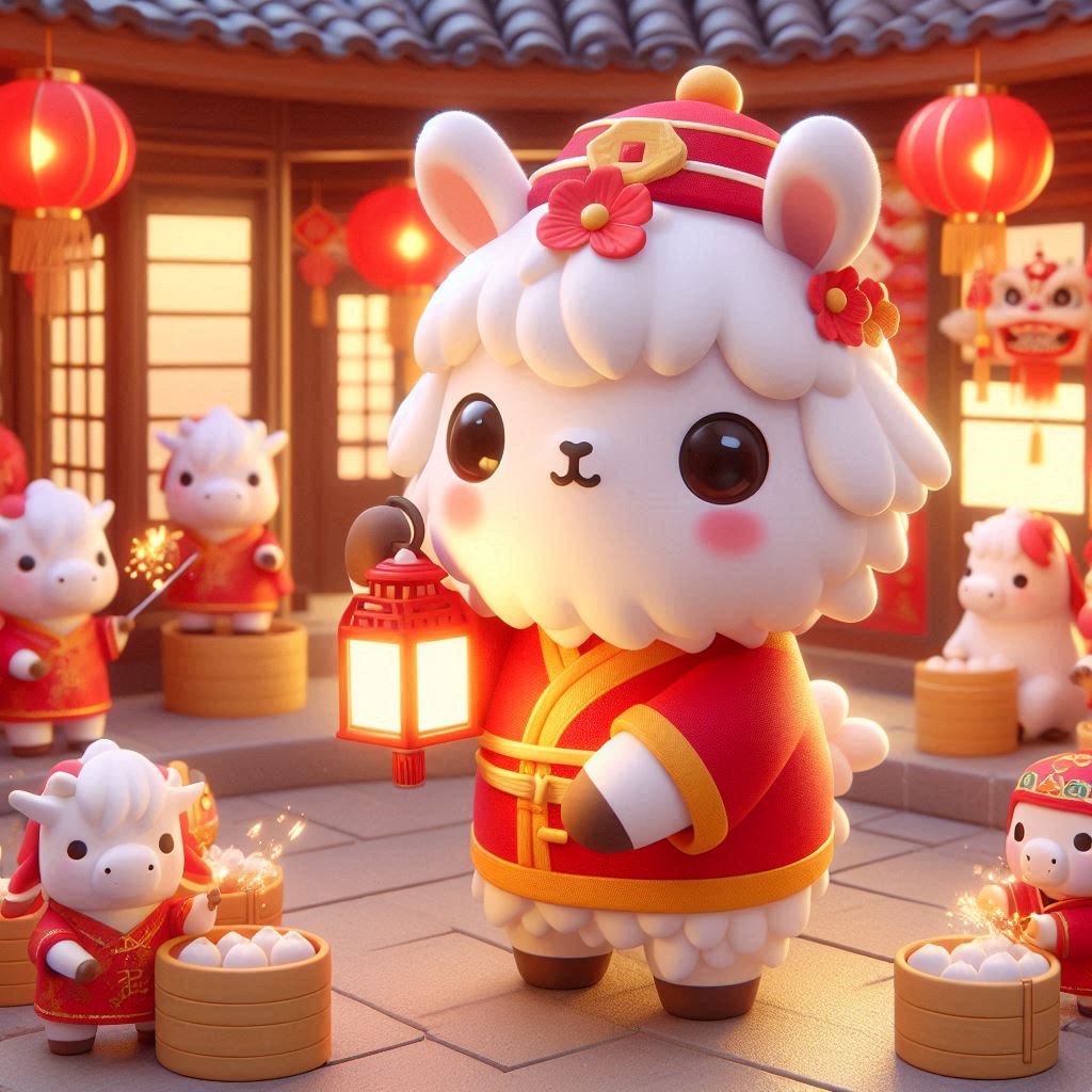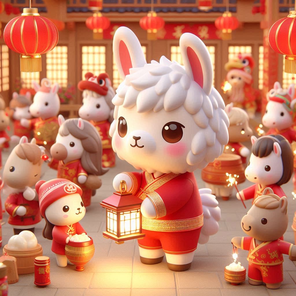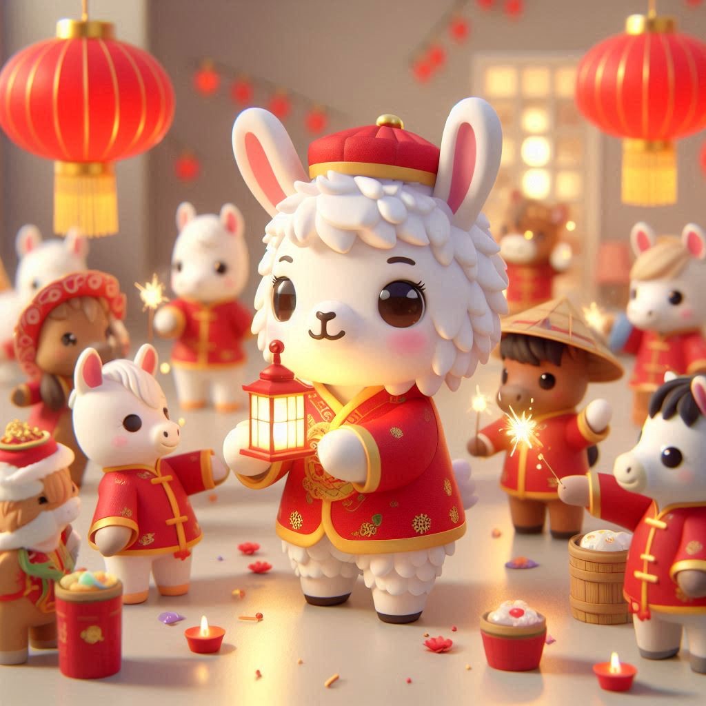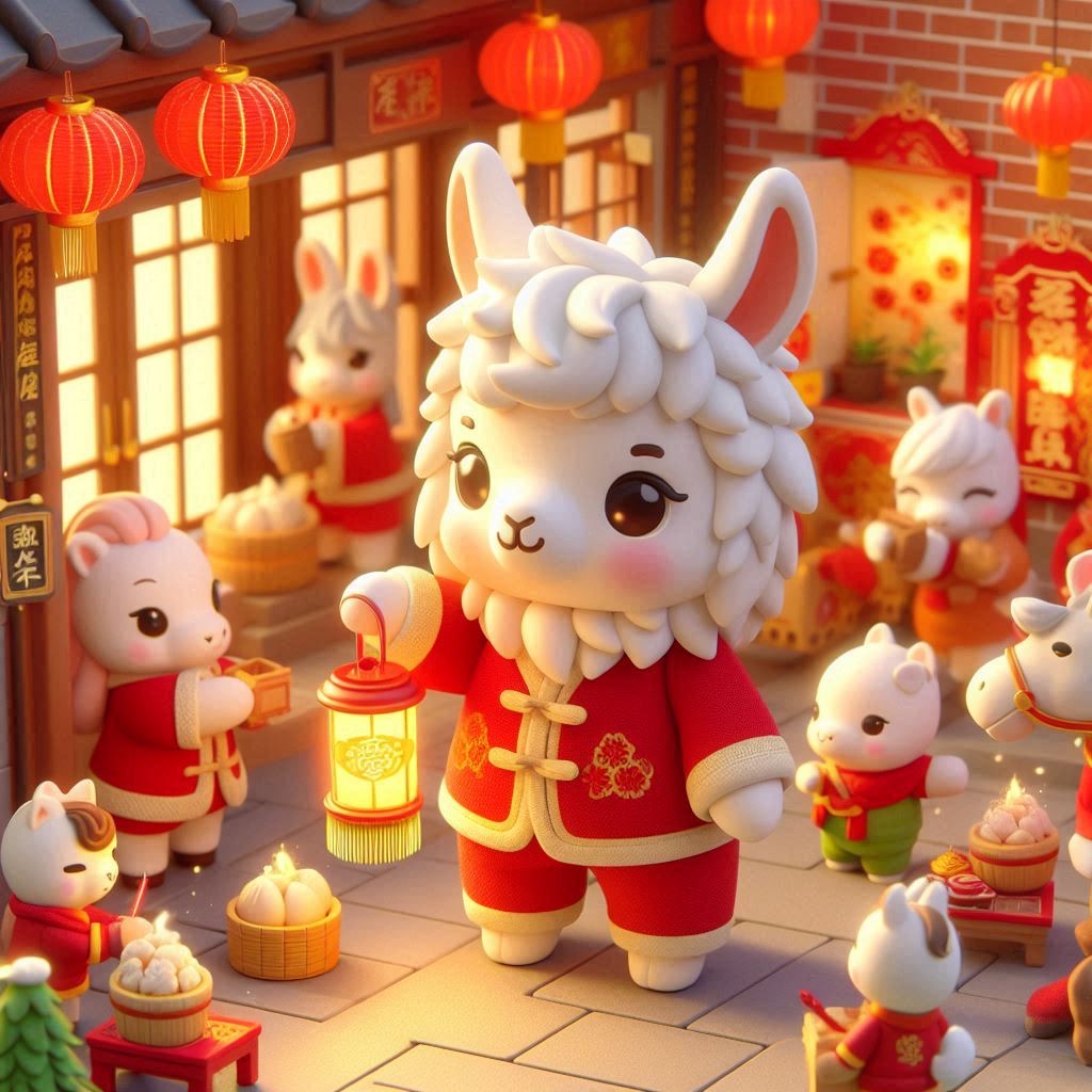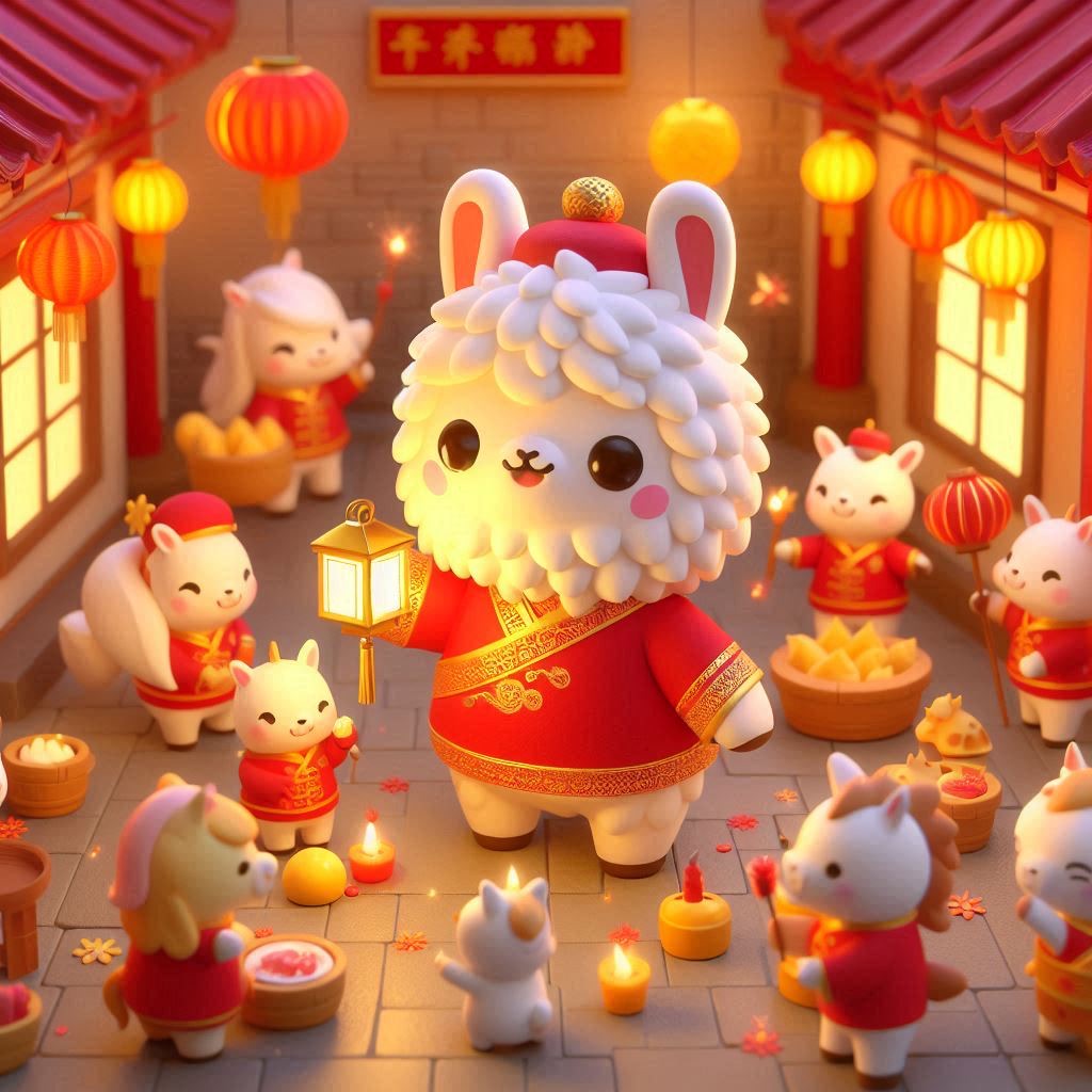 PROMPT: Cute Popmart-style 3D miniature [festival] courtyard, natural candid moment, no posing, no one looking at camera. An adorable anthropomorphic [SUBJECT1] in red traditional clothing stands at the center, holding a glowing lantern and gently greeting. Around it, super cute Popmart-style [SUBJECT2] are naturally busy with their own activities: making dumplings, serving steaming baozi, playing sparklers, performing lion dance, hanging lanterns not looking at the llama.Warm lantern light, soft confetti and smoke, asymmetrical lively composition, shallow depth, tilt-shift, ultra-detailed soft clay toy texture, vivid red and gold, cinematic Octane render, joyful natural atmosphere