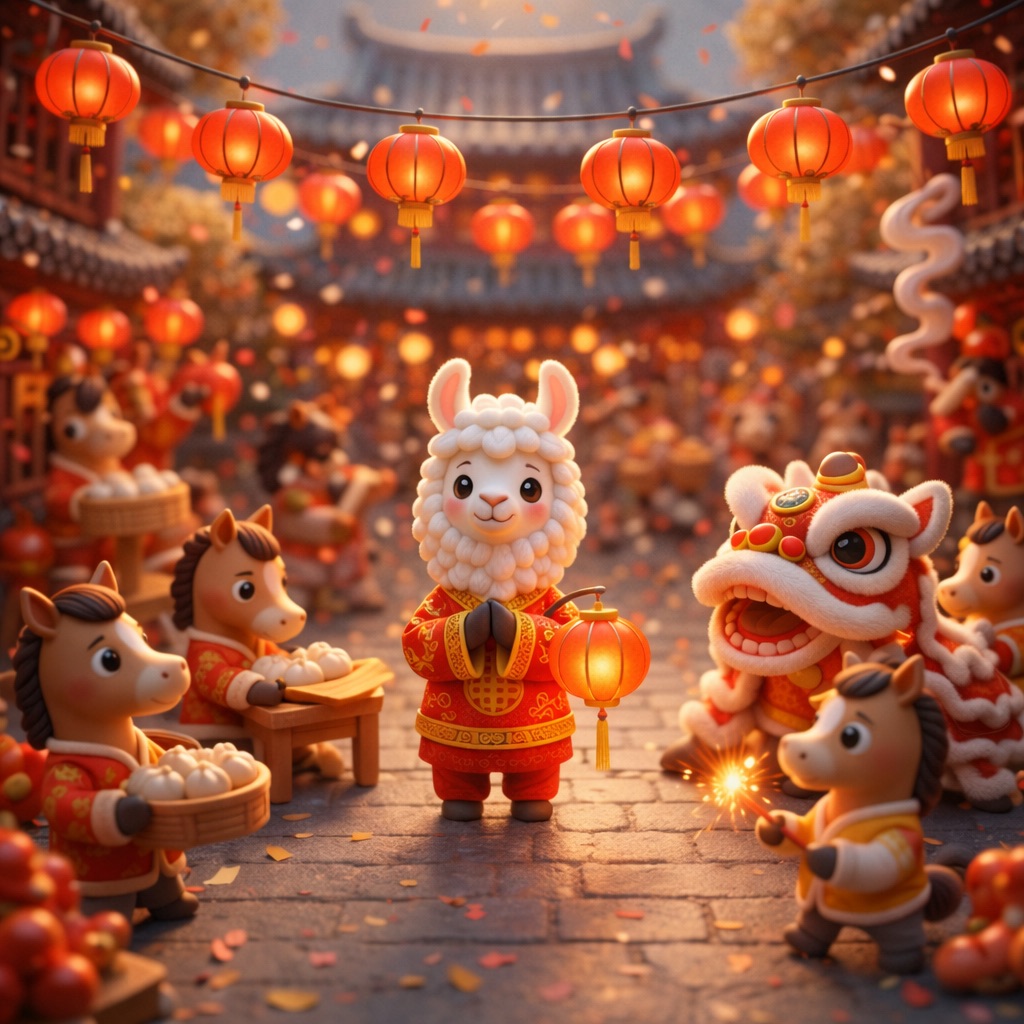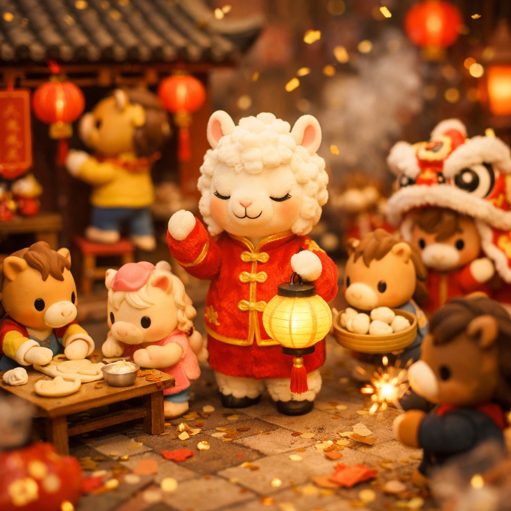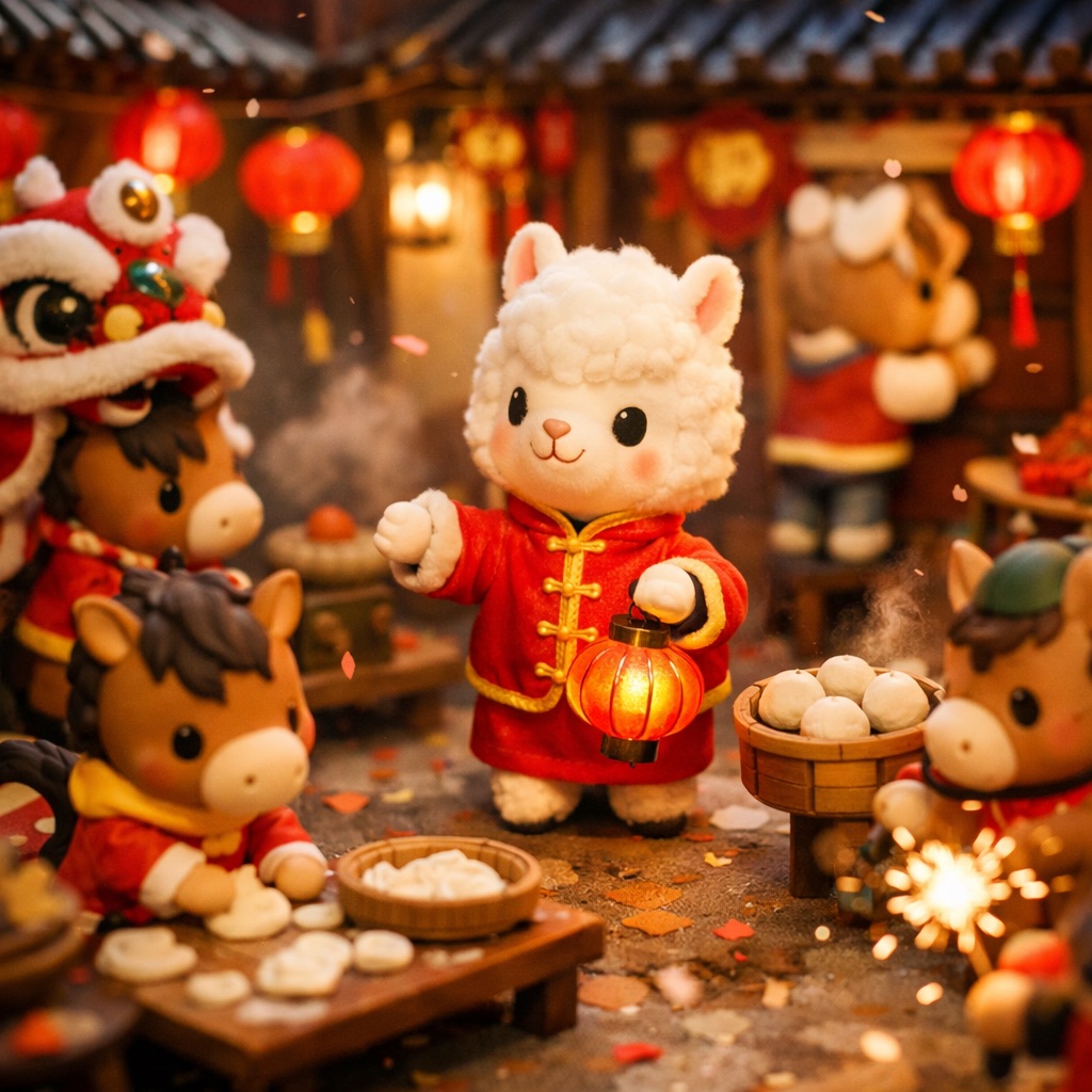 PROMPT: Cute Popmart-style 3D miniature [festival] courtyard, natural candid moment, no posing, no one looking at camera. An adorable anthropomorphic [SUBJECT1] in red traditional clothing stands at the center, holding a glowing lantern and gently greeting. Around it, super cute Popmart-style [SUBJECT2] are naturally busy with their own activities: making dumplings, serving steaming baozi, playing sparklers, performing lion dance, hanging lanterns not looking at the llama.Warm lantern light, soft confetti and smoke, asymmetrical lively composition, shallow depth, tilt-shift, ultra-detailed soft clay toy texture, vivid red and gold, cinematic Octane render, joyful natural atmosphere