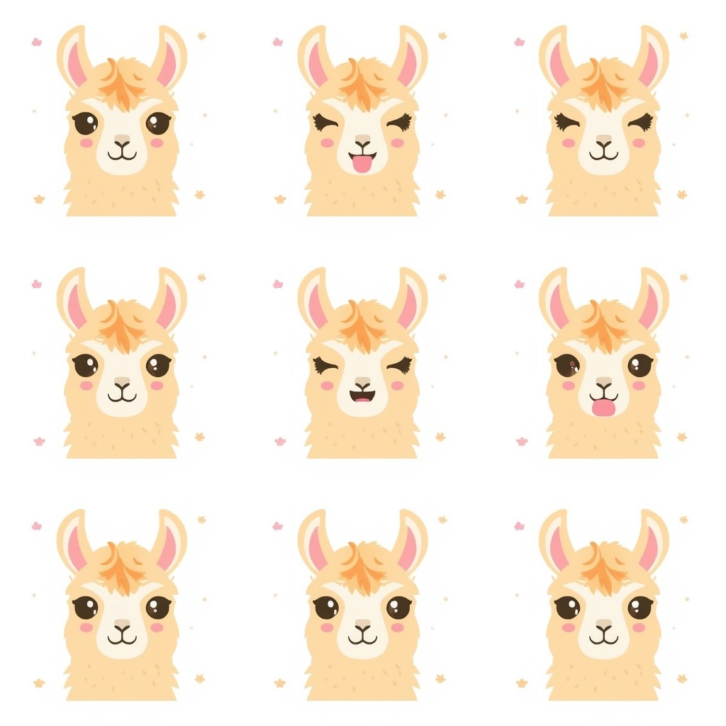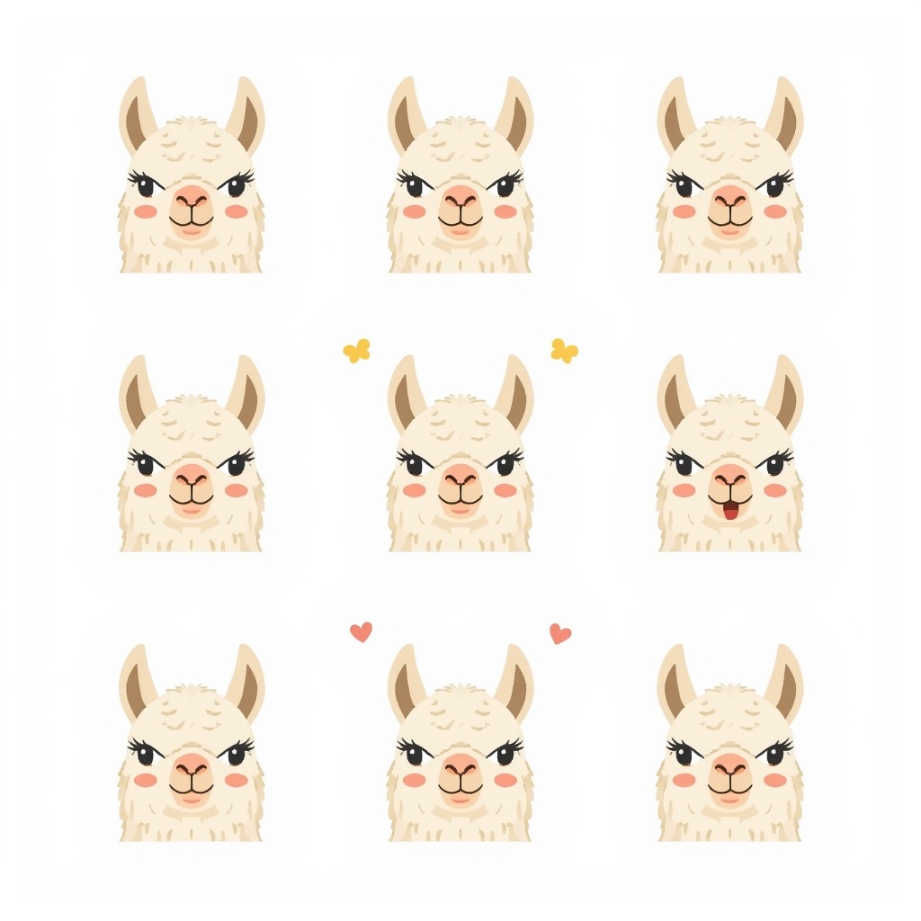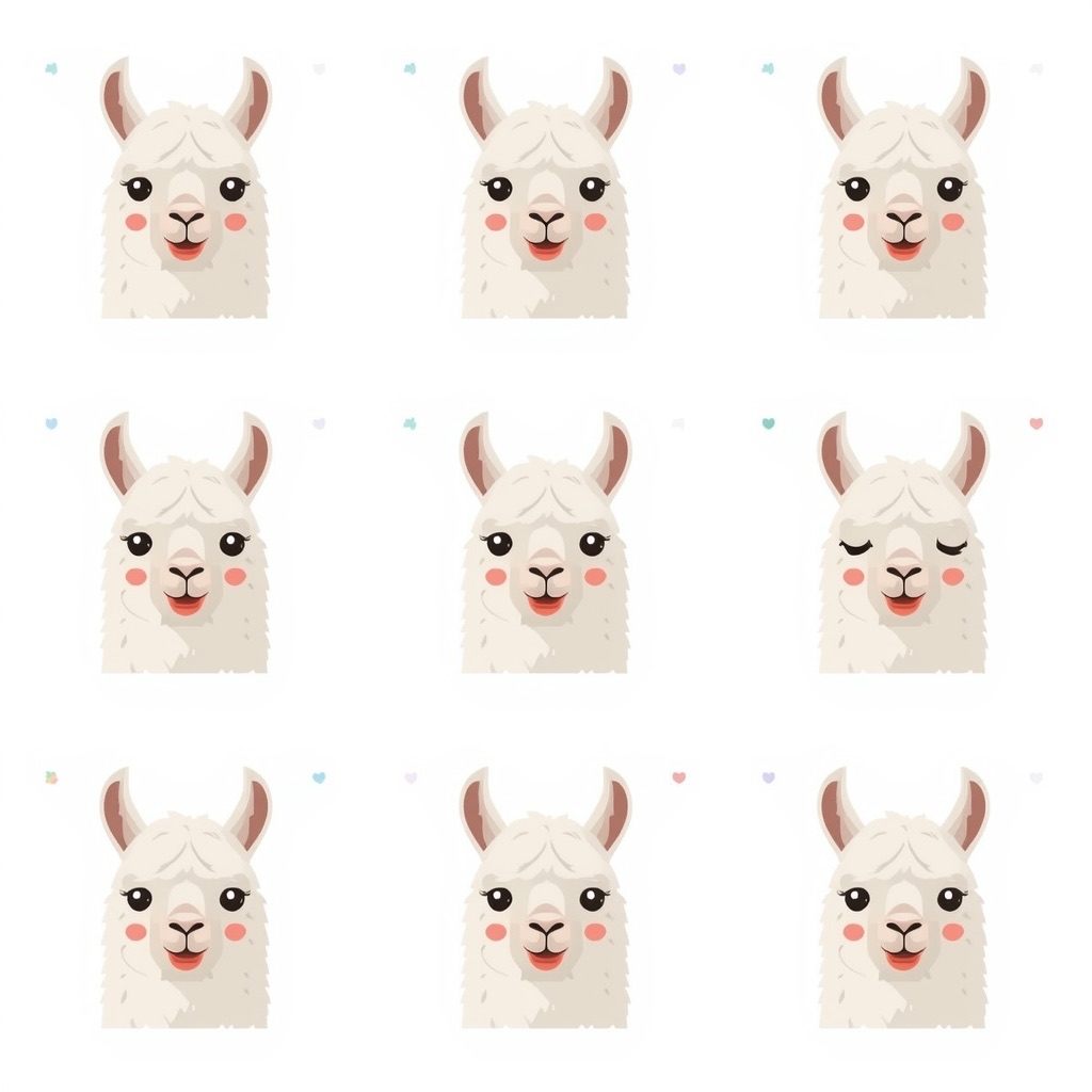 Flat vector emoji sheet of a llama face only, front view, close-up head portrait, no full body, no hands, no pose outside the face, pure 2D flat vector, no 3D, no realistic light, no depth, no texture, bold clean outlines, simple geometric shapes, minimal flat colors, 9-square grid layout, evenly spaced, same a llama with 9 clear facial expressions: happy, laugh, shy, surprised, sleepy, angry, cry, excited, love, tiny spring elements like flowers, leaves, petals, butterflies, very clean solid background, no clutter, playful casual game vector style, crisp SVG-like edges, centered square composition, 4K