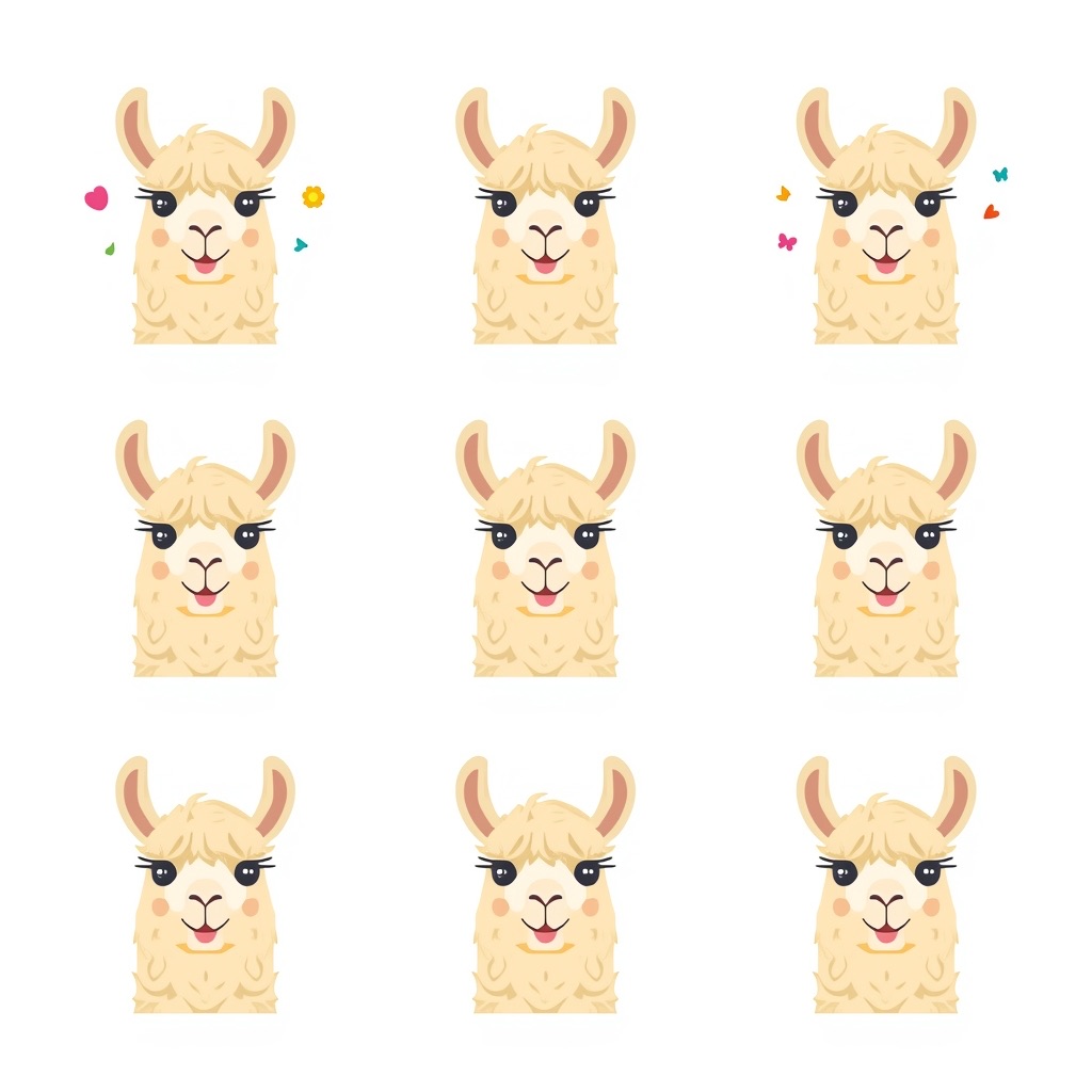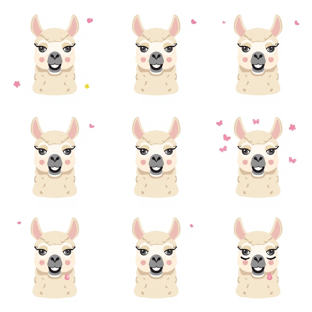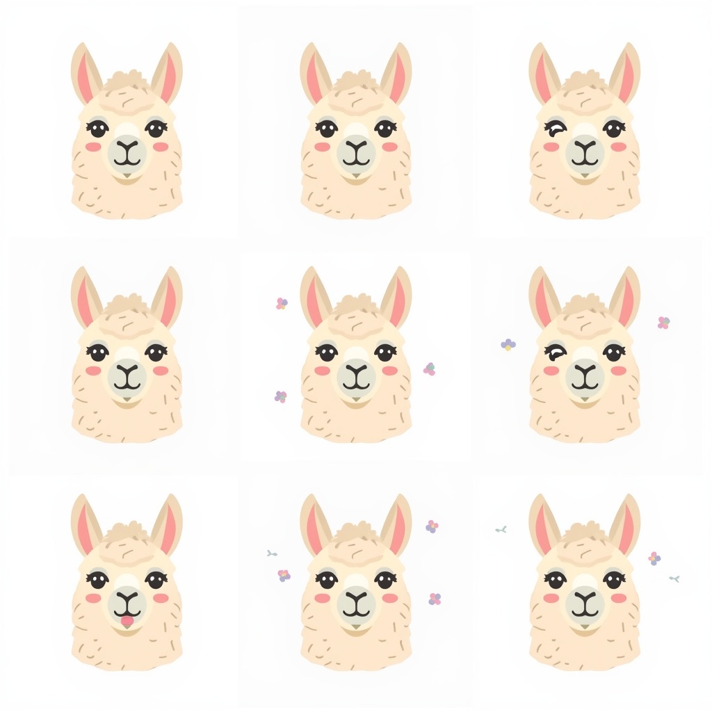 Flat vector emoji sheet of a llama face only, front view, close-up head portrait, no full body, no hands, no pose outside the face, pure 2D flat vector, no 3D, no realistic light, no depth, no texture, bold clean outlines, simple geometric shapes, minimal flat colors, 9-square grid layout, evenly spaced, same a llama with 9 clear facial expressions: happy, laugh, shy, surprised, sleepy, angry, cry, excited, love, tiny spring elements like flowers, leaves, petals, butterflies, very clean solid background, no clutter, playful casual game vector style, crisp SVG-like edges, centered square composition, 4K