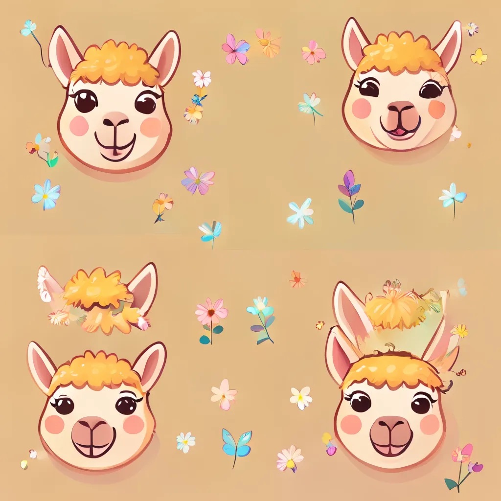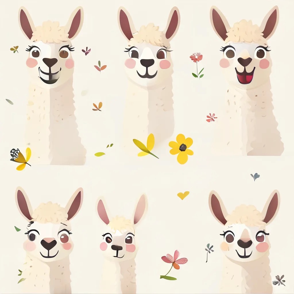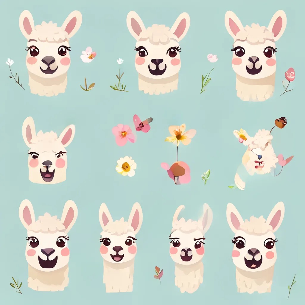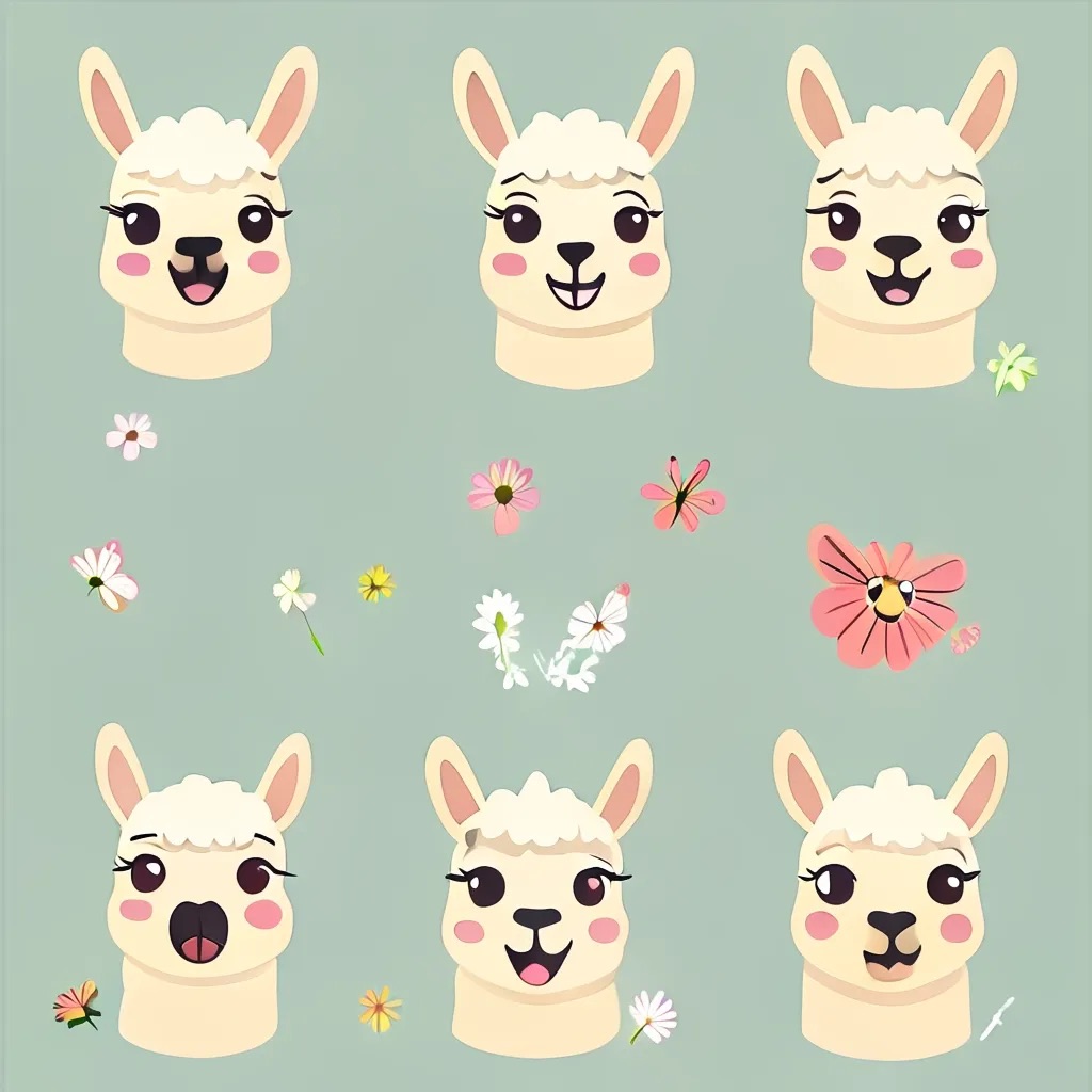 Flat vector emoji sheet of a llama face only, front view, close-up head portrait, no full body, no hands, no pose outside the face, pure 2D flat vector, no 3D, no realistic light, no depth, no texture, bold clean outlines, simple geometric shapes, minimal flat colors, 9-square grid layout, evenly spaced, same a llama with 9 clear facial expressions: happy, laugh, shy, surprised, sleepy, angry, cry, excited, love, tiny spring elements like flowers, leaves, petals, butterflies, very clean solid background, no clutter, playful casual game vector style, crisp SVG-like edges, centered square composition, 4K