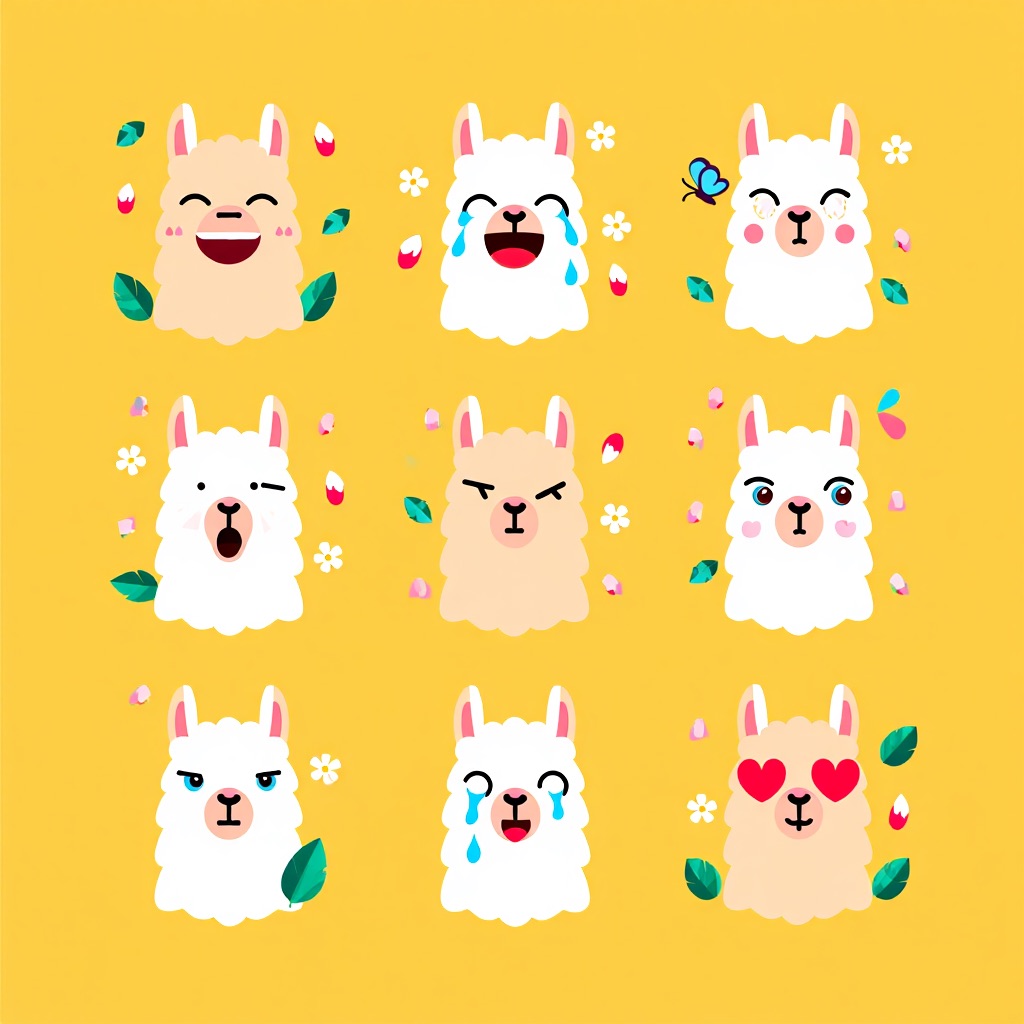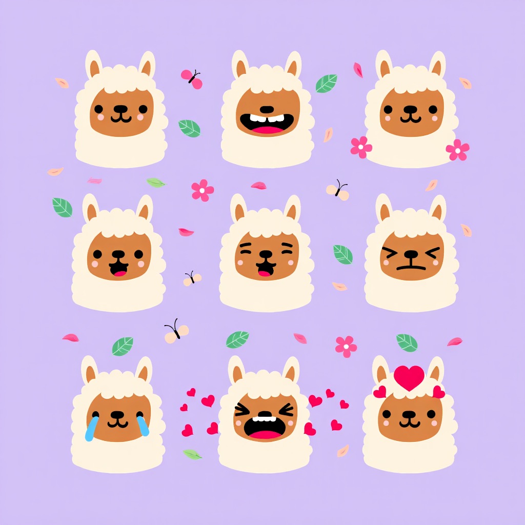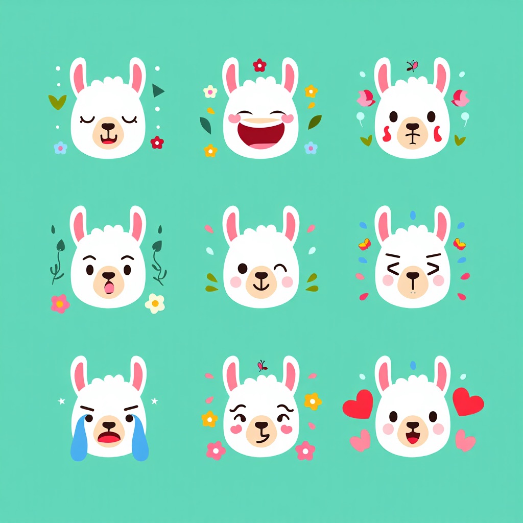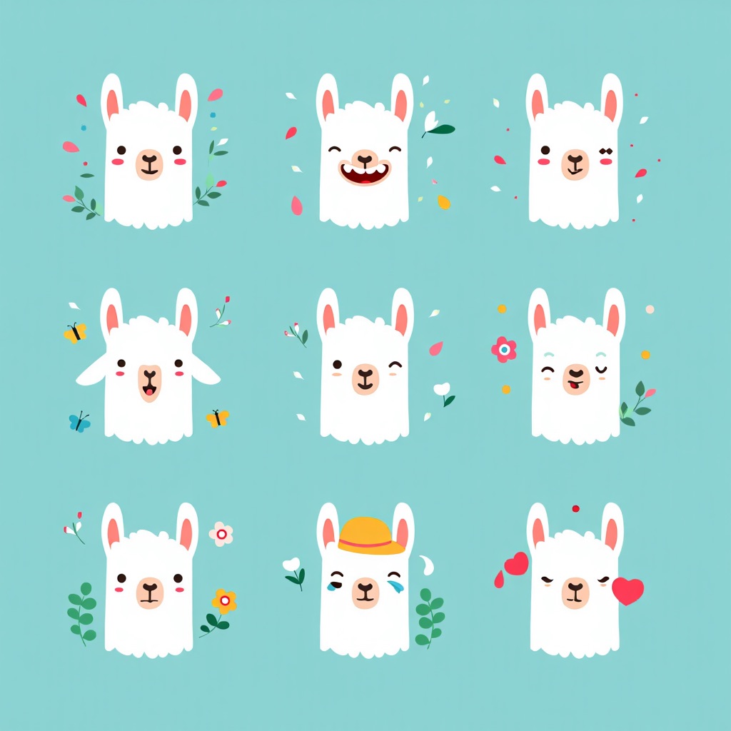 Flat vector emoji sheet of a llama face only, front view, close-up head portrait, no full body, no hands, no pose outside the face, pure 2D flat vector, no 3D, no realistic light, no depth, no texture, bold clean outlines, simple geometric shapes, minimal flat colors, 9-square grid layout, evenly spaced, same a llama with 9 clear facial expressions: happy, laugh, shy, surprised, sleepy, angry, cry, excited, love, tiny spring elements like flowers, leaves, petals, butterflies, very clean solid background, no clutter, playful casual game vector style, crisp SVG-like edges, centered square composition, 4K