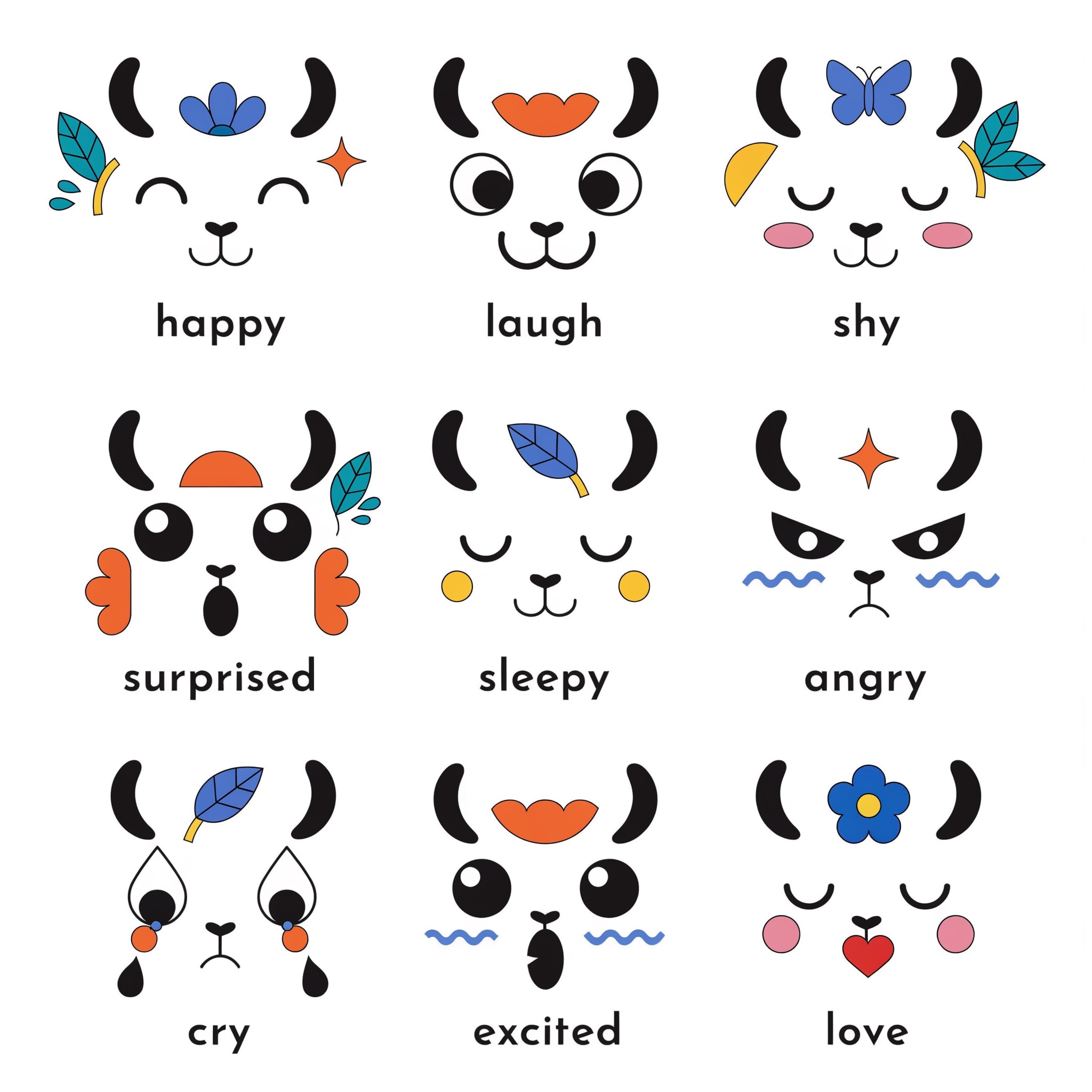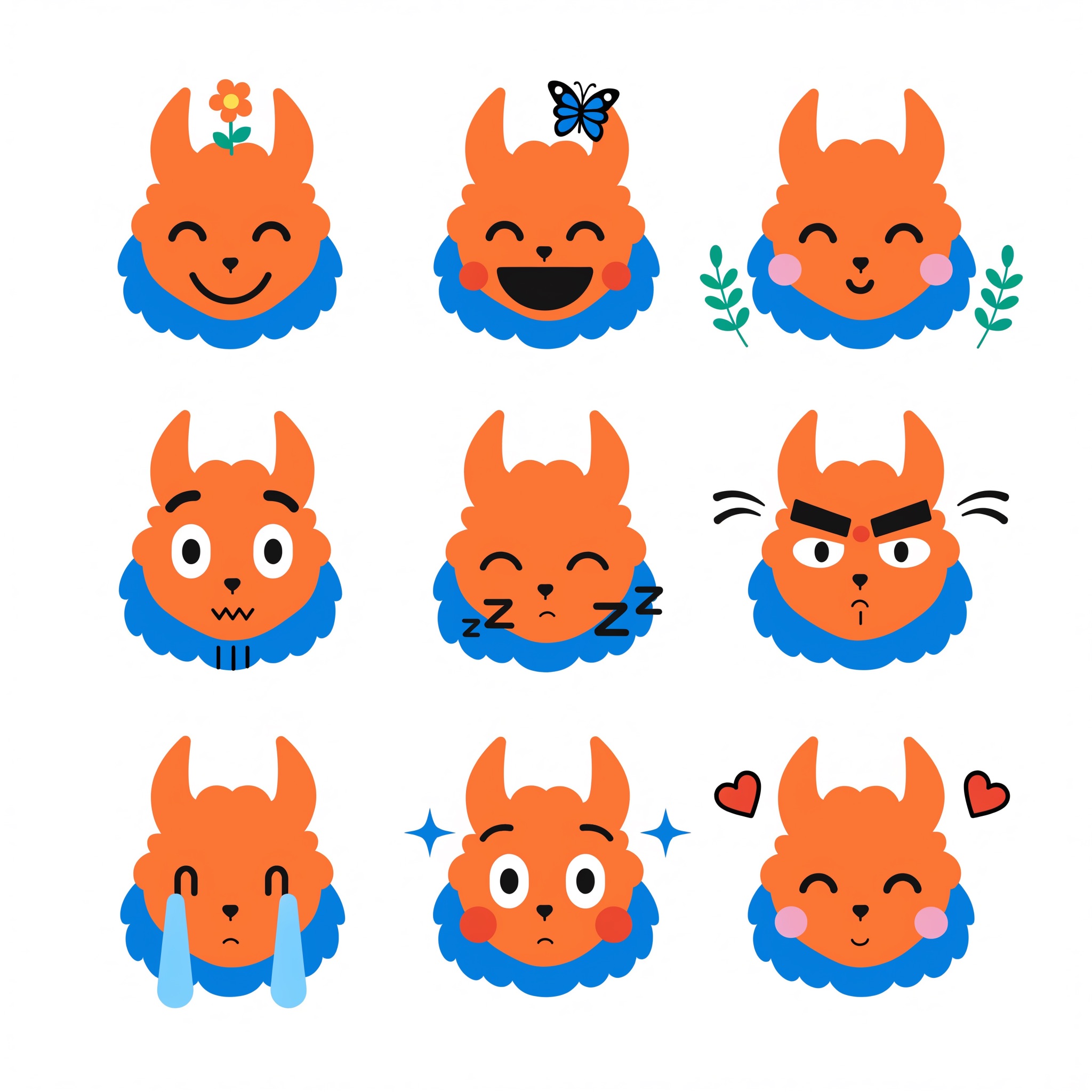 PROMPT: Flat vector emoji sheet of [subject] face only, front view, close-up head portrait, no full body, no hands, no pose outside the face, pure 2D flat vector, no 3D, no realistic light, no depth, no texture, bold clean outlines, simple geometric shapes, minimal flat colors, 9-square grid layout, evenly spaced, same [subject] with 9 clear facial expressions: happy, laugh, shy, surprised, sleepy, angry, cry, excited, love, tiny spring elements like flowers, leaves, petals, butterflies, very clean solid background, no clutter, playful casual game vector style, crisp SVG-like edges, centered square composition, 4K