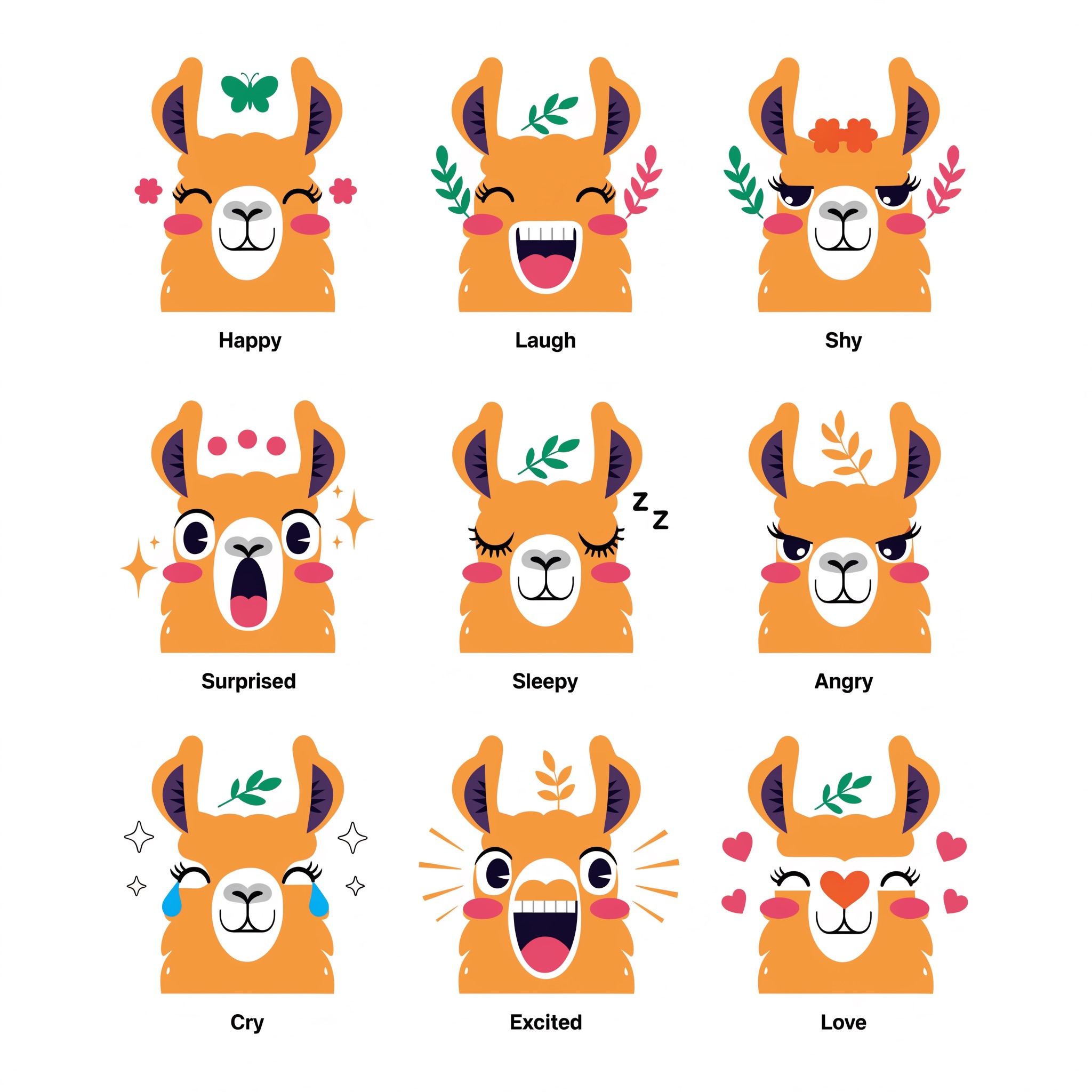 Flat vector emoji sheet of a llama face only, front view, close-up head portrait, no full body, no hands, no pose outside the face, pure 2D flat vector, no 3D, no realistic light, no depth, no texture, bold clean outlines, simple geometric shapes, minimal flat colors, 9-square grid layout, evenly spaced, same a llama with 9 clear facial expressions: happy, laugh, shy, surprised, sleepy, angry, cry, excited, love, tiny spring elements like flowers, leaves, petals, butterflies, very clean solid background, no clutter, playful casual game vector style, crisp SVG-like edges, centered square composition, 4K