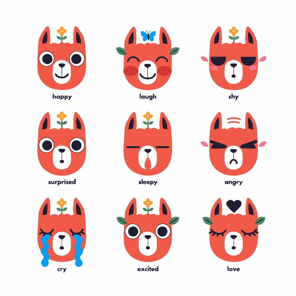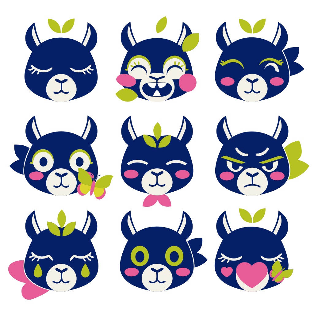 PROMPT: Flat vector emoji sheet of [subject] face only, front view, close-up head portrait, no full body, no hands, no pose outside the face, pure 2D flat vector, no 3D, no realistic light, no depth, no texture, bold clean outlines, simple geometric shapes, minimal flat colors, 9-square grid layout, evenly spaced, same [subject] with 9 clear facial expressions: happy, laugh, shy, surprised, sleepy, angry, cry, excited, love, tiny spring elements like flowers, leaves, petals, butterflies, very clean solid background, no clutter, playful casual game vector style, crisp SVG-like edges, centered square composition, 4K