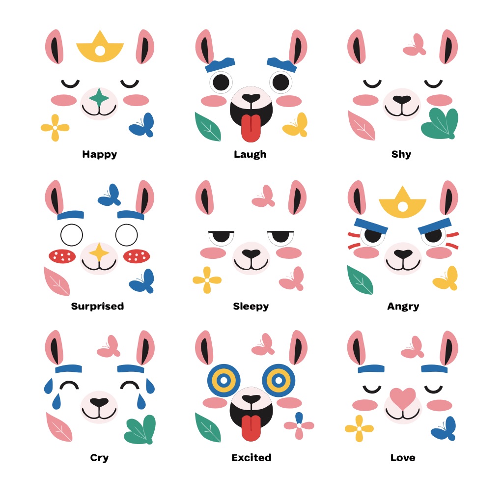 Flat vector emoji sheet of a llama face only, front view, close-up head portrait, no full body, no hands, no pose outside the face, pure 2D flat vector, no 3D, no realistic light, no depth, no texture, bold clean outlines, simple geometric shapes, minimal flat colors, 9-square grid layout, evenly spaced, same a llama with 9 clear facial expressions: happy, laugh, shy, surprised, sleepy, angry, cry, excited, love, tiny spring elements like flowers, leaves, petals, butterflies, very clean solid background, no clutter, playful casual game vector style, crisp SVG-like edges, centered square composition, 4K