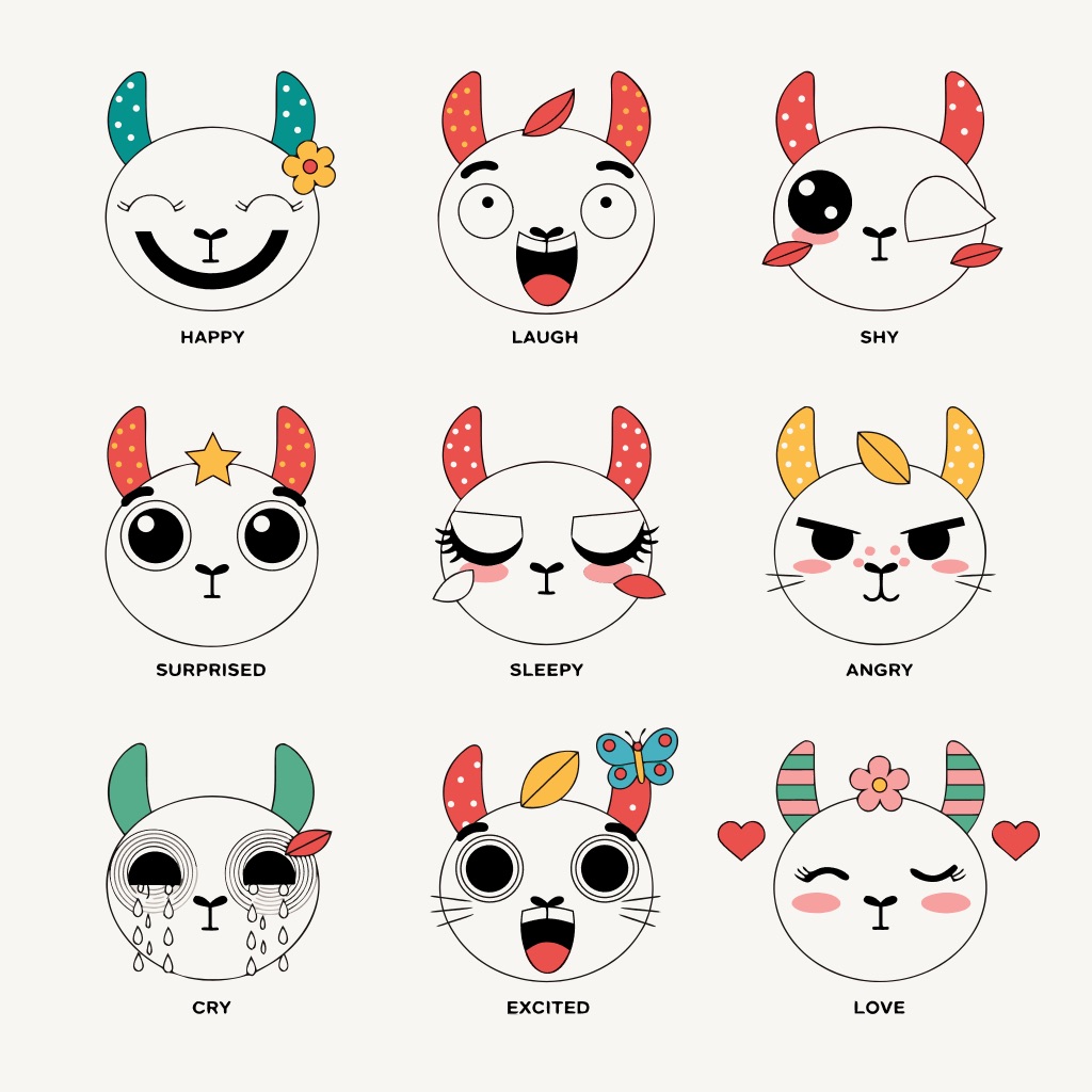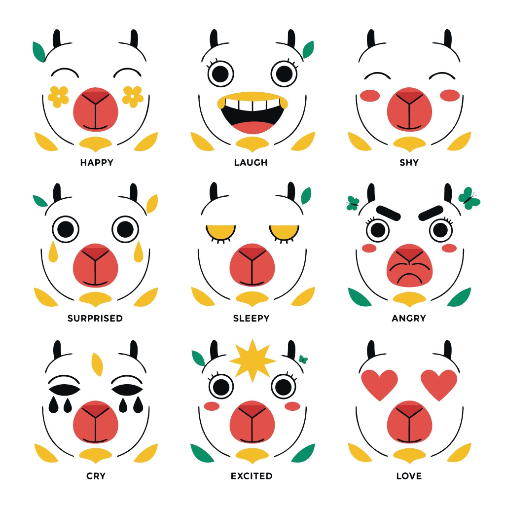 PROMPT: Flat vector emoji sheet of [subject] face only, front view, close-up head portrait, no full body, no hands, no pose outside the face, pure 2D flat vector, no 3D, no realistic light, no depth, no texture, bold clean outlines, simple geometric shapes, minimal flat colors, 9-square grid layout, evenly spaced, same [subject] with 9 clear facial expressions: happy, laugh, shy, surprised, sleepy, angry, cry, excited, love, tiny spring elements like flowers, leaves, petals, butterflies, very clean solid background, no clutter, playful casual game vector style, crisp SVG-like edges, centered square composition, 4K