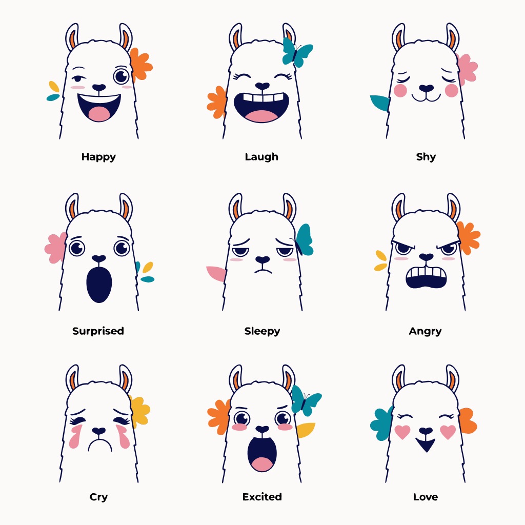 Flat vector emoji sheet of a llama face only, front view, close-up head portrait, no full body, no hands, no pose outside the face, pure 2D flat vector, no 3D, no realistic light, no depth, no texture, bold clean outlines, simple geometric shapes, minimal flat colors, 9-square grid layout, evenly spaced, same a llama with 9 clear facial expressions: happy, laugh, shy, surprised, sleepy, angry, cry, excited, love, tiny spring elements like flowers, leaves, petals, butterflies, very clean solid background, no clutter, playful casual game vector style, crisp SVG-like edges, centered square composition, 4K