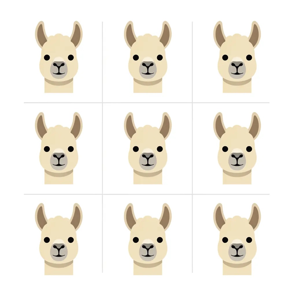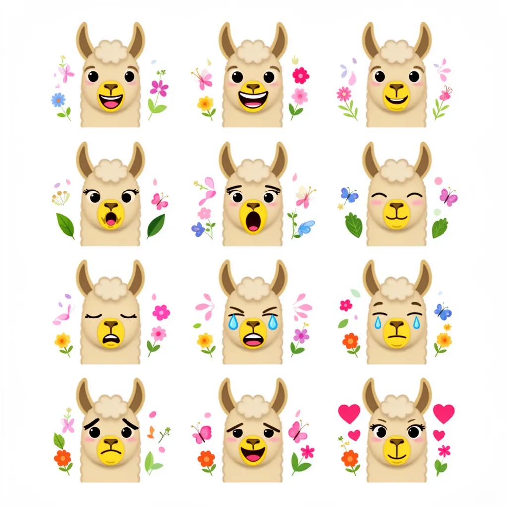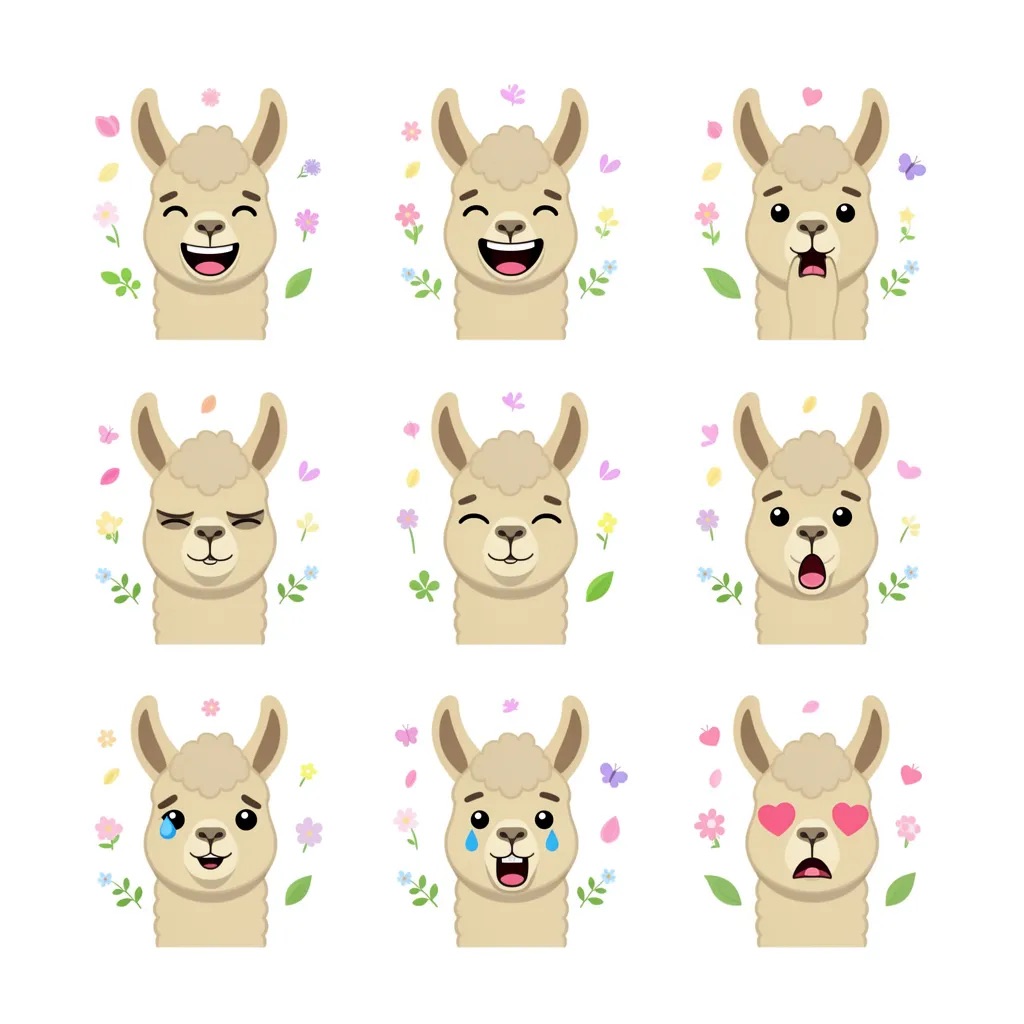 Flat vector emoji sheet of a llama face only, front view, close-up head portrait, no full body, no hands, no pose outside the face, pure 2D flat vector, no 3D, no realistic light, no depth, no texture, bold clean outlines, simple geometric shapes, minimal flat colors, 9-square grid layout, evenly spaced, same a llama with 9 clear facial expressions: happy, laugh, shy, surprised, sleepy, angry, cry, excited, love, tiny spring elements like flowers, leaves, petals, butterflies, very clean solid background, no clutter, playful casual game vector style, crisp SVG-like edges, centered square composition, 4K
