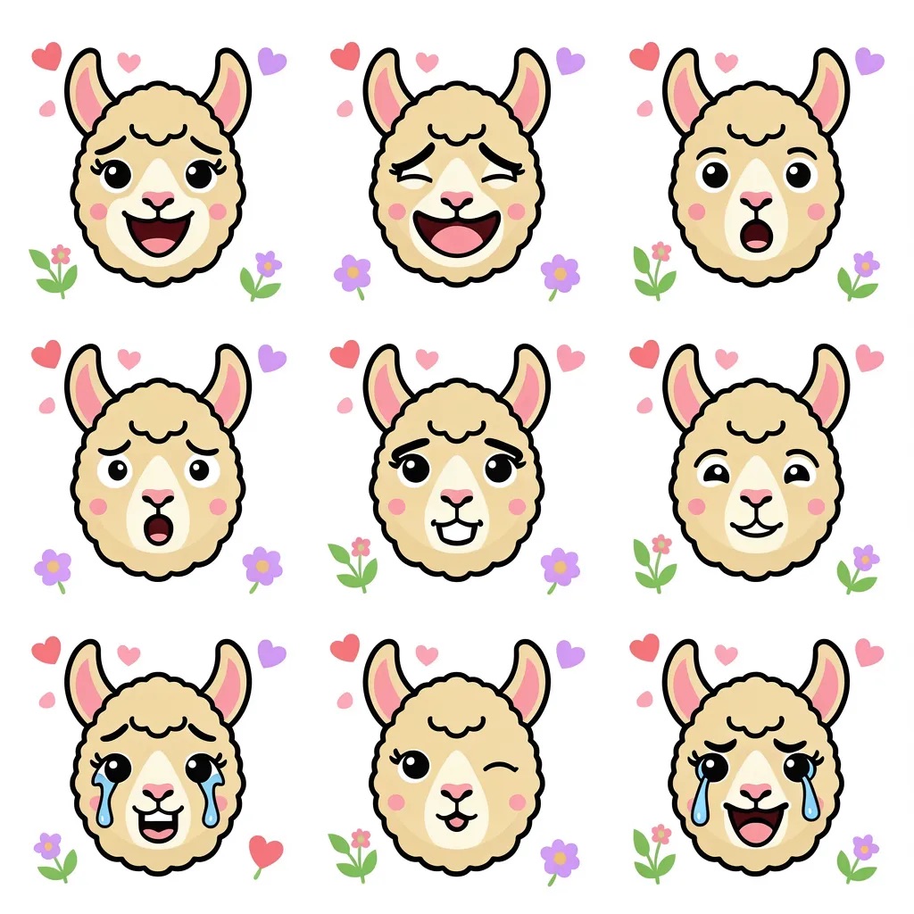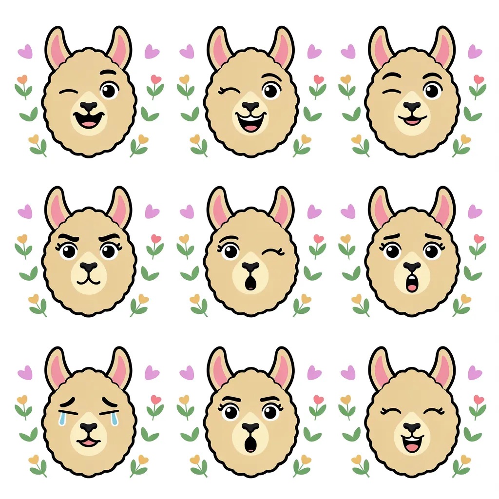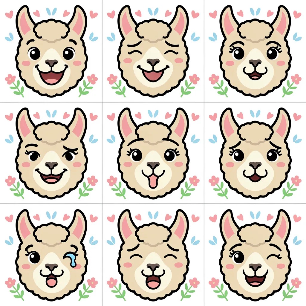 Flat vector emoji sheet of a llama face only, front view, close-up head portrait, no full body, no hands, no pose outside the face, pure 2D flat vector, no 3D, no realistic light, no depth, no texture, bold clean outlines, simple geometric shapes, minimal flat colors, 9-square grid layout, evenly spaced, same a llama with 9 clear facial expressions: happy, laugh, shy, surprised, sleepy, angry, cry, excited, love, tiny spring elements like flowers, leaves, petals, butterflies, very clean solid background, no clutter, playful casual game vector style, crisp SVG-like edges, centered square composition, 4K