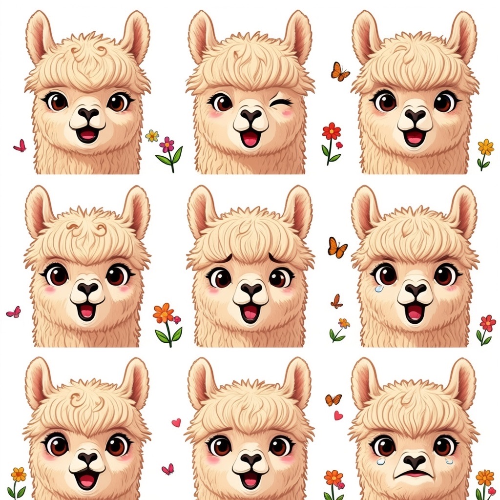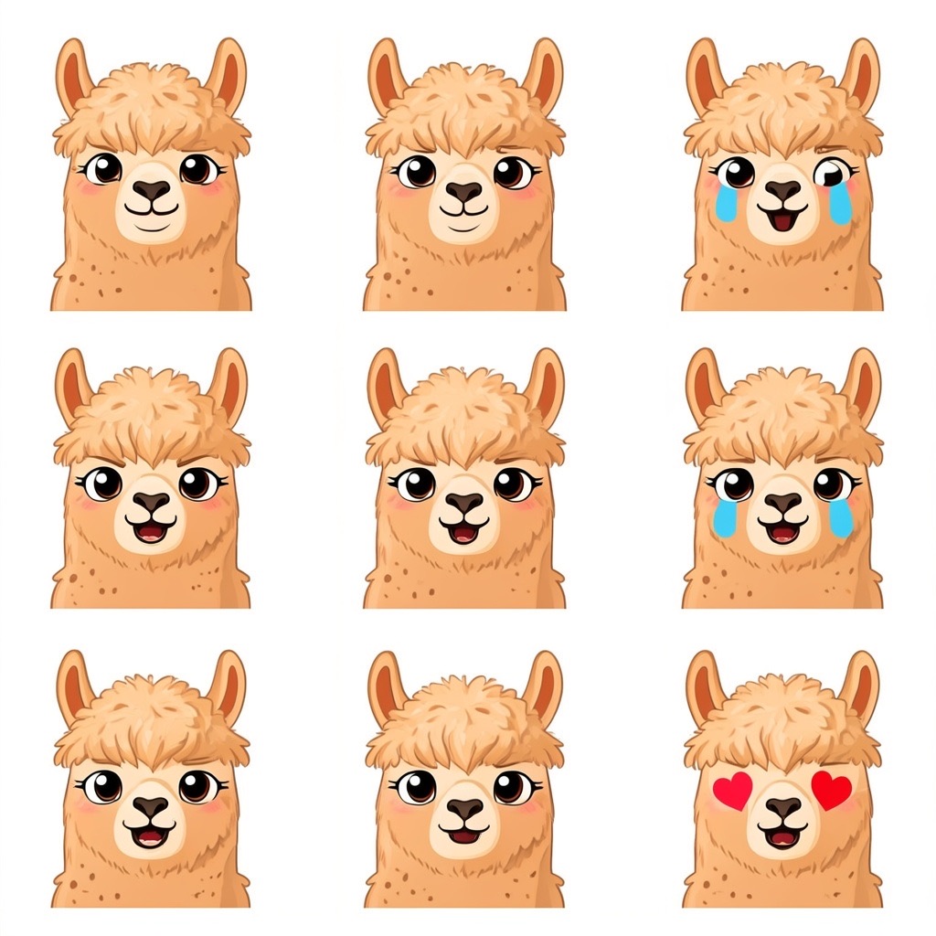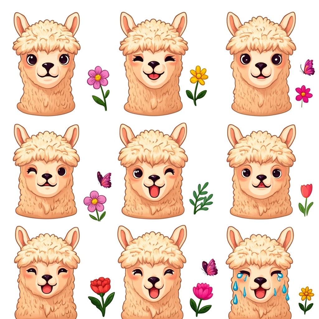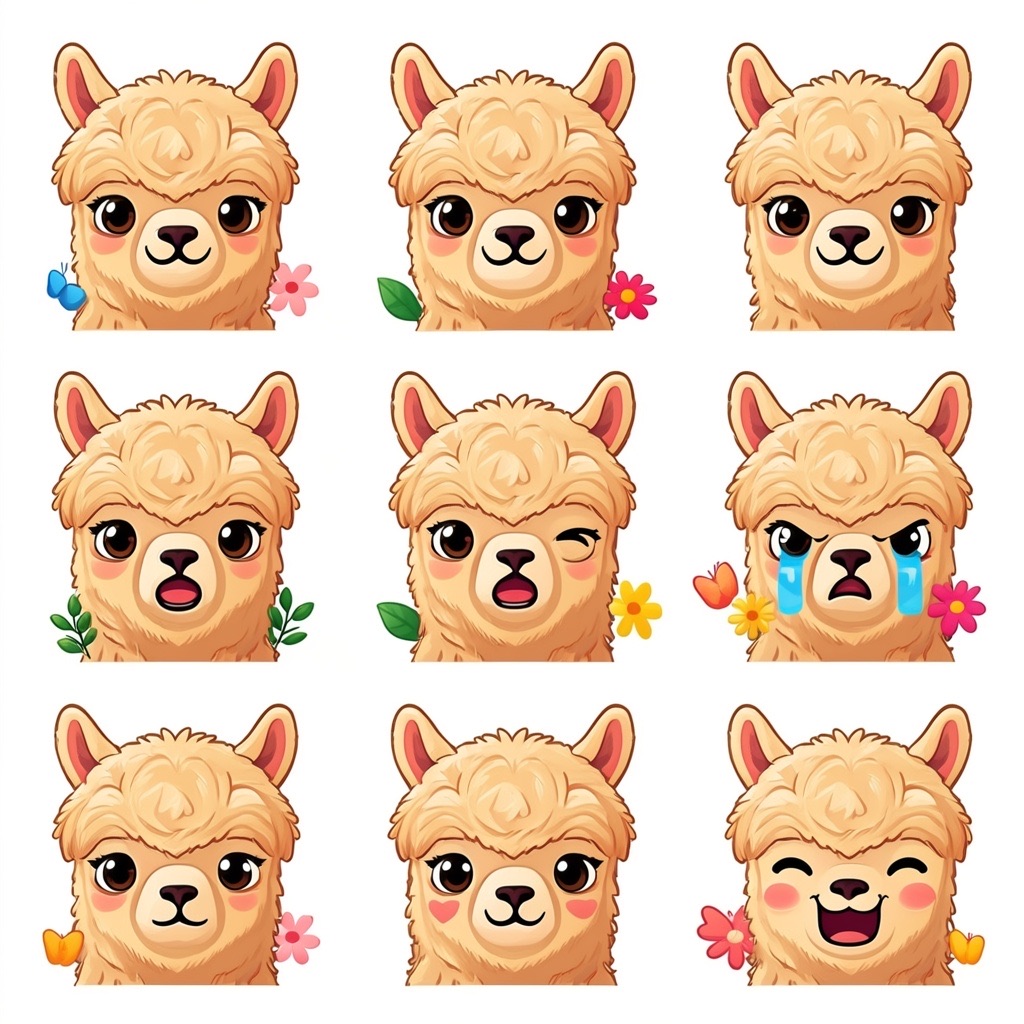 Flat vector emoji sheet of a llama face only, front view, close-up head portrait, no full body, no hands, no pose outside the face, pure 2D flat vector, no 3D, no realistic light, no depth, no texture, bold clean outlines, simple geometric shapes, minimal flat colors, 9-square grid layout, evenly spaced, same a llama with 9 clear facial expressions: happy, laugh, shy, surprised, sleepy, angry, cry, excited, love, tiny spring elements like flowers, leaves, petals, butterflies, very clean solid background, no clutter, playful casual game vector style, crisp SVG-like edges, centered square composition, 4K