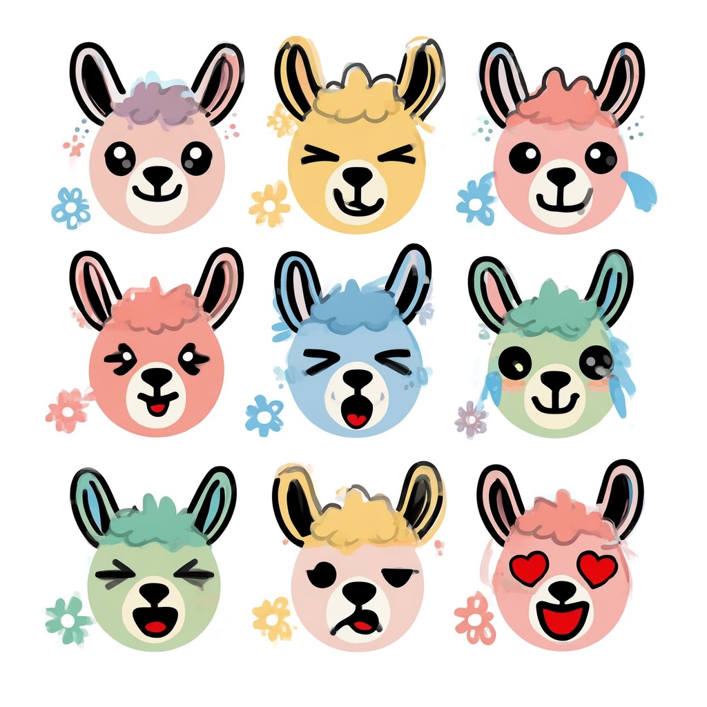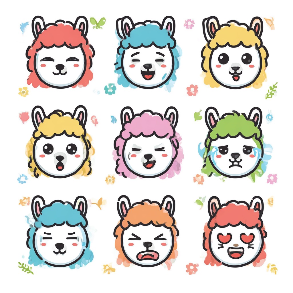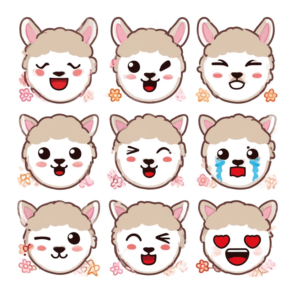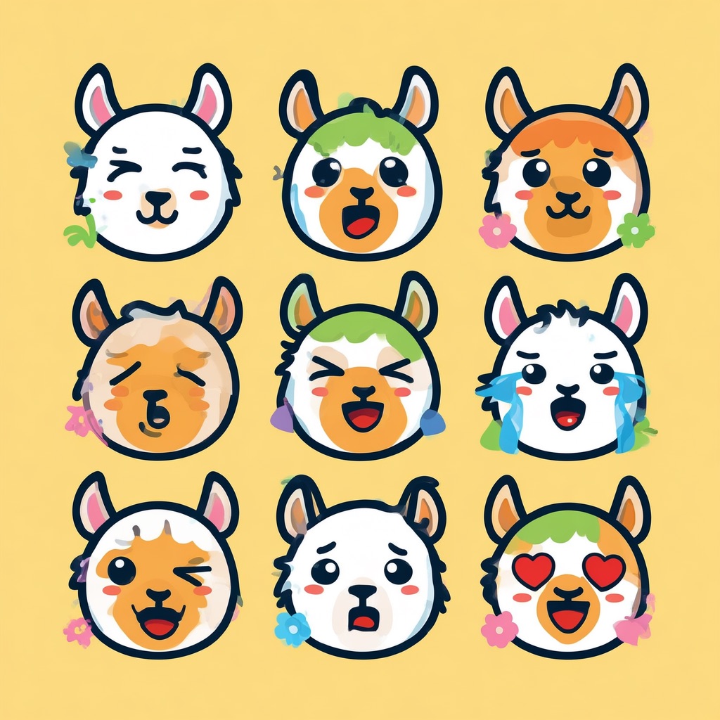 Flat vector emoji sheet of a llama face only, front view, close-up head portrait, no full body, no hands, no pose outside the face, pure 2D flat vector, no 3D, no realistic light, no depth, no texture, bold clean outlines, simple geometric shapes, minimal flat colors, 9-square grid layout, evenly spaced, same a llama with 9 clear facial expressions: happy, laugh, shy, surprised, sleepy, angry, cry, excited, love, tiny spring elements like flowers, leaves, petals, butterflies, very clean solid background, no clutter, playful casual game vector style, crisp SVG-like edges, centered square composition, 4K