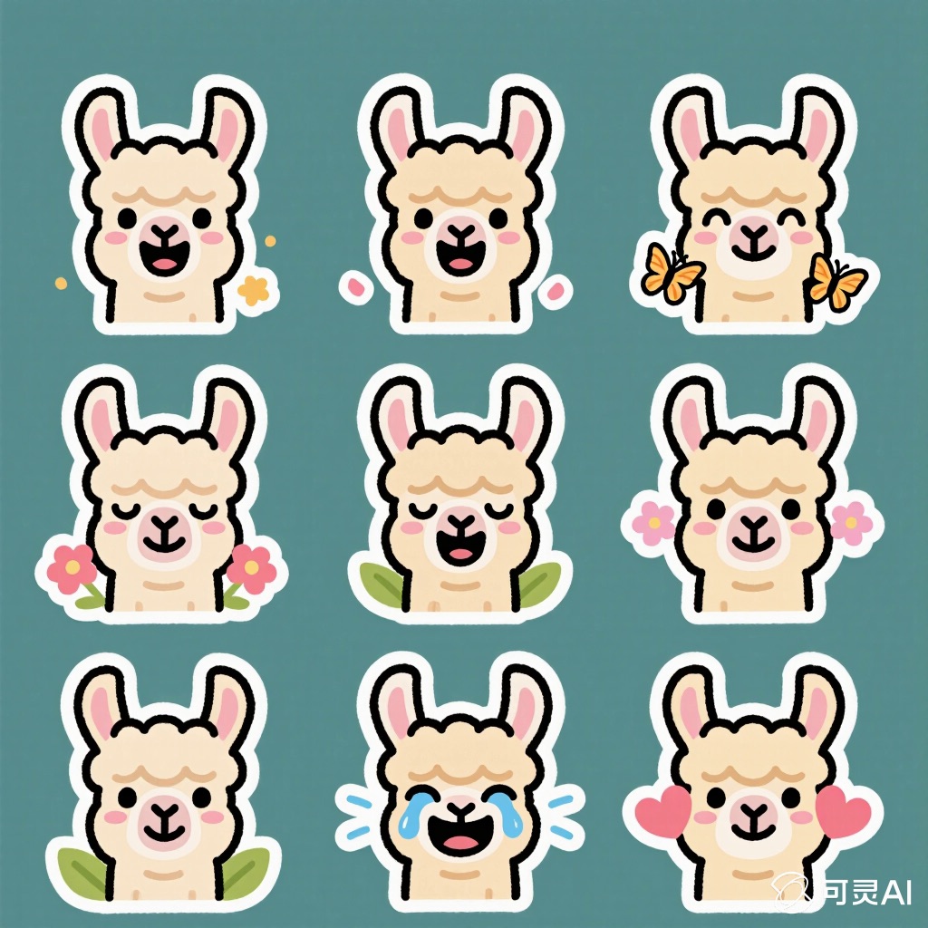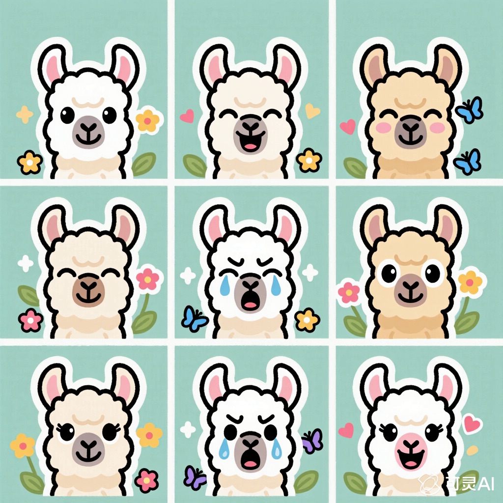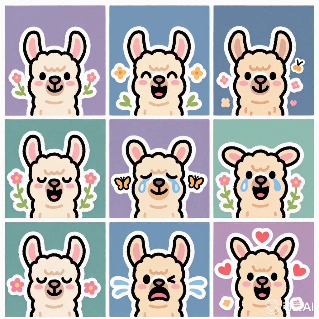 Flat vector emoji sheet of a llama face only, front view, close-up head portrait, no full body, no hands, no pose outside the face, pure 2D flat vector, no 3D, no realistic light, no depth, no texture, bold clean outlines, simple geometric shapes, minimal flat colors, 9-square grid layout, evenly spaced, same a llama with 9 clear facial expressions: happy, laugh, shy, surprised, sleepy, angry, cry, excited, love, tiny spring elements like flowers, leaves, petals, butterflies, very clean solid background, no clutter, playful casual game vector style, crisp SVG-like edges, centered square composition, 4K