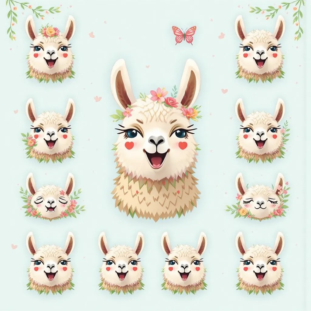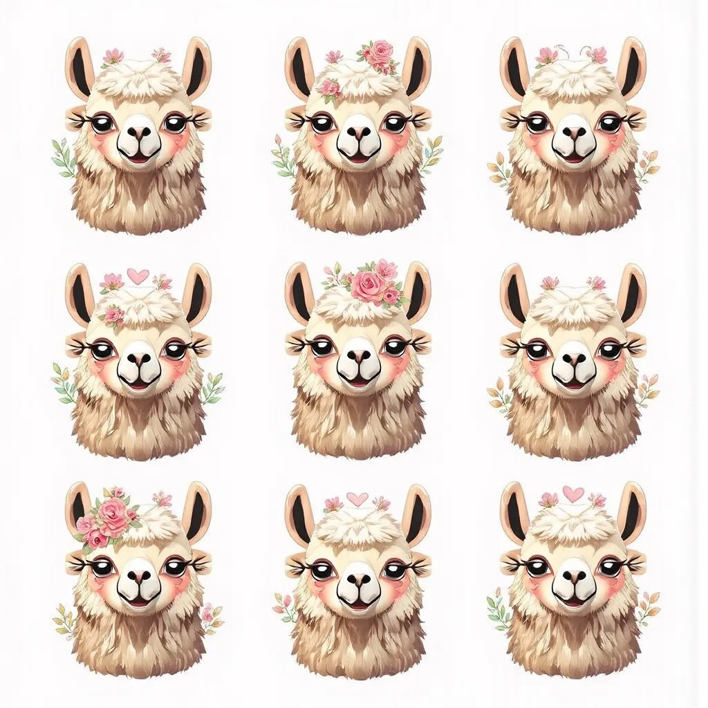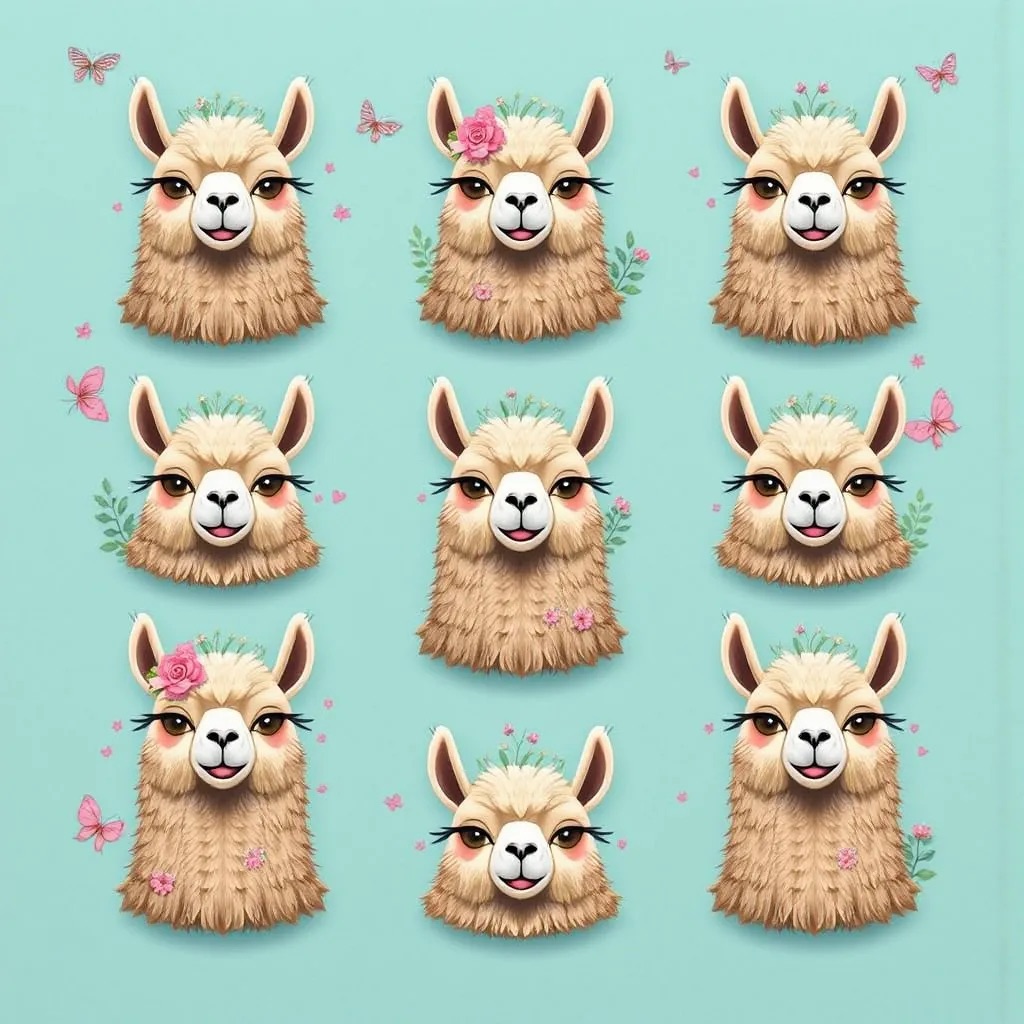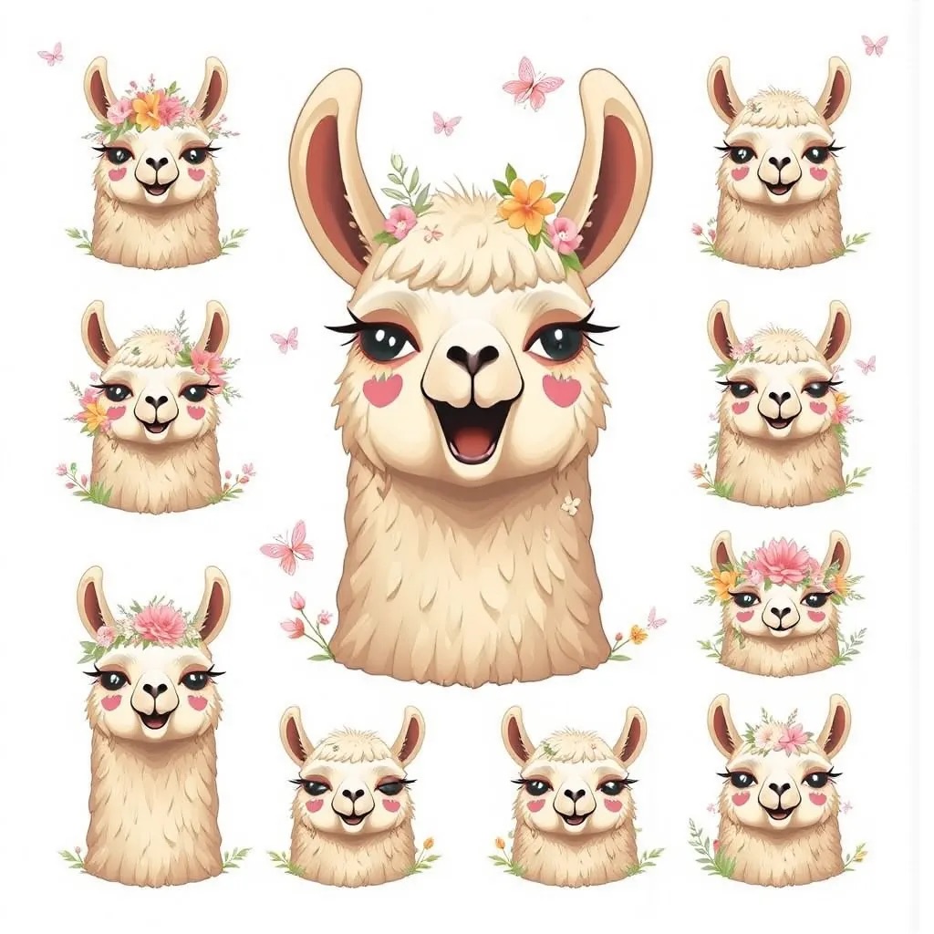 Flat vector emoji sheet of a llama face only, front view, close-up head portrait, no full body, no hands, no pose outside the face, pure 2D flat vector, no 3D, no realistic light, no depth, no texture, bold clean outlines, simple geometric shapes, minimal flat colors, 9-square grid layout, evenly spaced, same a llama with 9 clear facial expressions: happy, laugh, shy, surprised, sleepy, angry, cry, excited, love, tiny spring elements like flowers, leaves, petals, butterflies, very clean solid background, no clutter, playful casual game vector style, crisp SVG-like edges, centered square composition, 4K