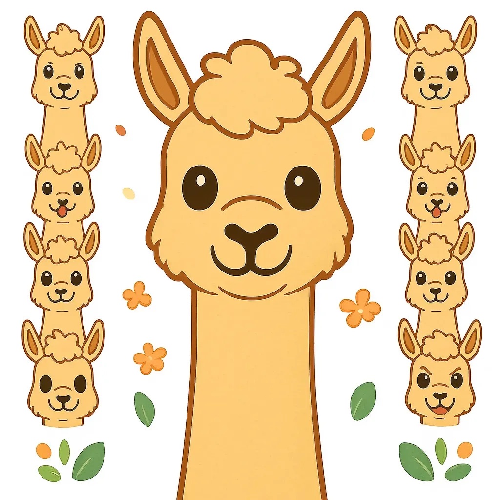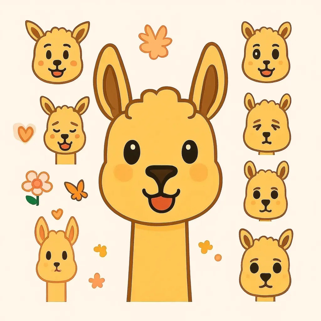 Flat vector emoji sheet of a llama face only, front view, close-up head portrait, no full body, no hands, no pose outside the face, pure 2D flat vector, no 3D, no realistic light, no depth, no texture, bold clean outlines, simple geometric shapes, minimal flat colors, 9-square grid layout, evenly spaced, same a llama with 9 clear facial expressions: happy, laugh, shy, surprised, sleepy, angry, cry, excited, love, tiny spring elements like flowers, leaves, petals, butterflies, very clean solid background, no clutter, playful casual game vector style, crisp SVG-like edges, centered square composition, 4K