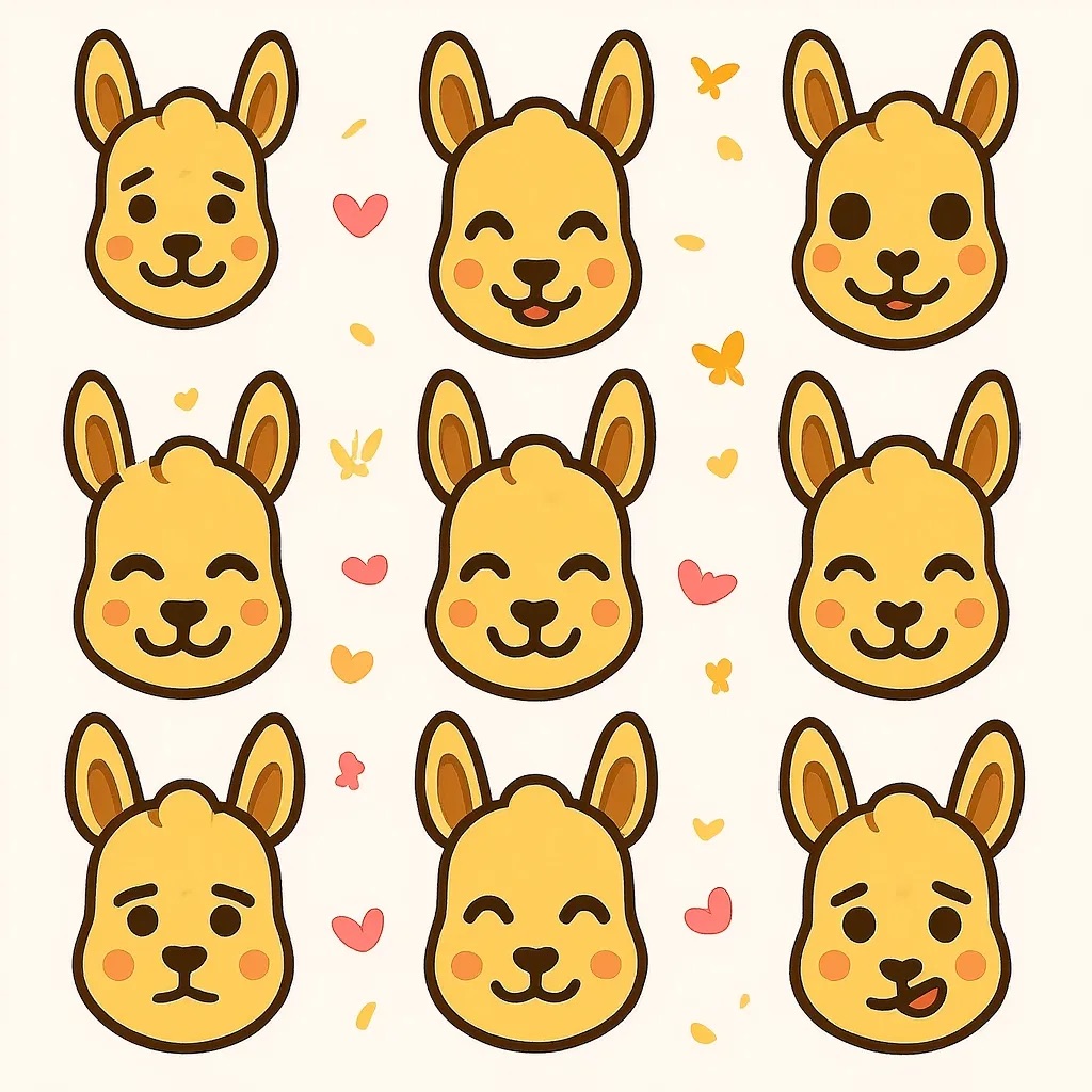 PROMPT: Flat vector emoji sheet of [subject] face only, front view, close-up head portrait, no full body, no hands, no pose outside the face, pure 2D flat vector, no 3D, no realistic light, no depth, no texture, bold clean outlines, simple geometric shapes, minimal flat colors, 9-square grid layout, evenly spaced, same [subject] with 9 clear facial expressions: happy, laugh, shy, surprised, sleepy, angry, cry, excited, love, tiny spring elements like flowers, leaves, petals, butterflies, very clean solid background, no clutter, playful casual game vector style, crisp SVG-like edges, centered square composition, 4K