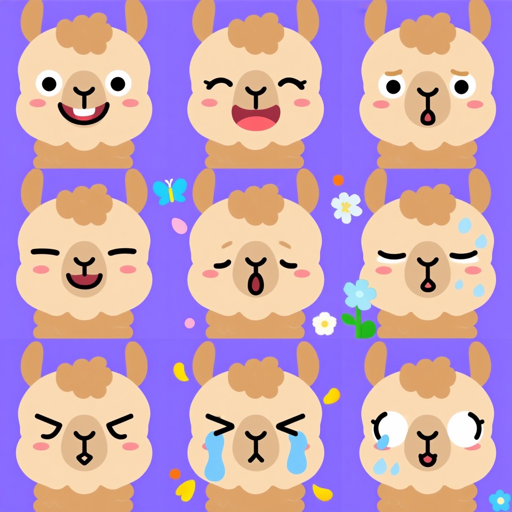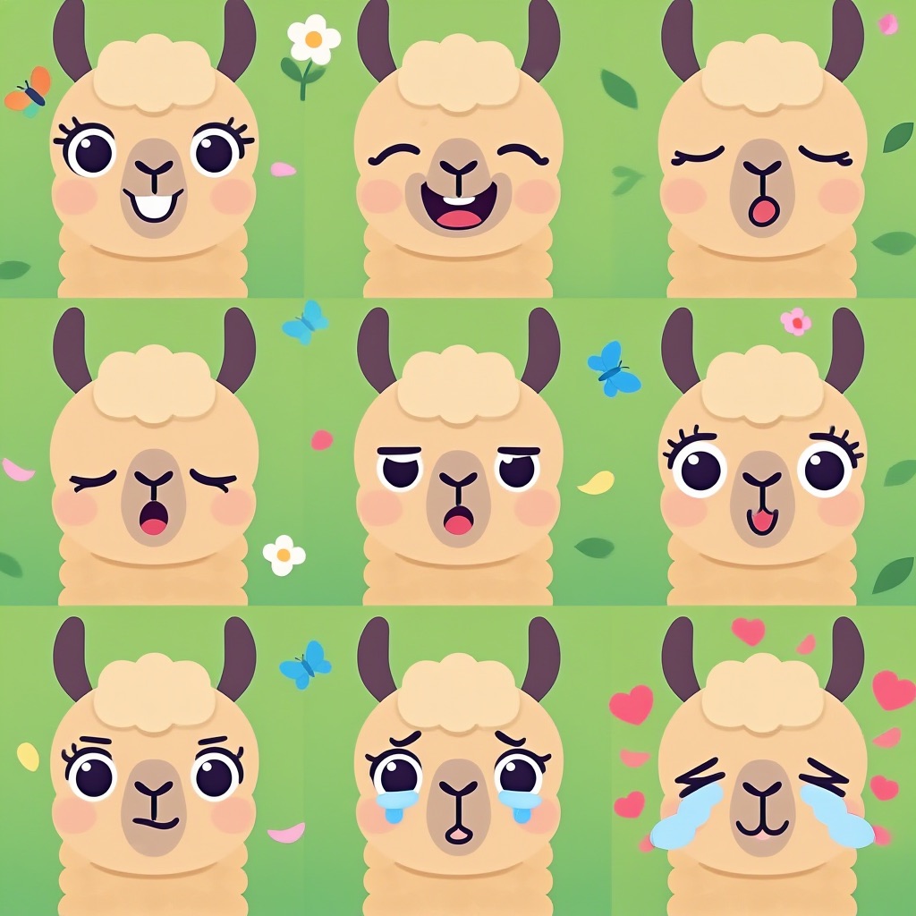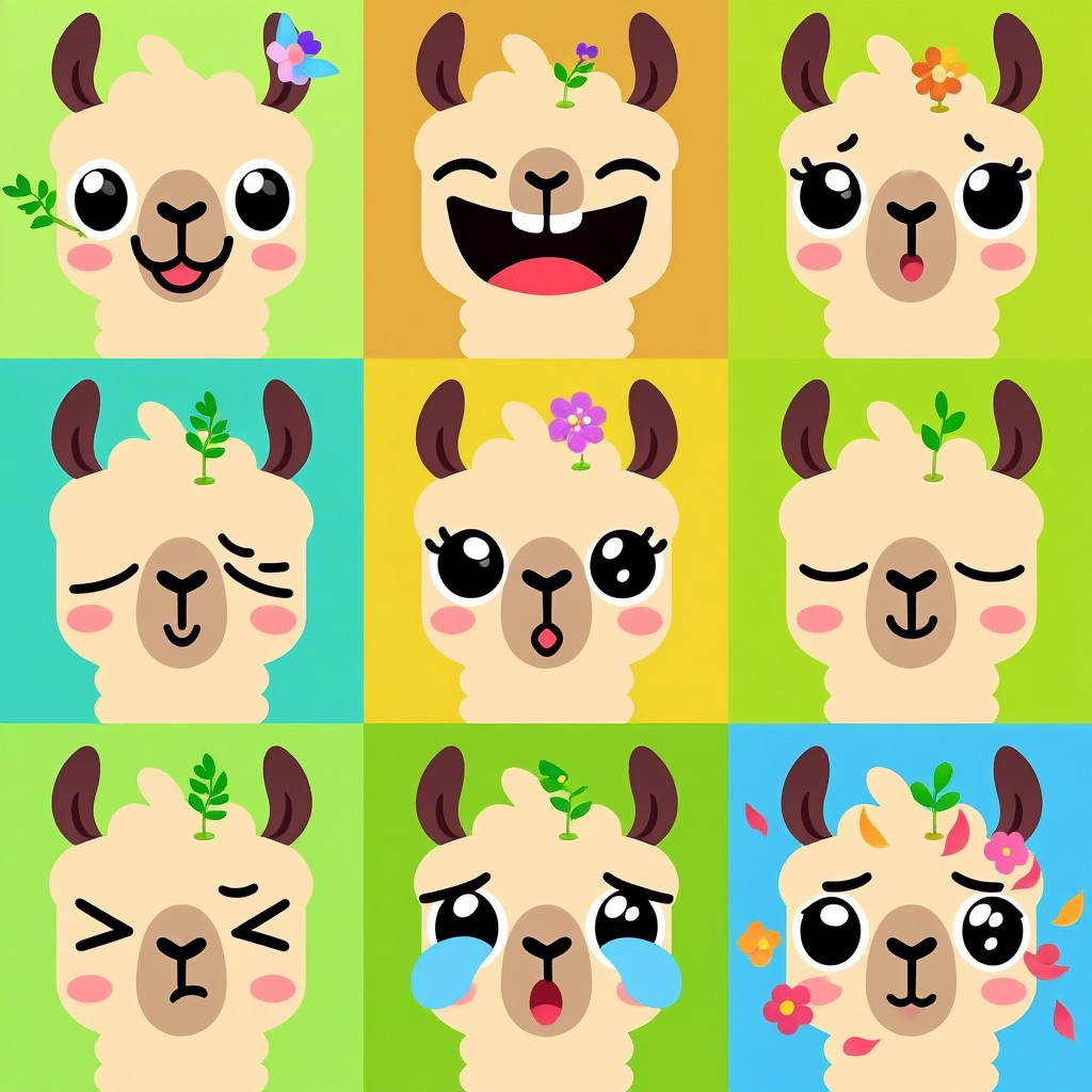 Flat vector emoji sheet of a llama face only, front view, close-up head portrait, no full body, no hands, no pose outside the face, pure 2D flat vector, no 3D, no realistic light, no depth, no texture, bold clean outlines, simple geometric shapes, minimal flat colors, 9-square grid layout, evenly spaced, same a llama with 9 clear facial expressions: happy, laugh, shy, surprised, sleepy, angry, cry, excited, love, tiny spring elements like flowers, leaves, petals, butterflies, very clean solid background, no clutter, playful casual game vector style, crisp SVG-like edges, centered square composition, 4K