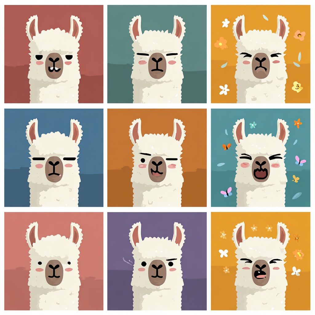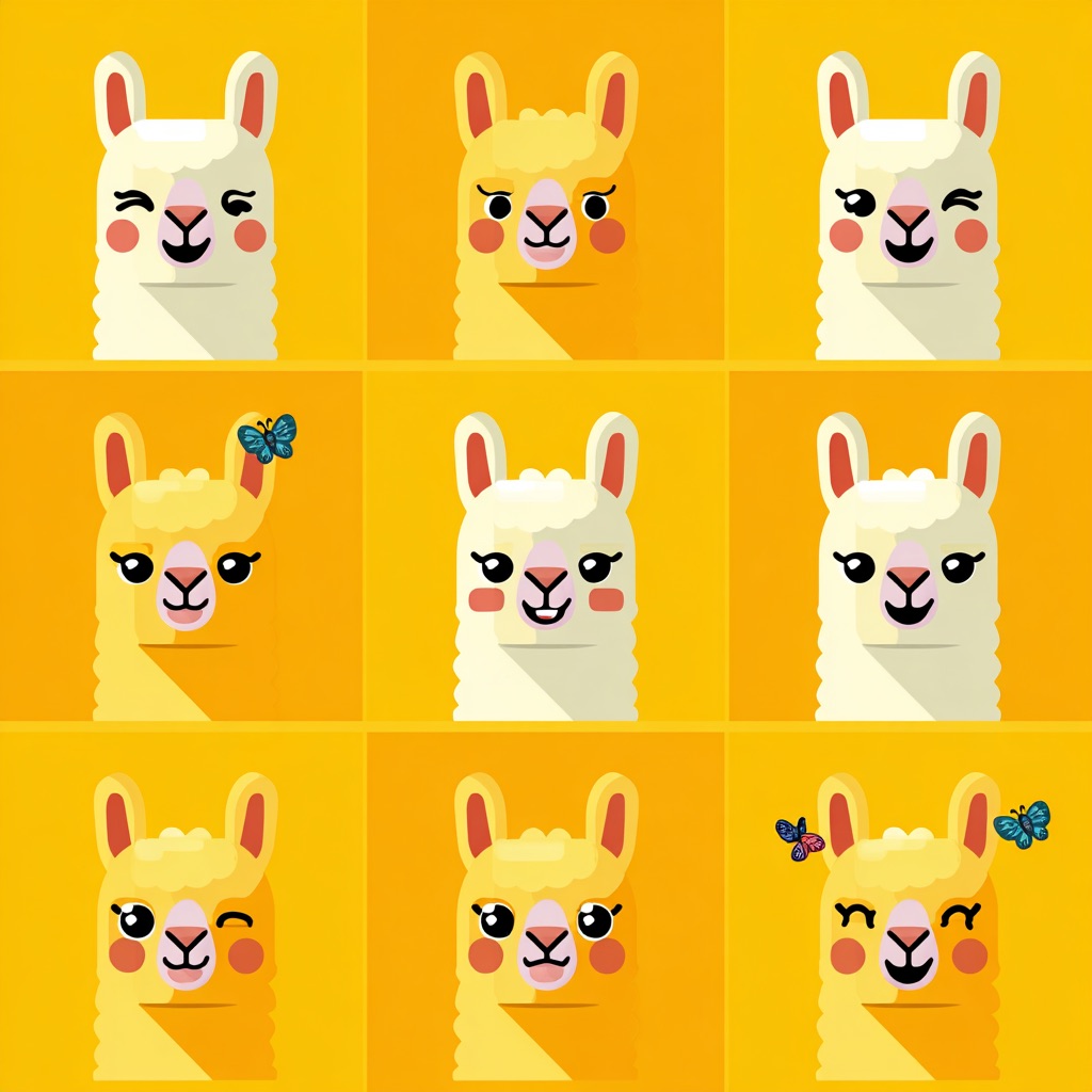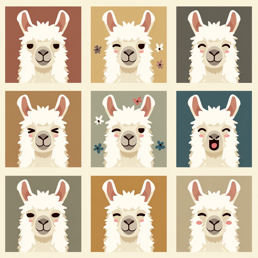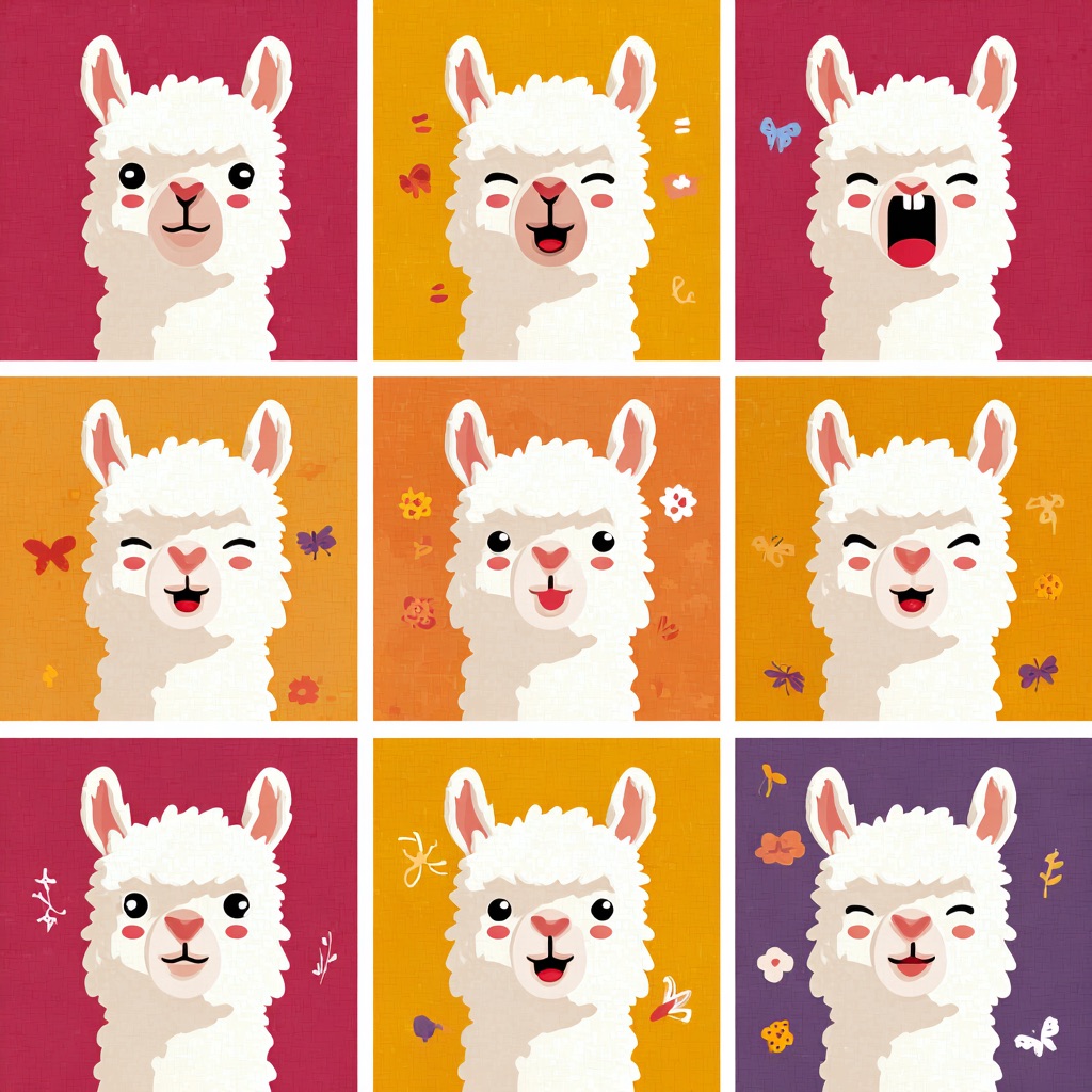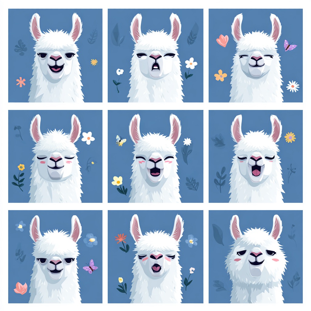 Flat vector emoji sheet of a llama face only, front view, close-up head portrait, no full body, no hands, no pose outside the face, pure 2D flat vector, no 3D, no realistic light, no depth, no texture, bold clean outlines, simple geometric shapes, minimal flat colors, 9-square grid layout, evenly spaced, same a llama with 9 clear facial expressions: happy, laugh, shy, surprised, sleepy, angry, cry, excited, love, tiny spring elements like flowers, leaves, petals, butterflies, very clean solid background, no clutter, playful casual game vector style, crisp SVG-like edges, centered square composition, 4K