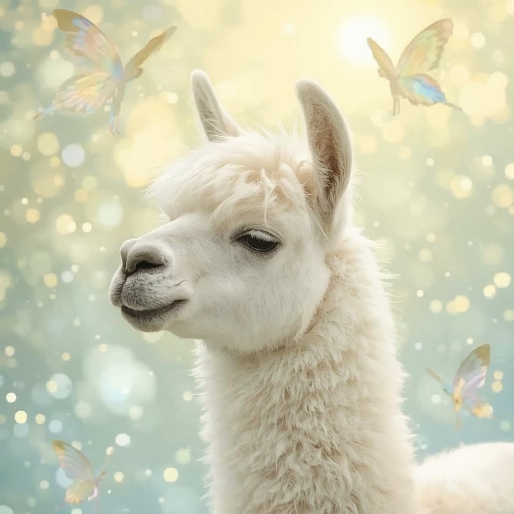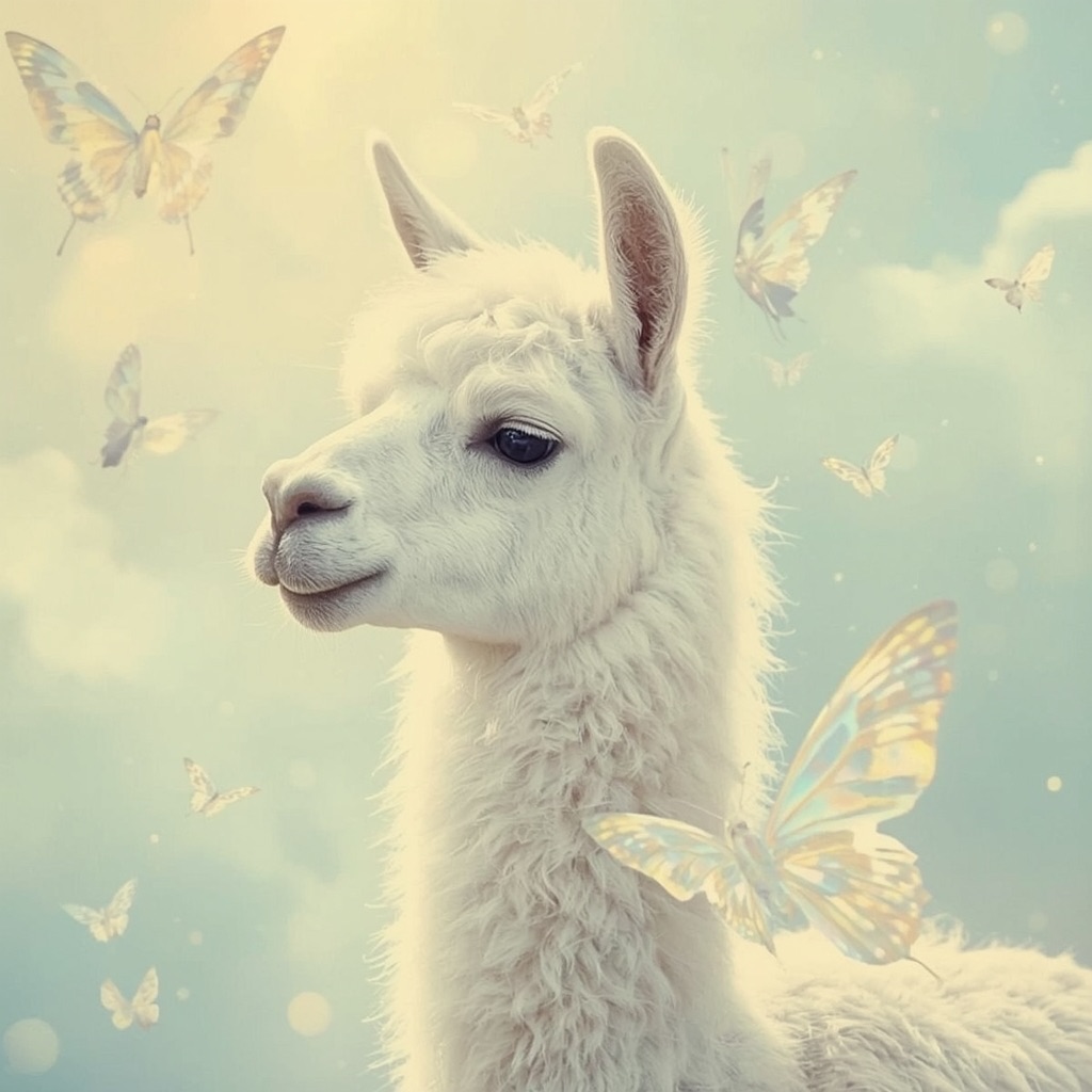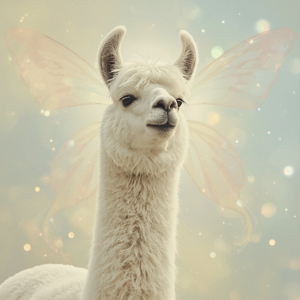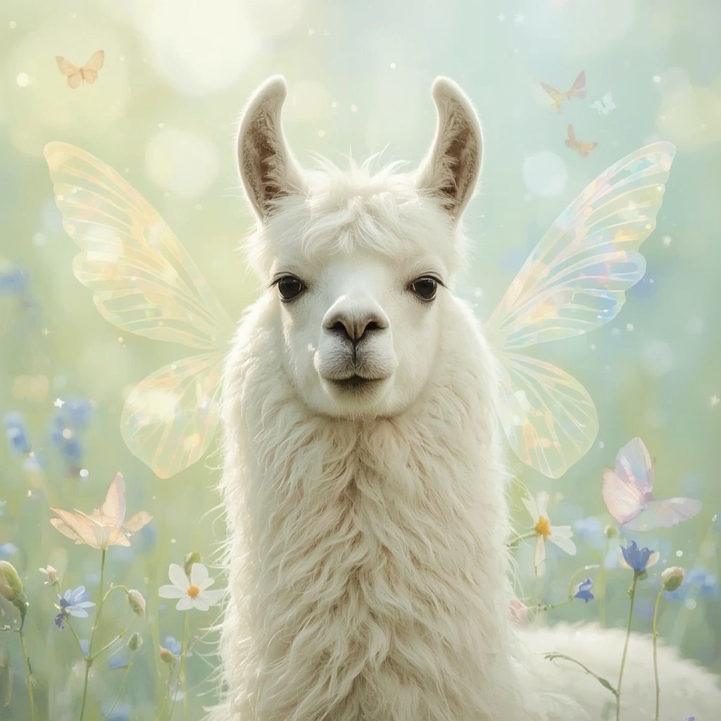 a white llama depicted in a Dreamy Dawn Fairy Realm, where delicate, iridescent wings, and soft, pastel hues evoke a sense of gentle wonder and magic. Use a color palette of soft, shimmering yellow and blue to capture the essence of the fairy realm.