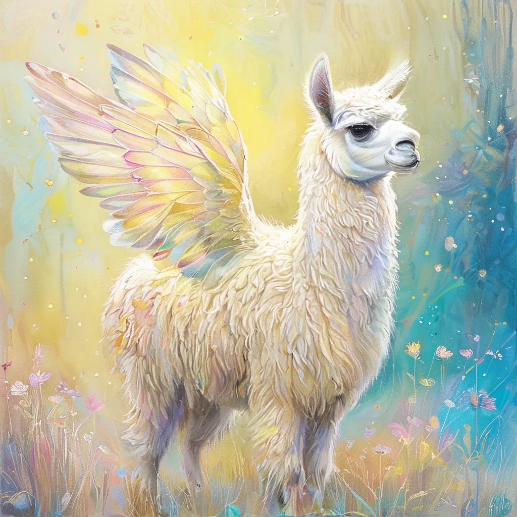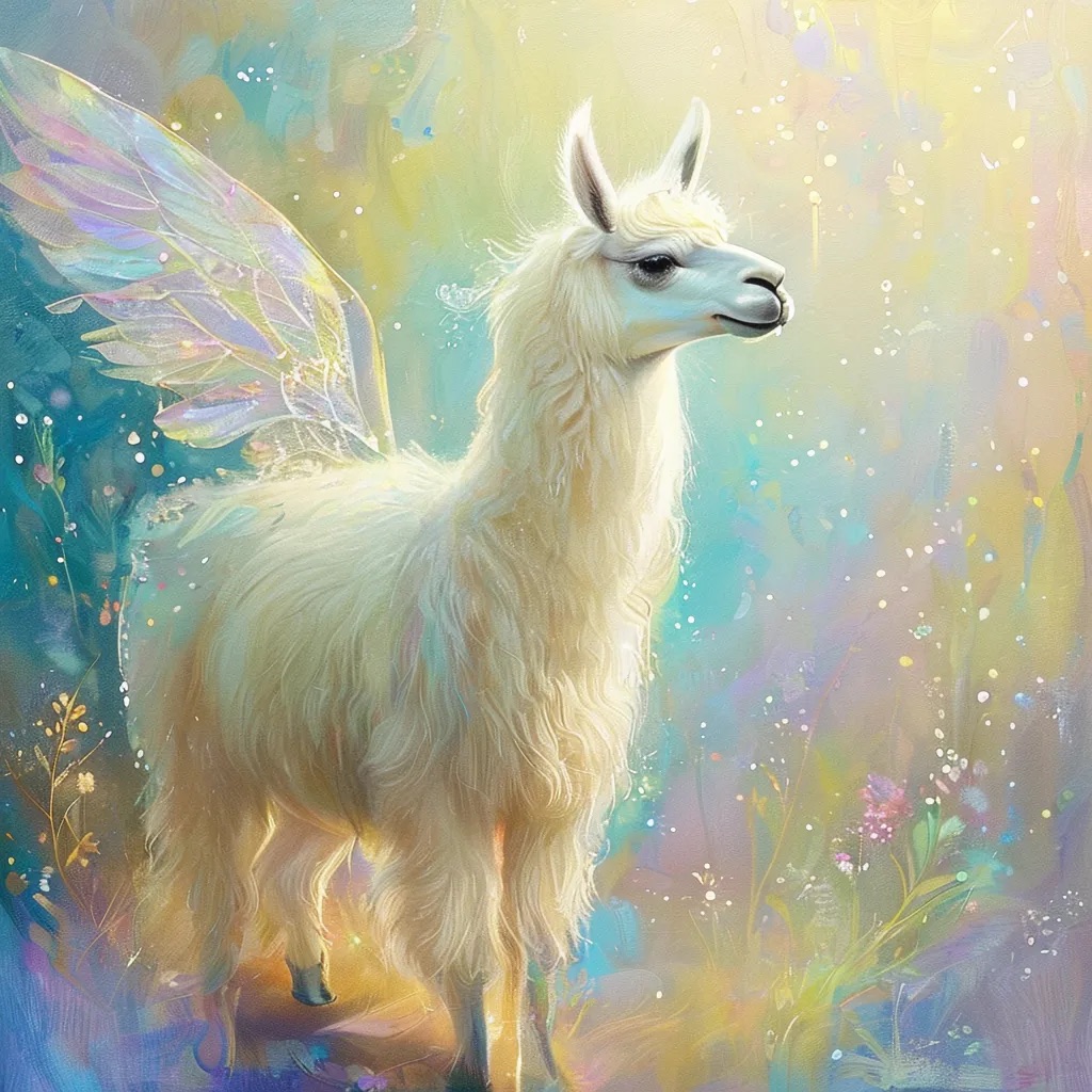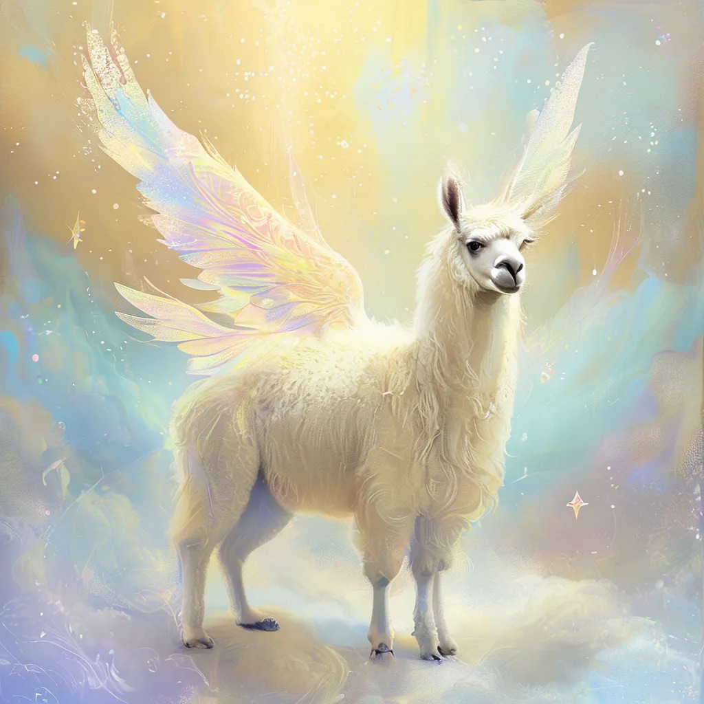 a white llama depicted in a Dreamy Dawn Fairy Realm, where delicate, iridescent wings, and soft, pastel hues evoke a sense of gentle wonder and magic. Use a color palette of soft, shimmering yellow and blue to capture the essence of the fairy realm.