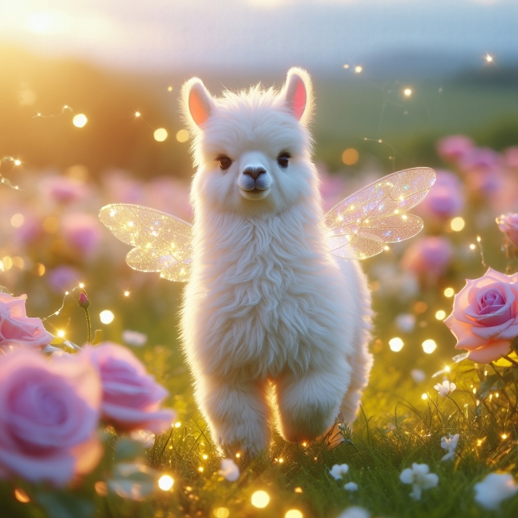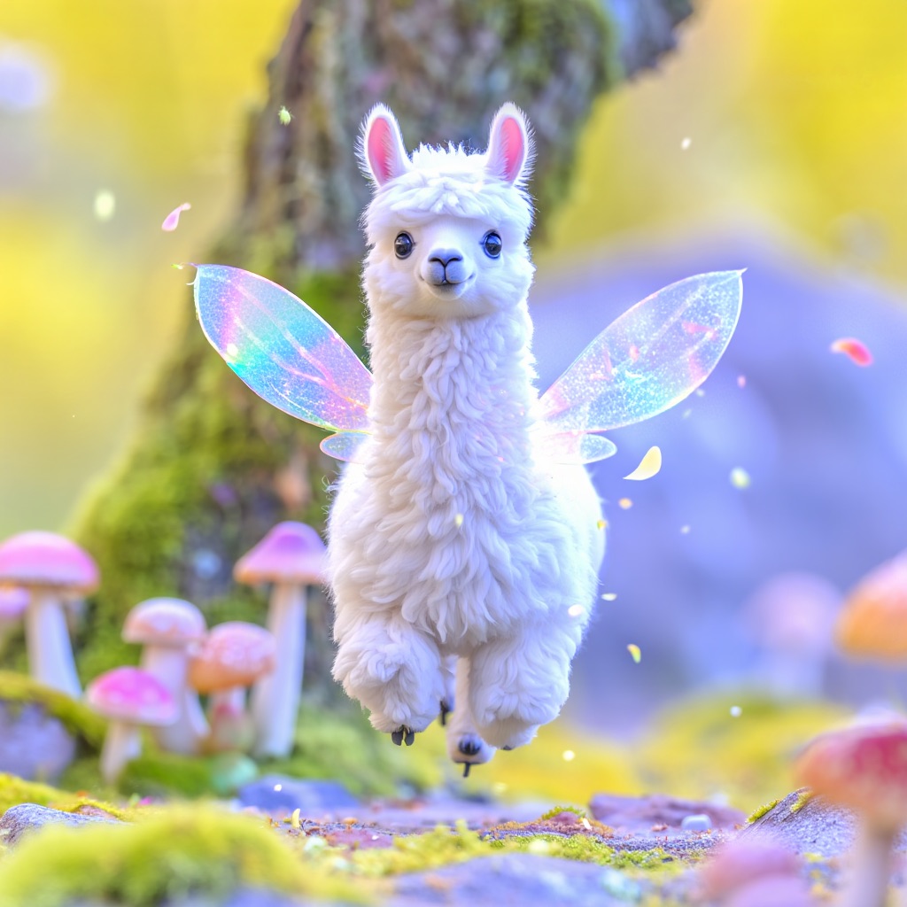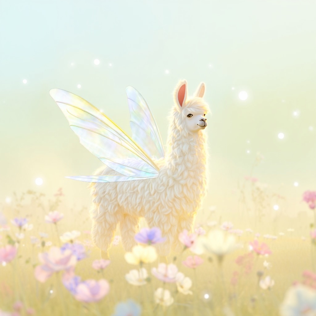a white llama depicted in a Dreamy Dawn Fairy Realm, where delicate, iridescent wings, and soft, pastel hues evoke a sense of gentle wonder and magic. Use a color palette of soft, shimmering yellow and blue to capture the essence of the fairy realm.