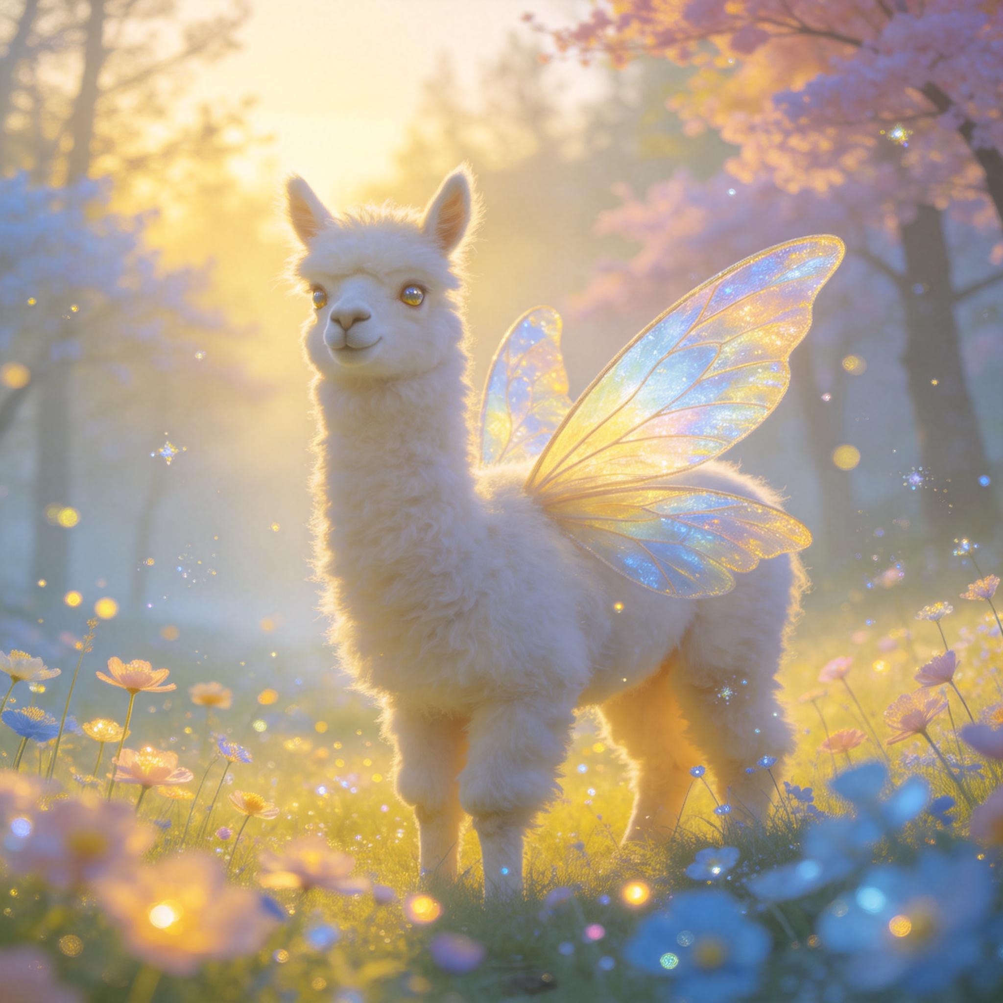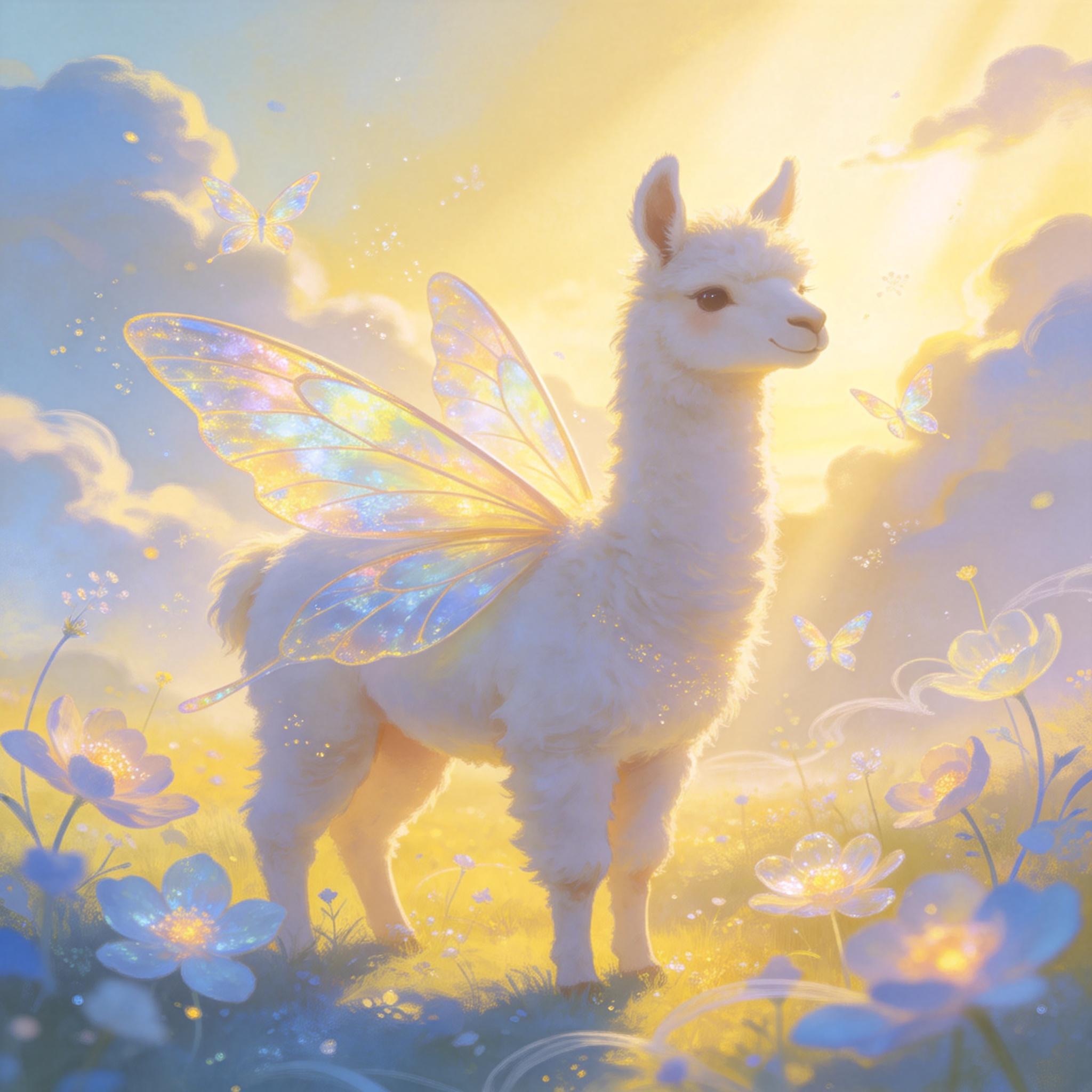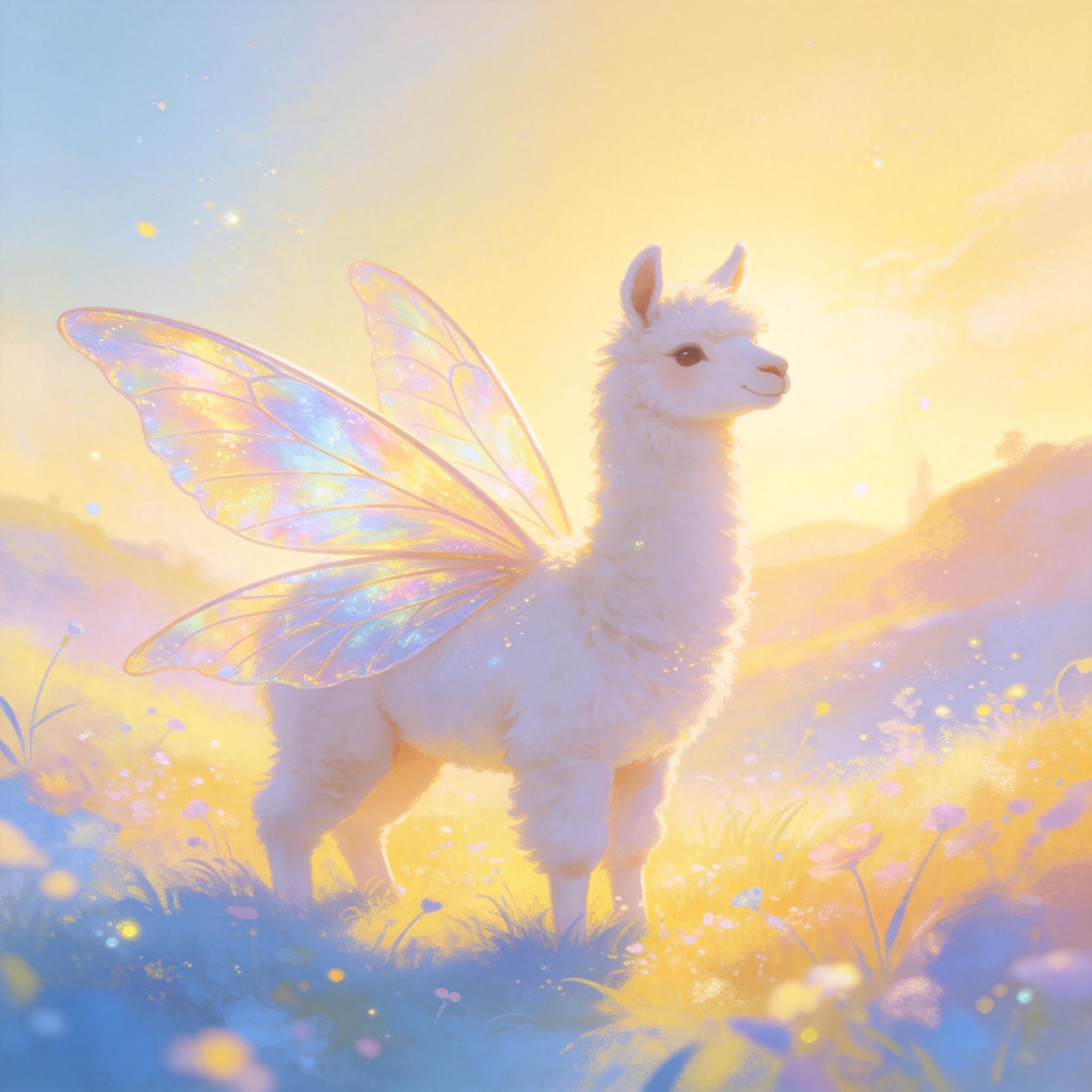 a white llama depicted in a Dreamy Dawn Fairy Realm, where delicate, iridescent wings, and soft, pastel hues evoke a sense of gentle wonder and magic. Use a color palette of soft, shimmering yellow and blue to capture the essence of the fairy realm.