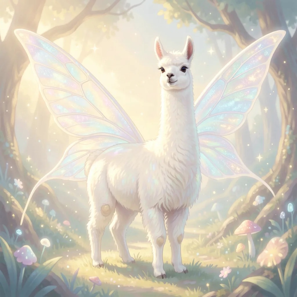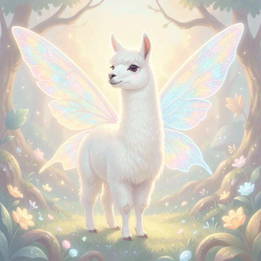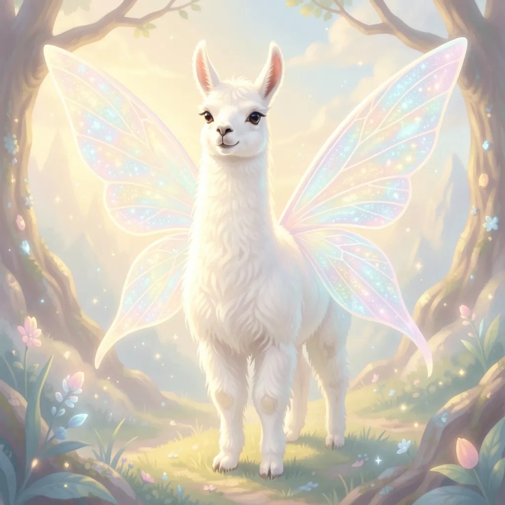 a white llama depicted in a Dreamy Dawn Fairy Realm, where delicate, iridescent wings, and soft, pastel hues evoke a sense of gentle wonder and magic. Use a color palette of soft, shimmering yellow and blue to capture the essence of the fairy realm.