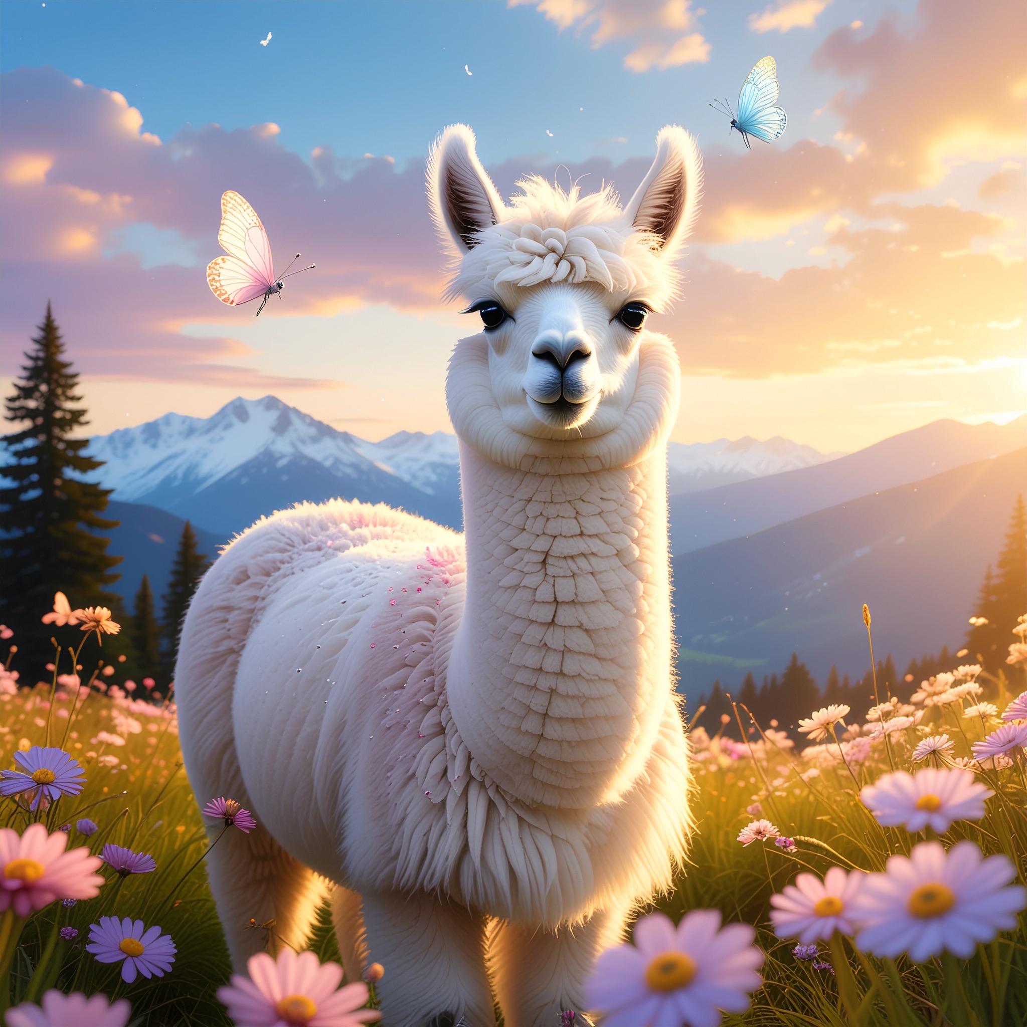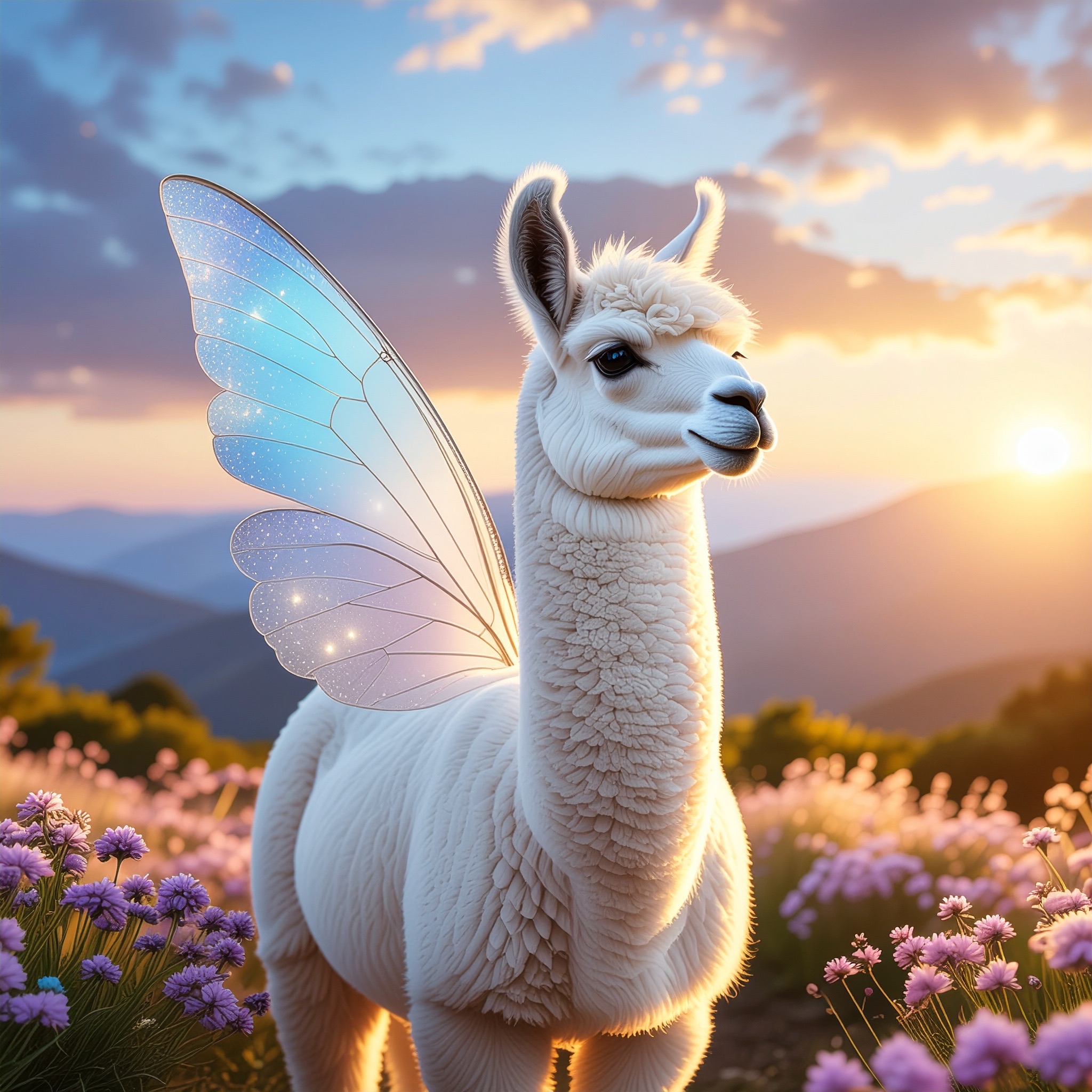 a white llama depicted in a Dreamy Dawn Fairy Realm, where delicate, iridescent wings, and soft, pastel hues evoke a sense of gentle wonder and magic. Use a color palette of soft, shimmering yellow and blue to capture the essence of the fairy realm.