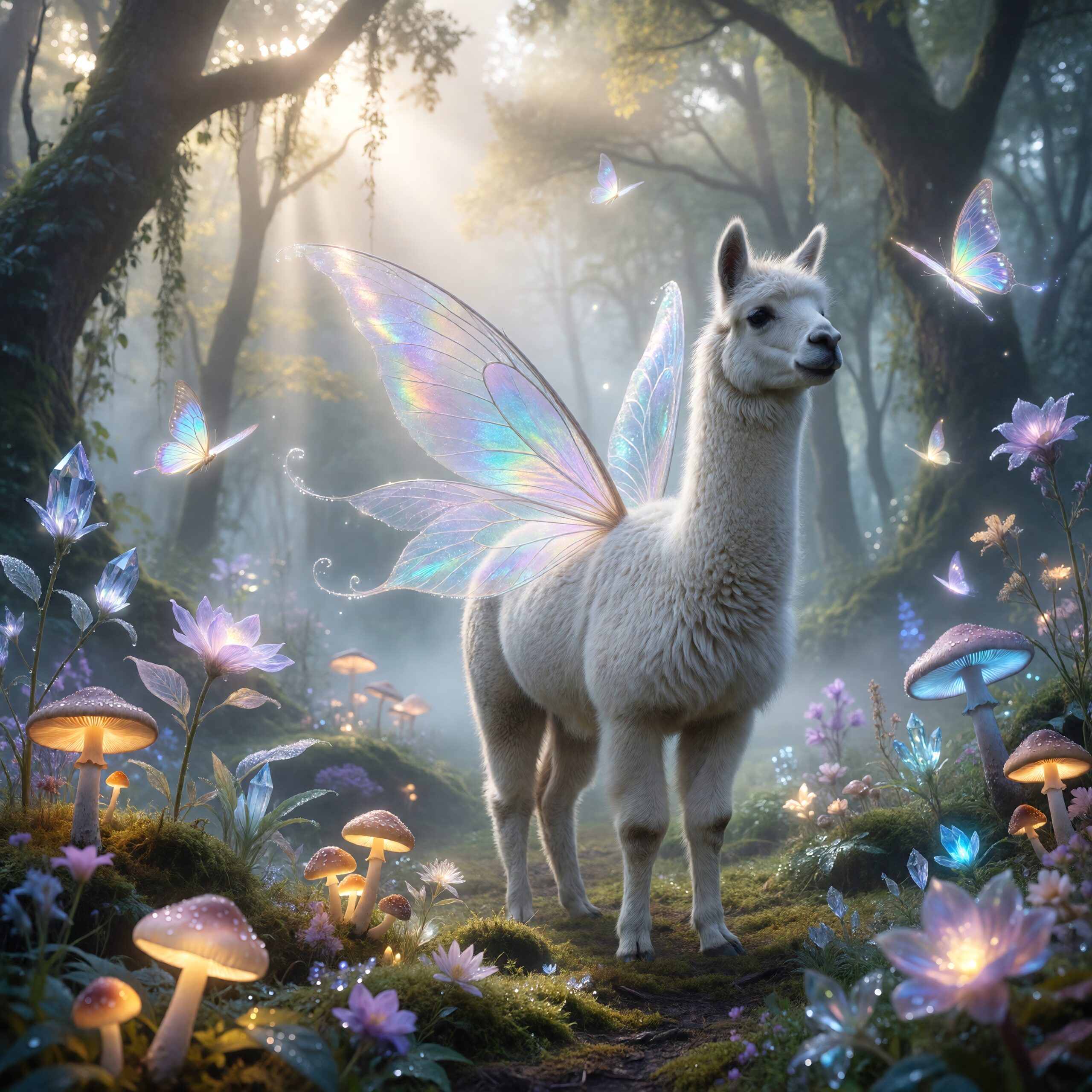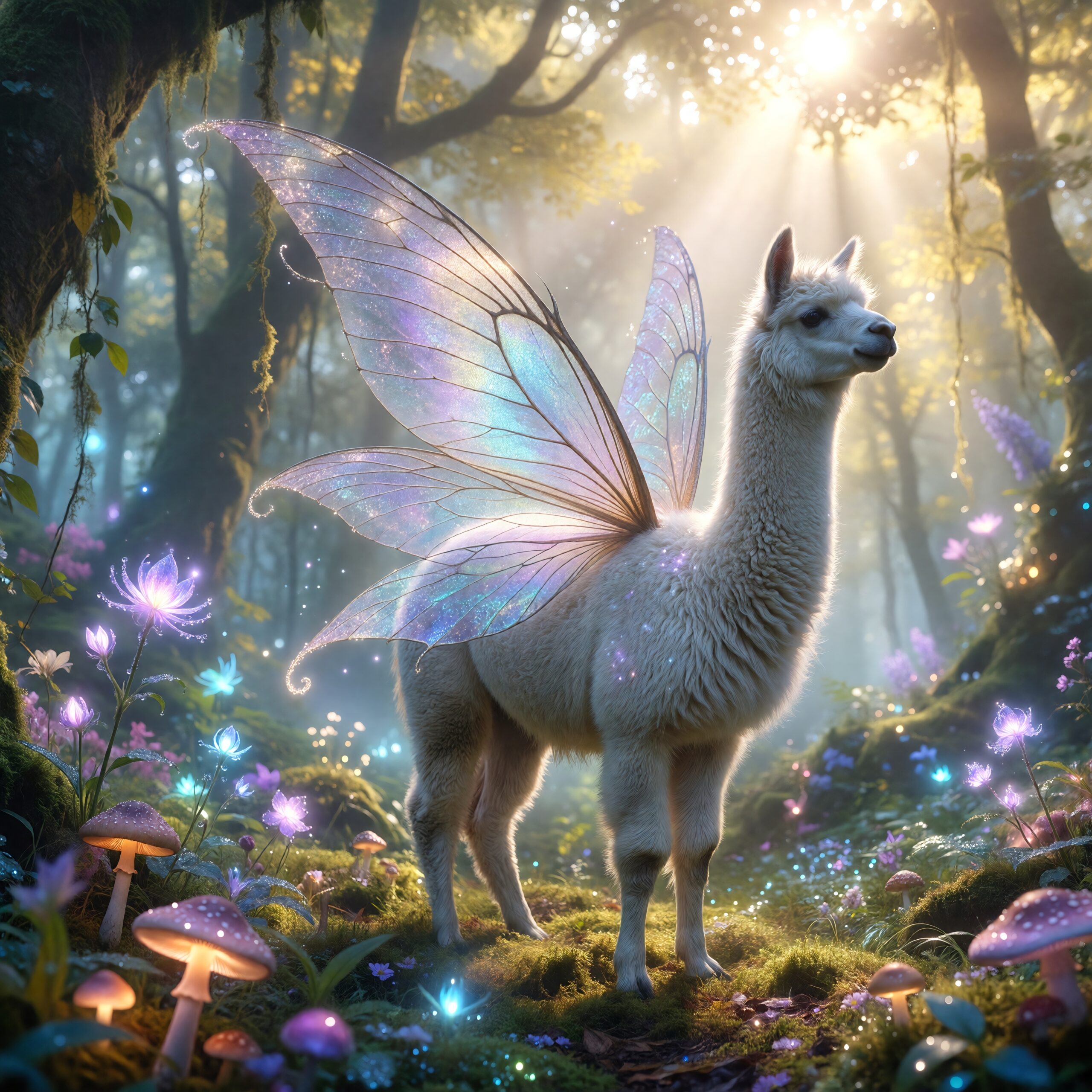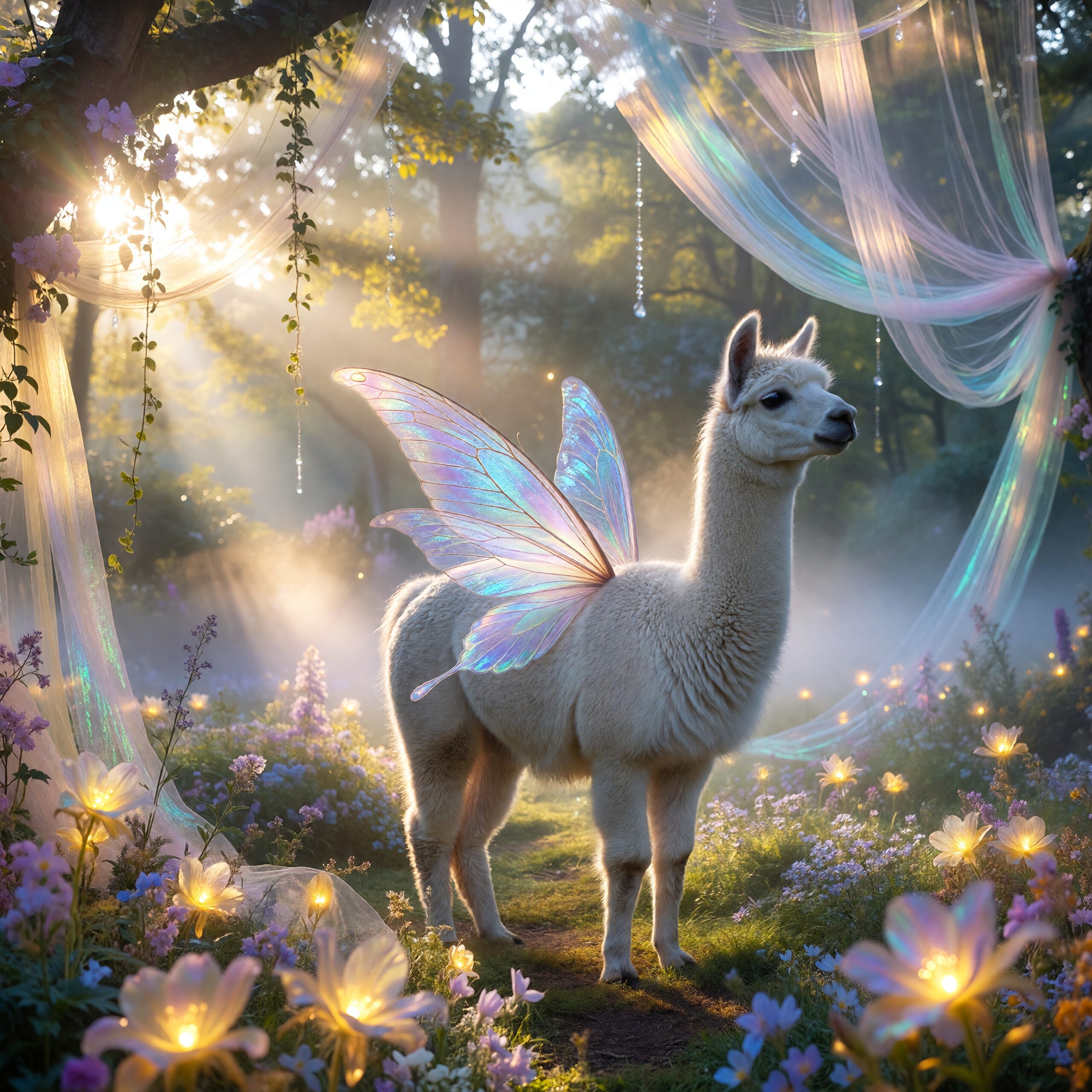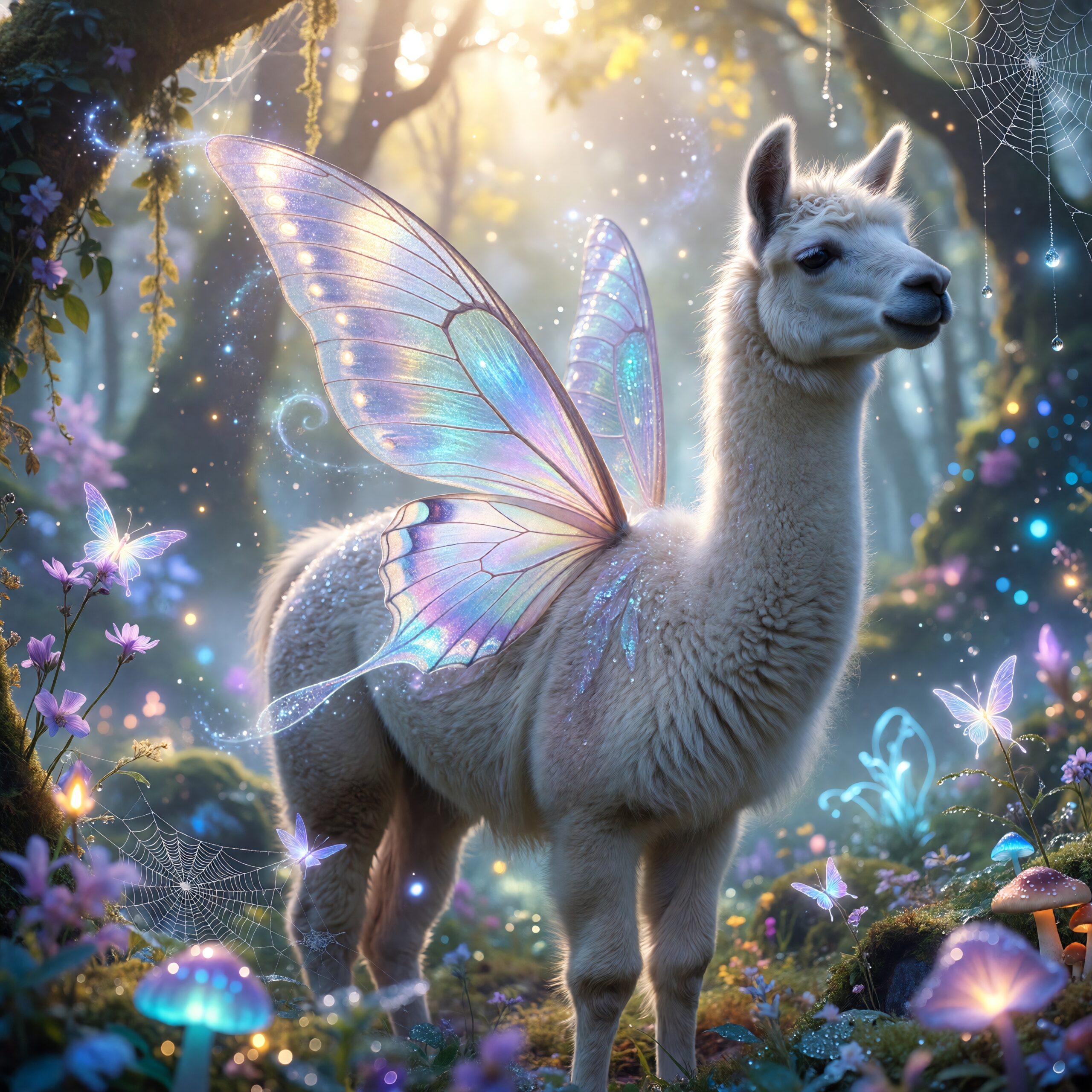 a white llama depicted in a Dreamy Dawn Fairy Realm, where delicate, iridescent wings, and soft, pastel hues evoke a sense of gentle wonder and magic. Use a color palette of soft, shimmering yellow and blue to capture the essence of the fairy realm.