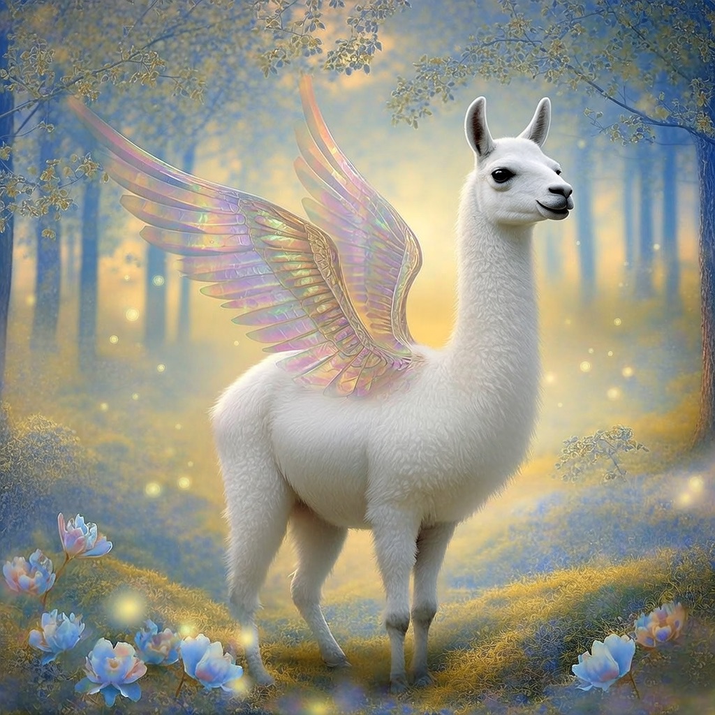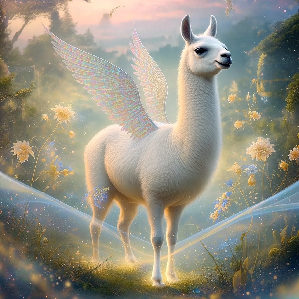 a white llama depicted in a Dreamy Dawn Fairy Realm, where delicate, iridescent wings, and soft, pastel hues evoke a sense of gentle wonder and magic. Use a color palette of soft, shimmering yellow and blue to capture the essence of the fairy realm.