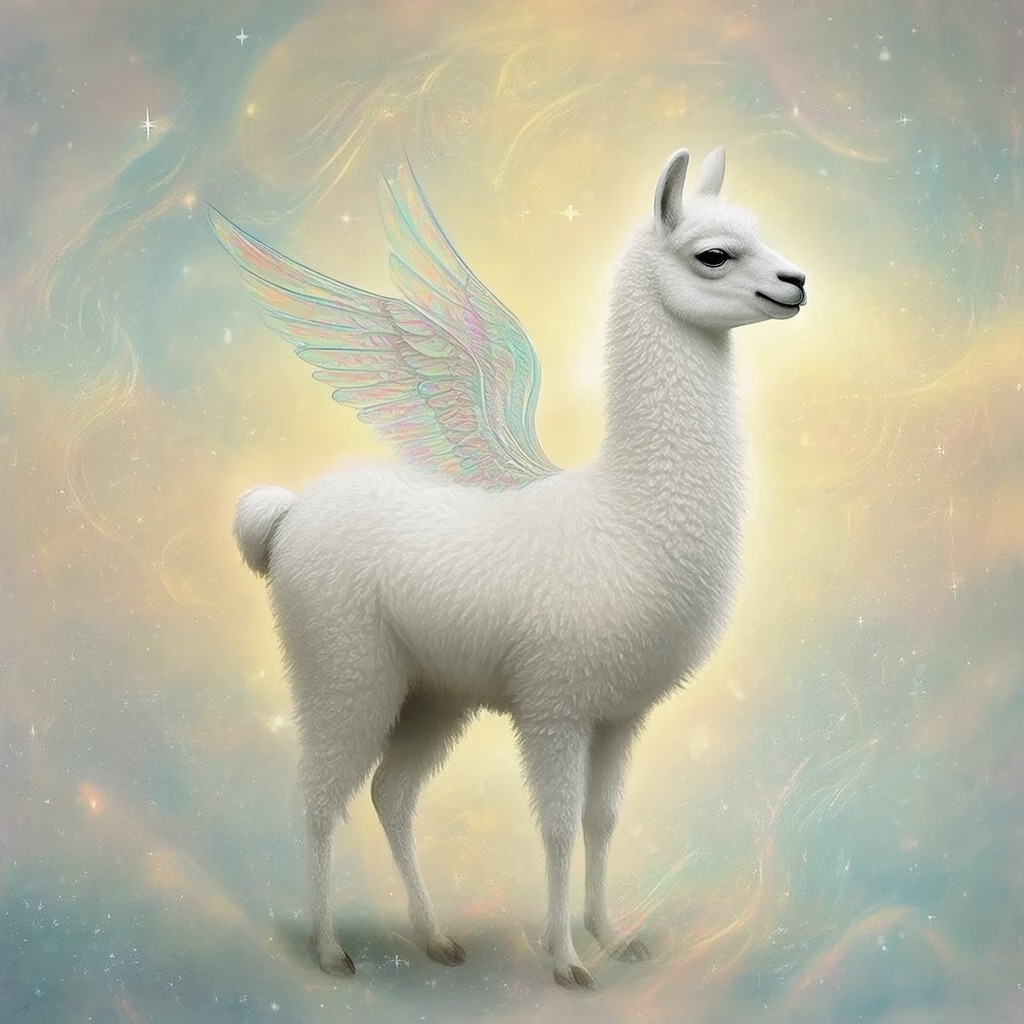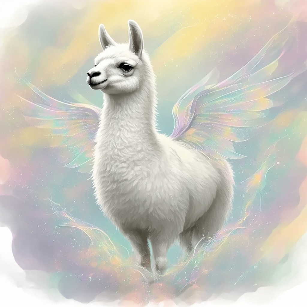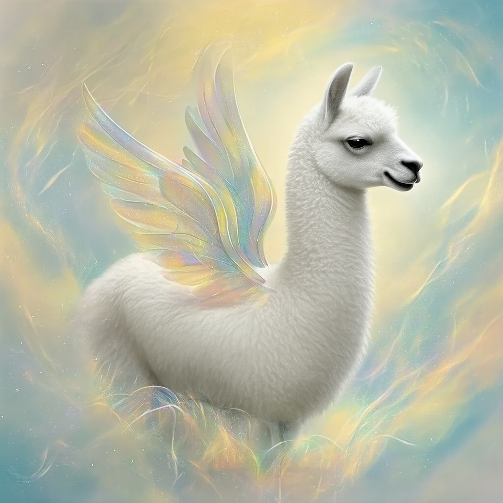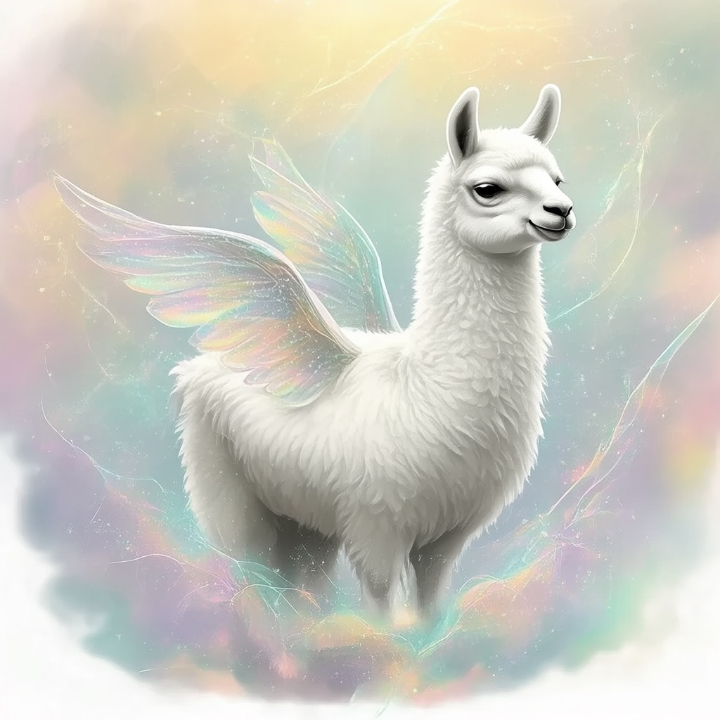 a white llama depicted in a Dreamy Dawn Fairy Realm, where delicate, iridescent wings, and soft, pastel hues evoke a sense of gentle wonder and magic. Use a color palette of soft, shimmering yellow and blue to capture the essence of the fairy realm.