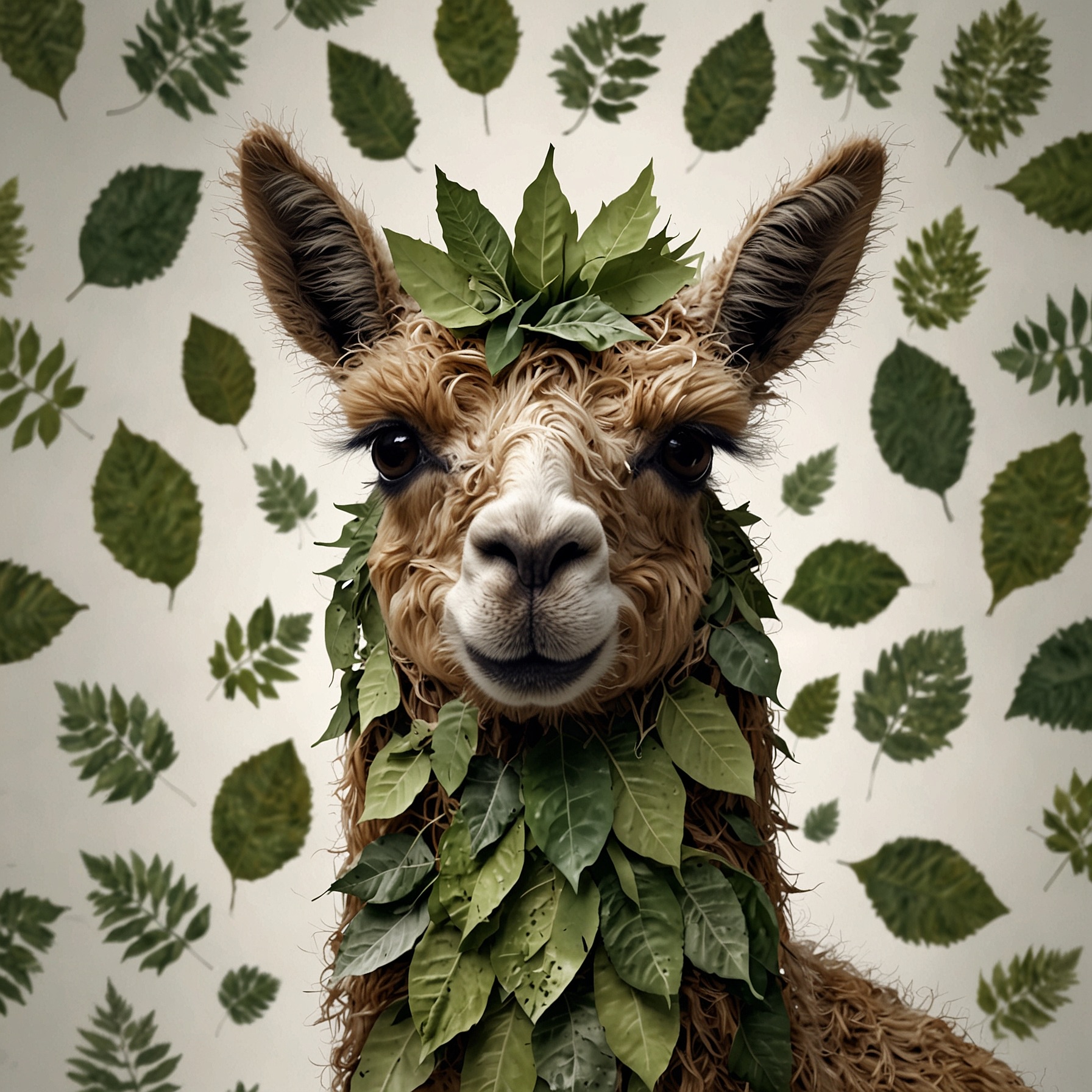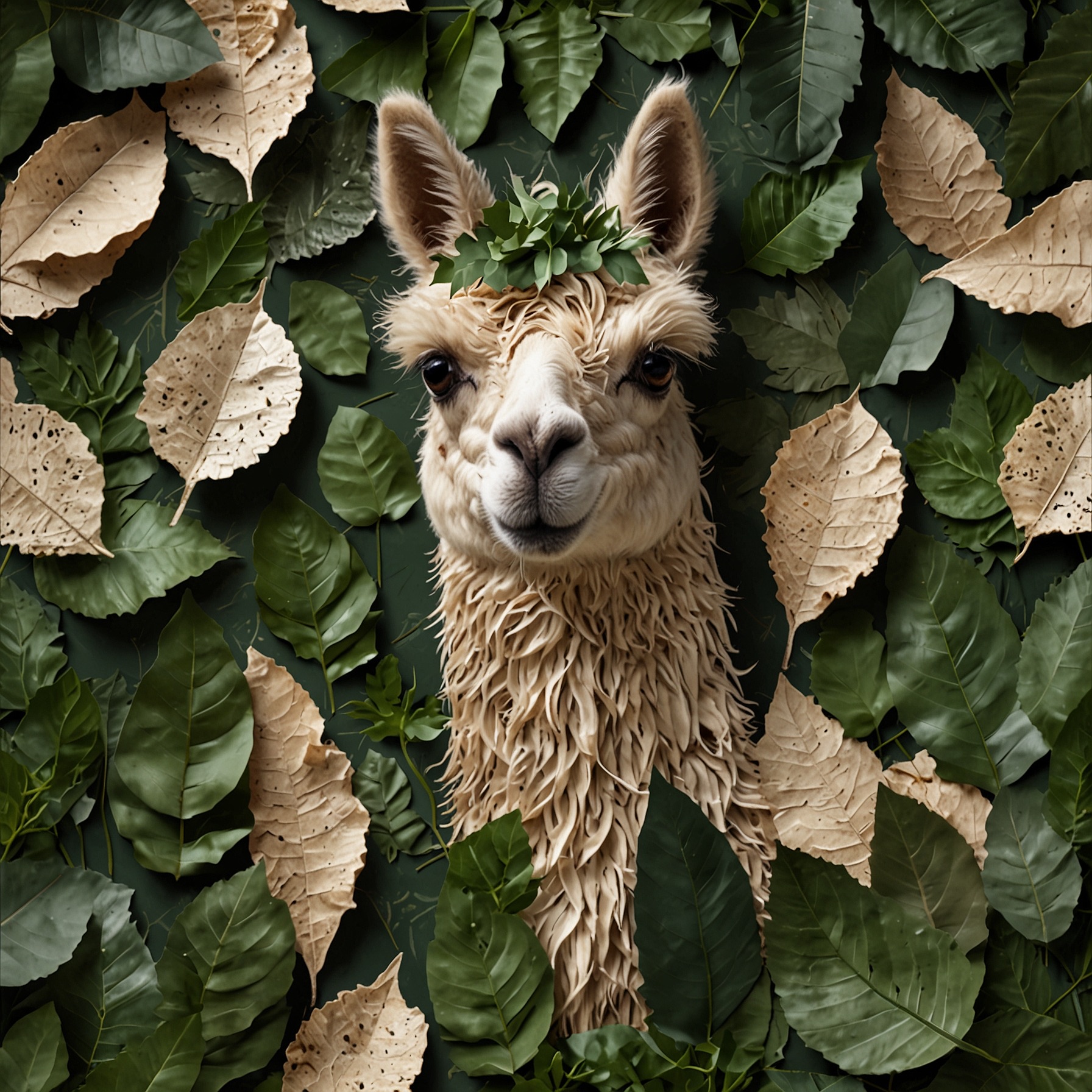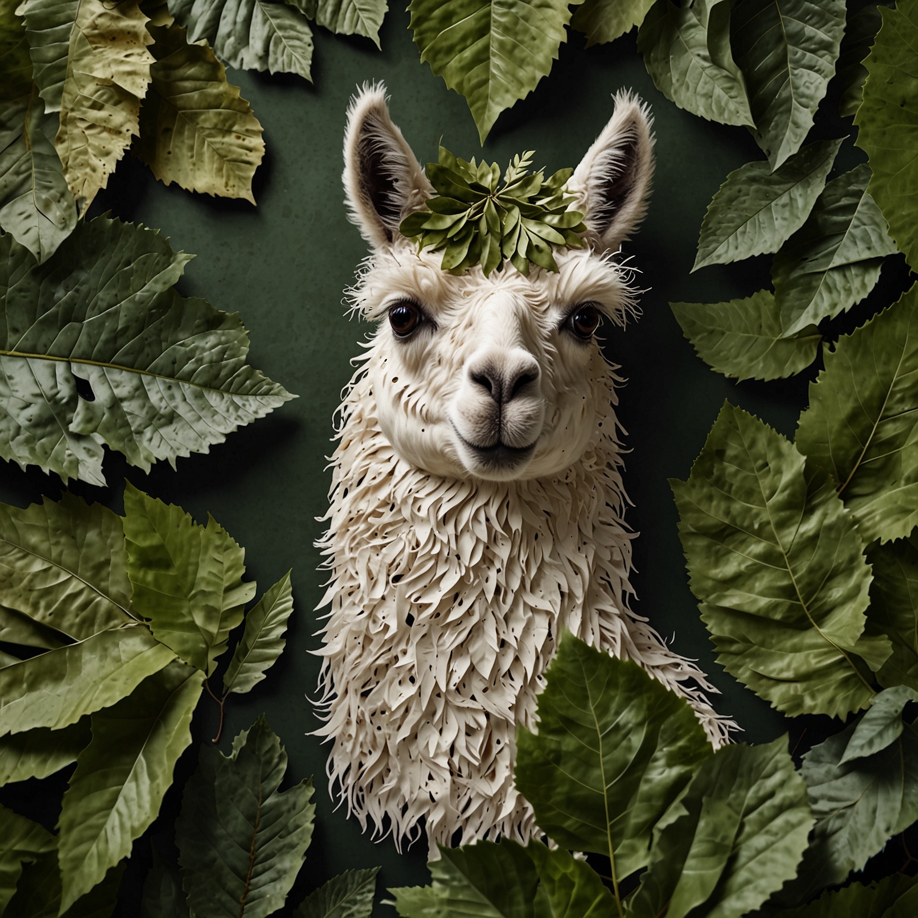 a llama made entirely from natural leaves, creative leaf collage art, layered green and dry leaves forming body, face and clothes, visible leaf veins and textures, handcrafted botanical art style, clean white background, top-down flat lay composition, highly detailed, soft natural lighting, realistic leaf textures, 8k