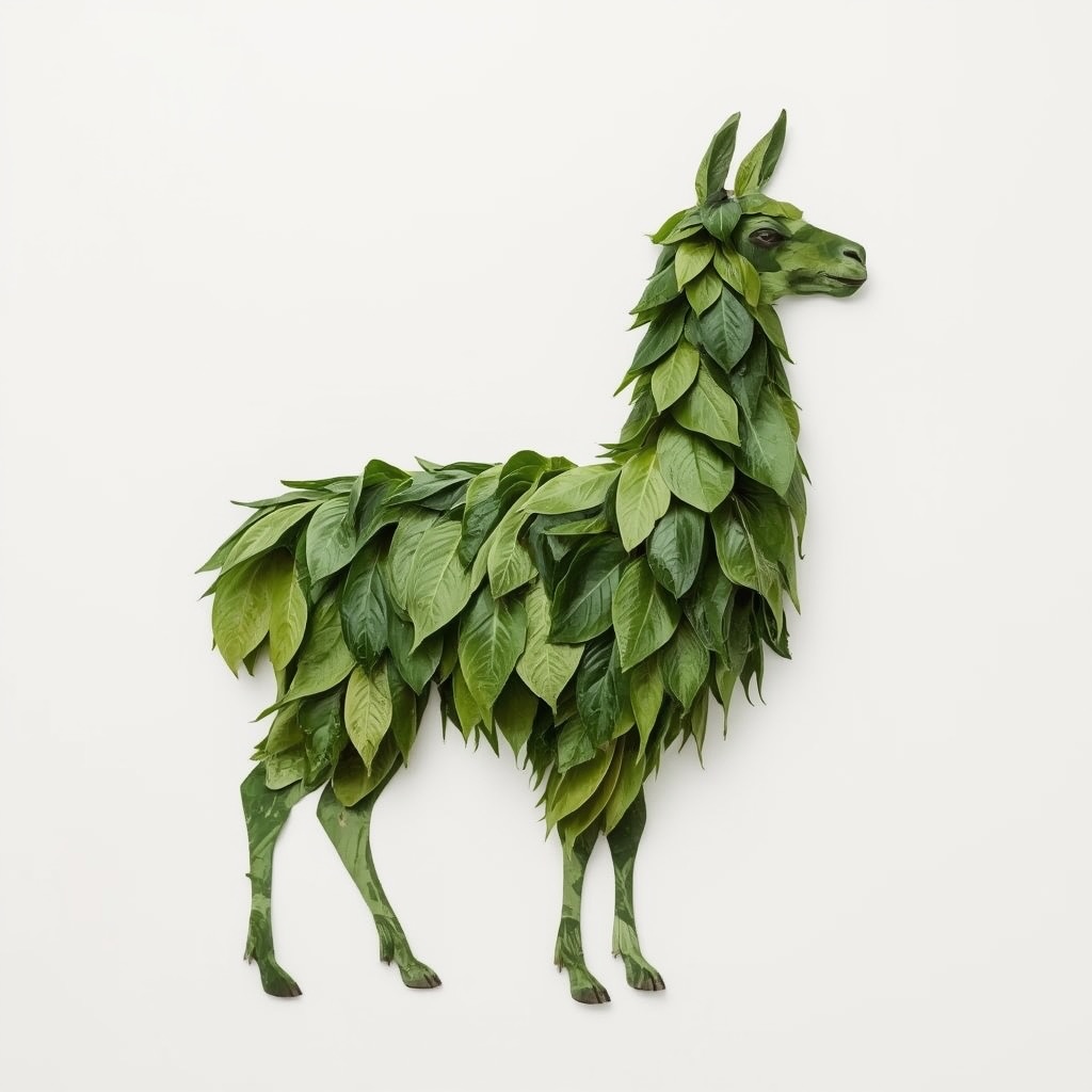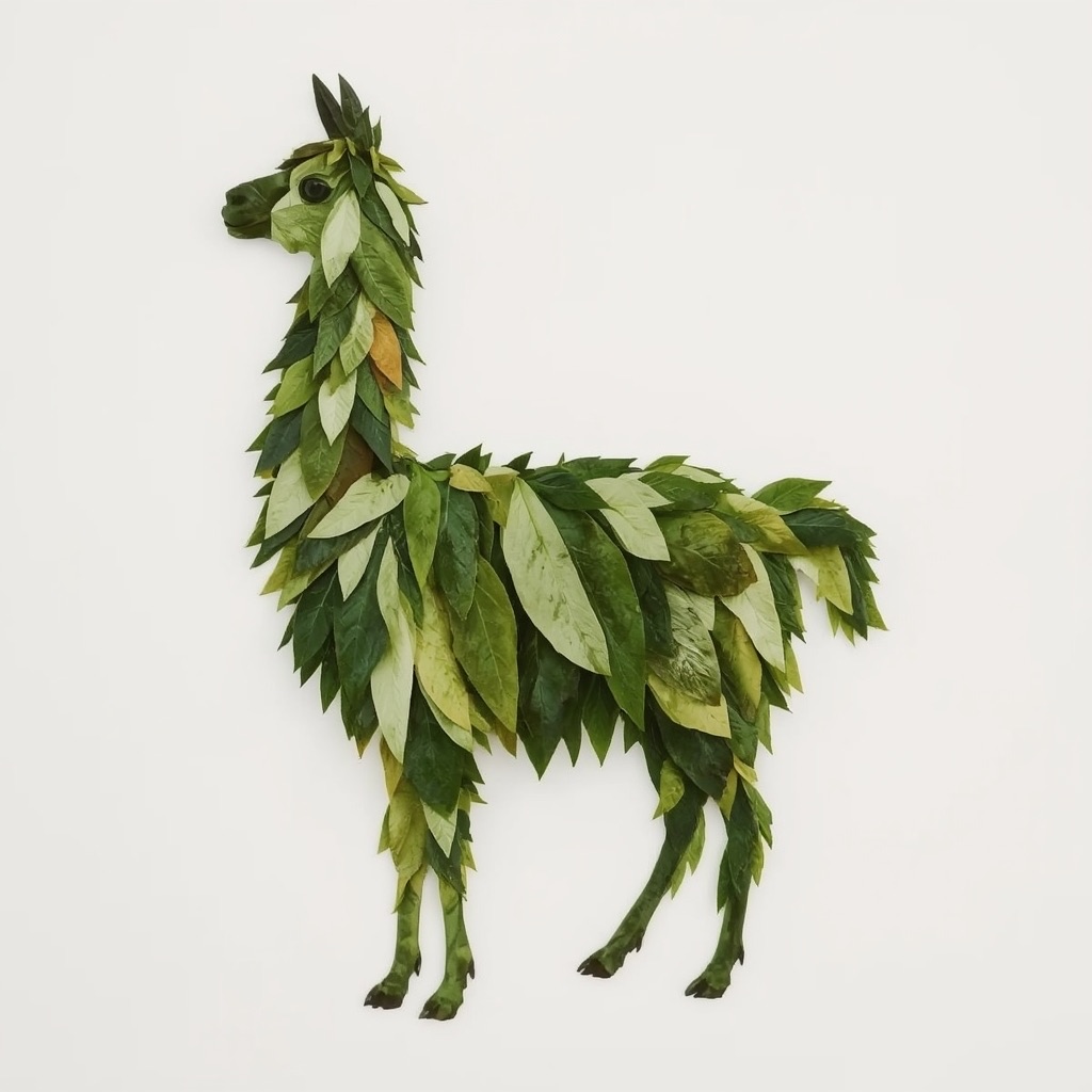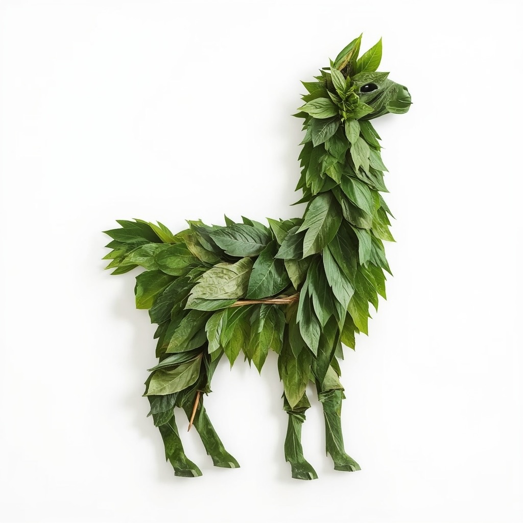 a llama made entirely from natural leaves, creative leaf collage art, layered green and dry leaves forming body, face and clothes, visible leaf veins and textures, handcrafted botanical art style, clean white background, top-down flat lay composition, highly detailed, soft natural lighting, realistic leaf textures, 8k