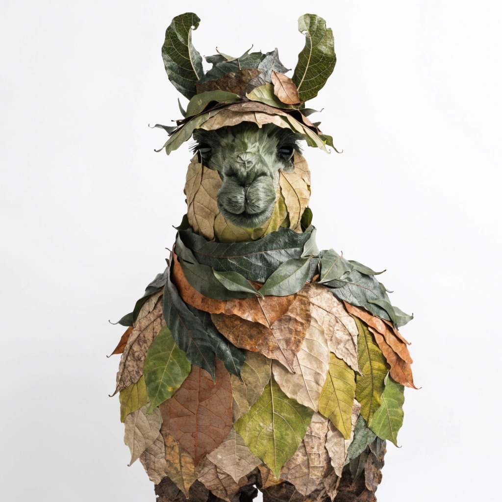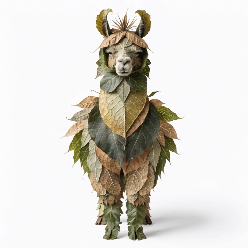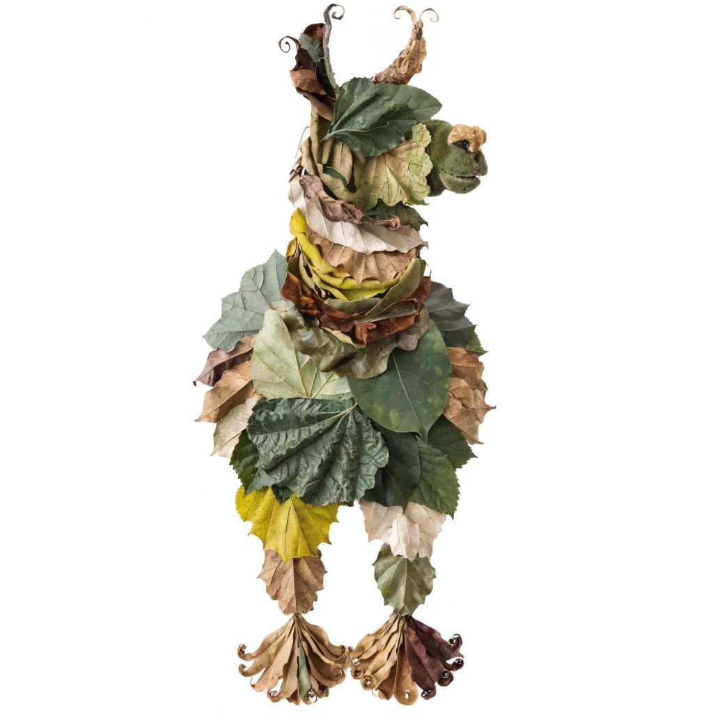a llama made entirely from natural leaves, creative leaf collage art, layered green and dry leaves forming body, face and clothes, visible leaf veins and textures, handcrafted botanical art style, clean white background, top-down flat lay composition, highly detailed, soft natural lighting, realistic leaf textures, 8k