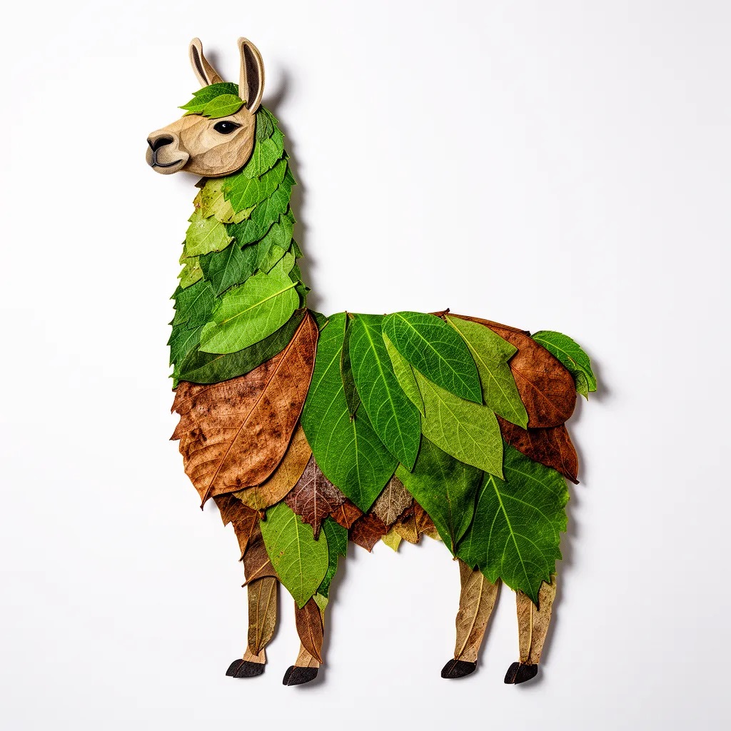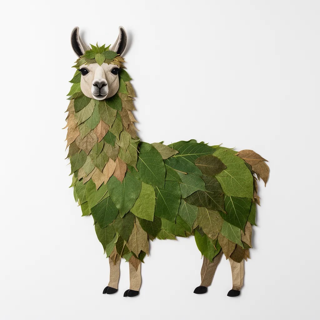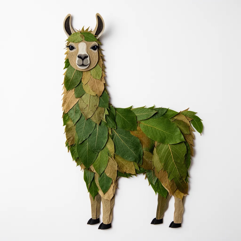 a llama made entirely from natural leaves, creative leaf collage art, layered green and dry leaves forming body, face and clothes, visible leaf veins and textures, handcrafted botanical art style, clean white background, top-down flat lay composition, highly detailed, soft natural lighting, realistic leaf textures, 8k