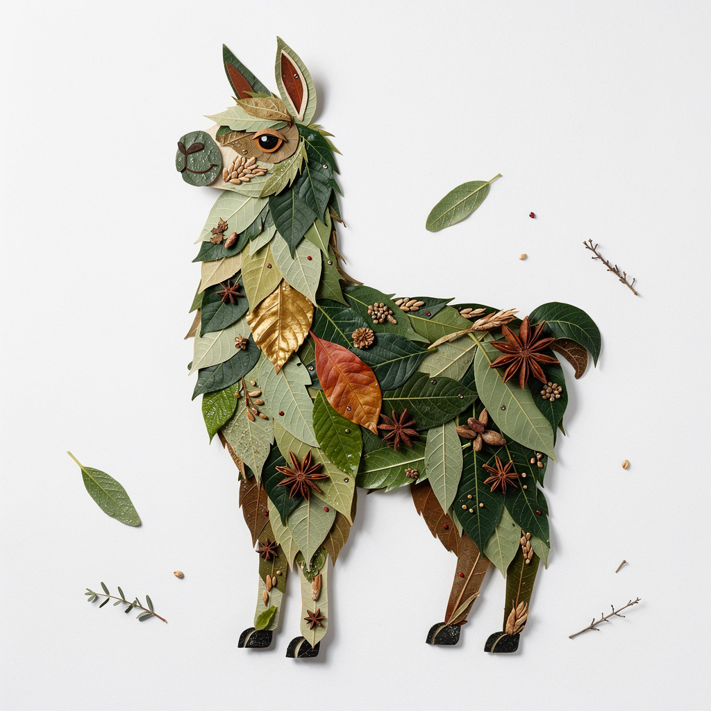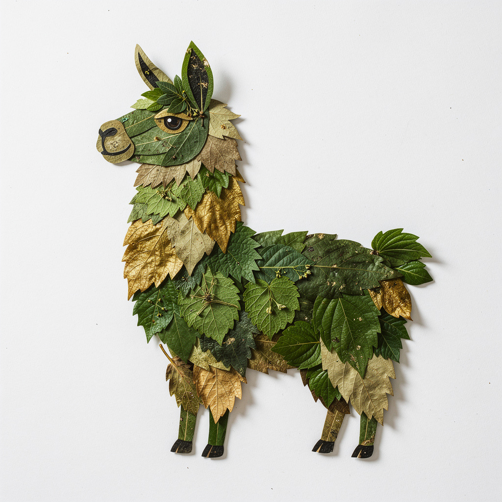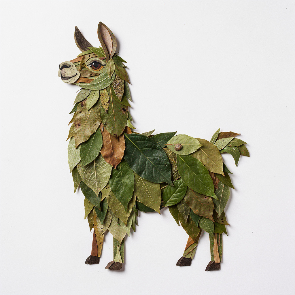 a llama made entirely from natural leaves, creative leaf collage art, layered green and dry leaves forming body, face and clothes, visible leaf veins and textures, handcrafted botanical art style, clean white background, top-down flat lay composition, highly detailed, soft natural lighting, realistic leaf textures, 8k