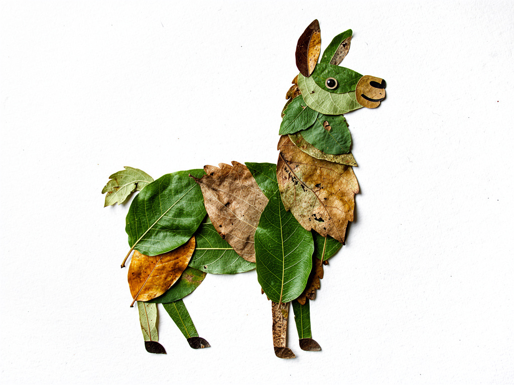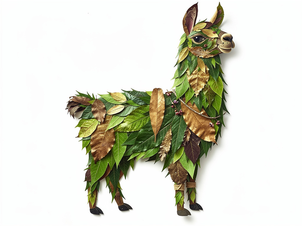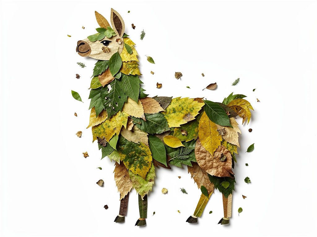 a llama made entirely from natural leaves, creative leaf collage art, layered green and dry leaves forming body, face and clothes, visible leaf veins and textures, handcrafted botanical art style, clean white background, top-down flat lay composition, highly detailed, soft natural lighting, realistic leaf textures, 8k