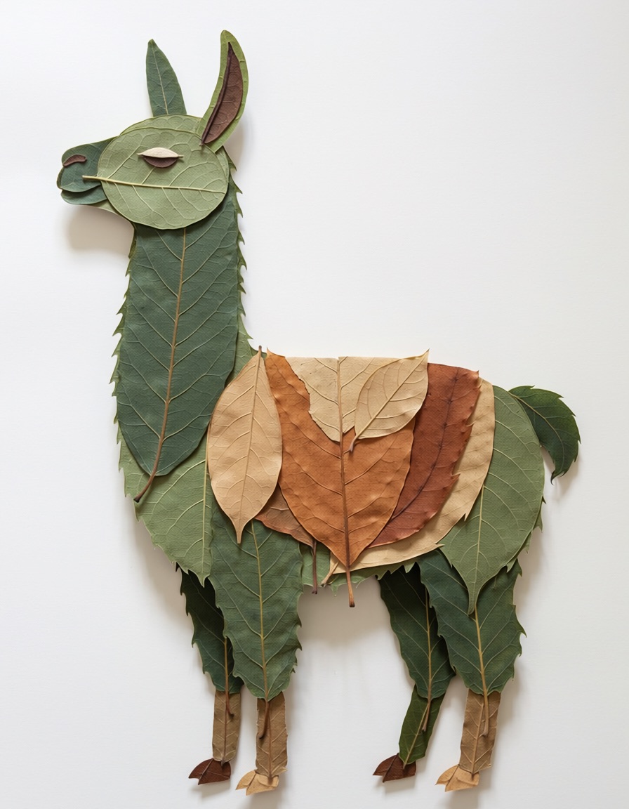a llama made entirely from natural leaves, creative leaf collage art, layered green and dry leaves forming body, face and clothes, visible leaf veins and textures, handcrafted botanical art style, clean white background, top-down flat lay composition, highly detailed, soft natural lighting, realistic leaf textures, 8k