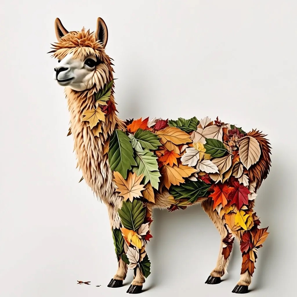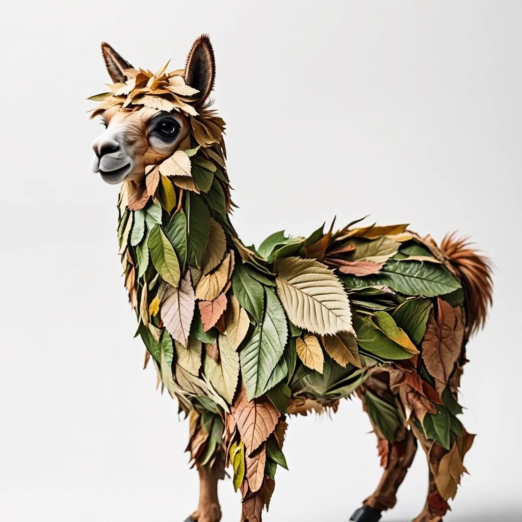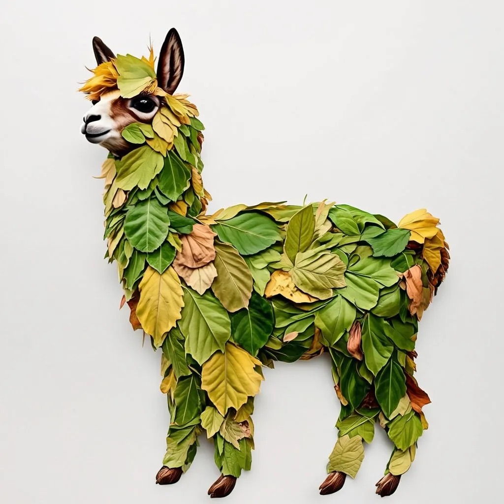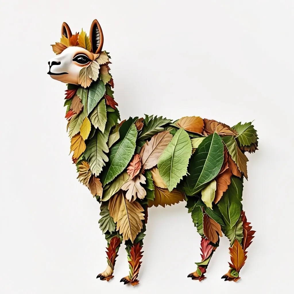 a llama made entirely from natural leaves, creative leaf collage art, layered green and dry leaves forming body, face and clothes, visible leaf veins and textures, handcrafted botanical art style, clean white background, top-down flat lay composition, highly detailed, soft natural lighting, realistic leaf textures, 8k