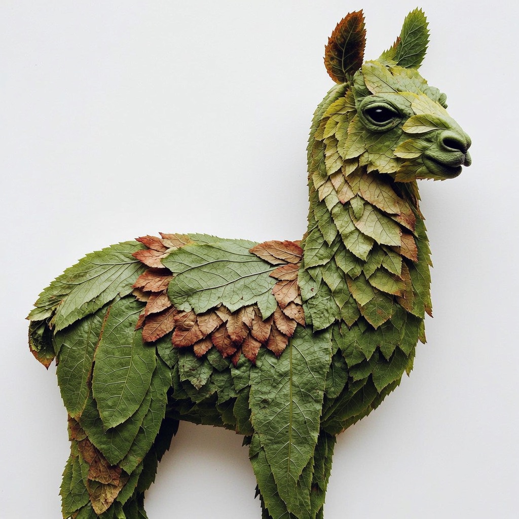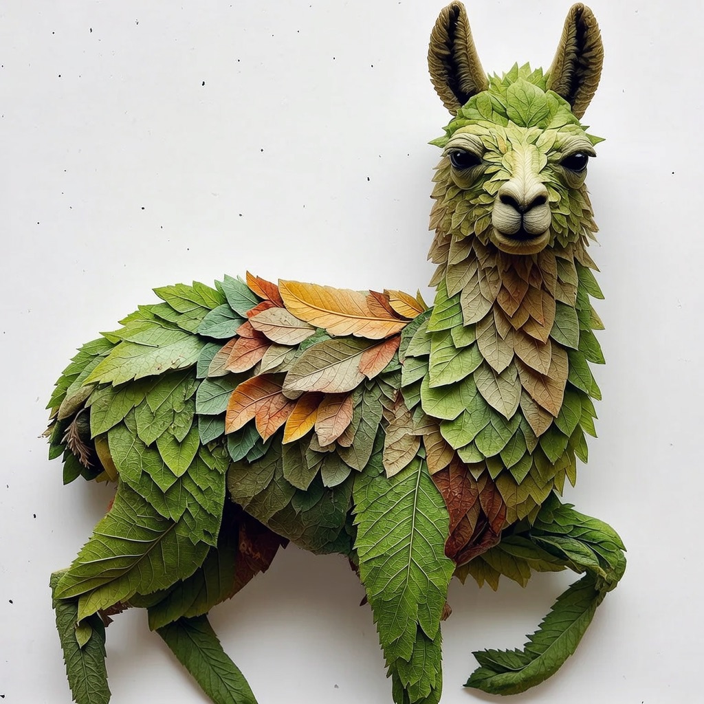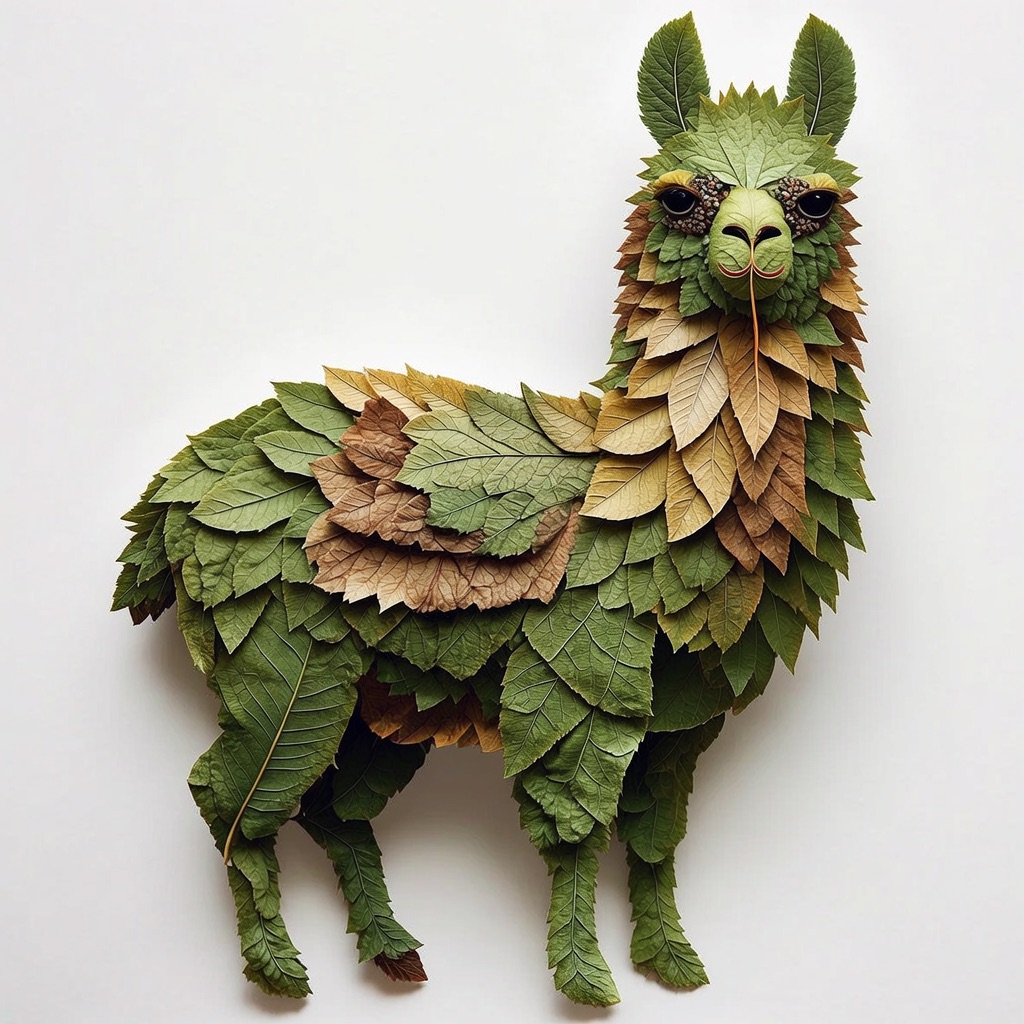 a llama made entirely from natural leaves, creative leaf collage art, layered green and dry leaves forming body, face and clothes, visible leaf veins and textures, handcrafted botanical art style, clean white background, top-down flat lay composition, highly detailed, soft natural lighting, realistic leaf textures, 8k