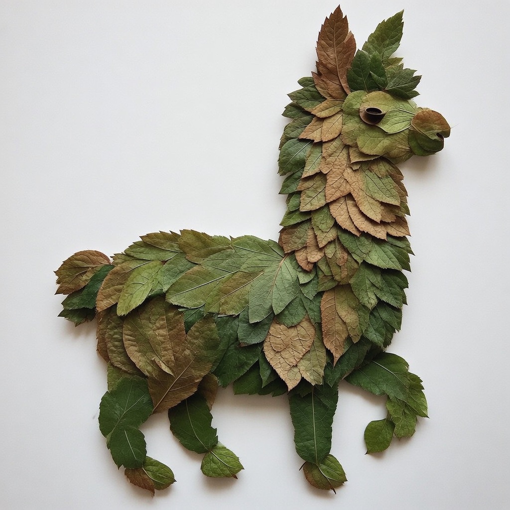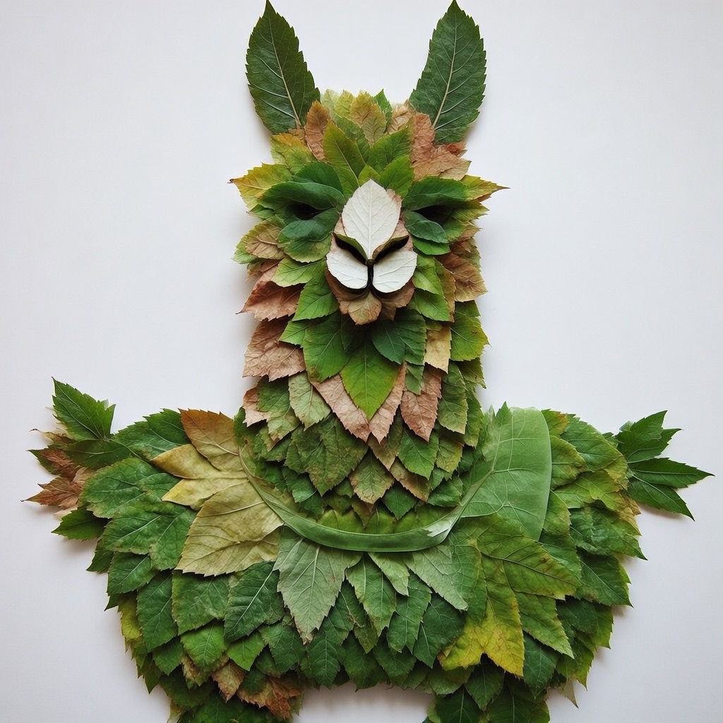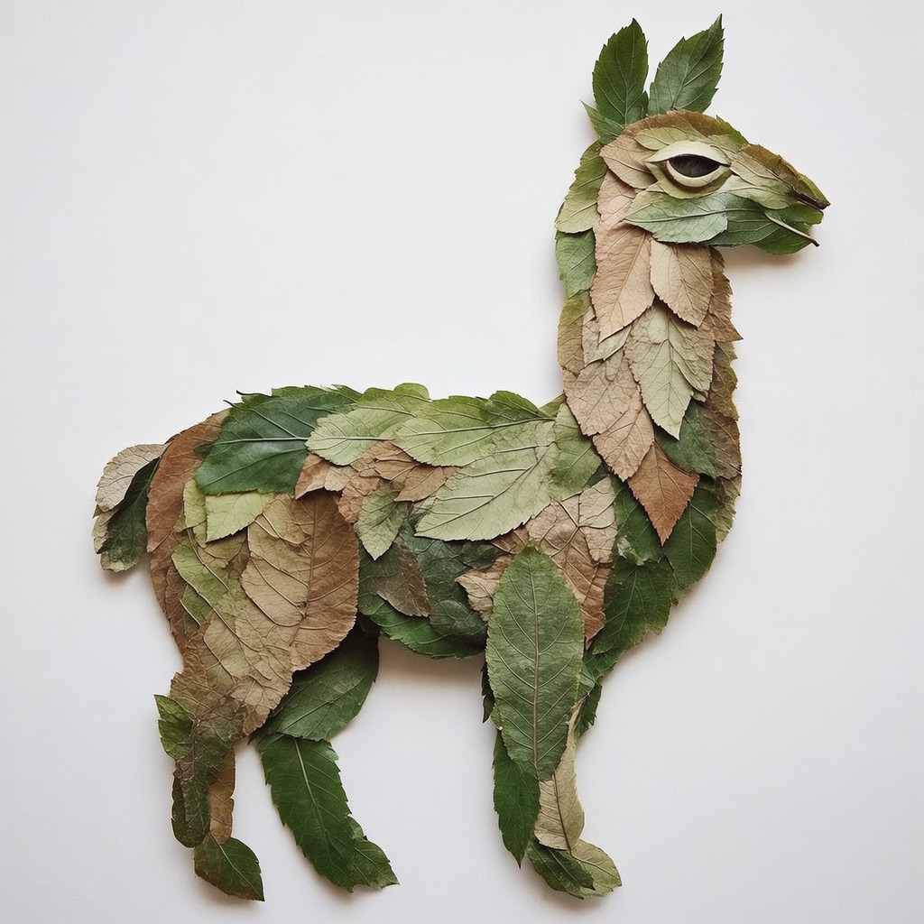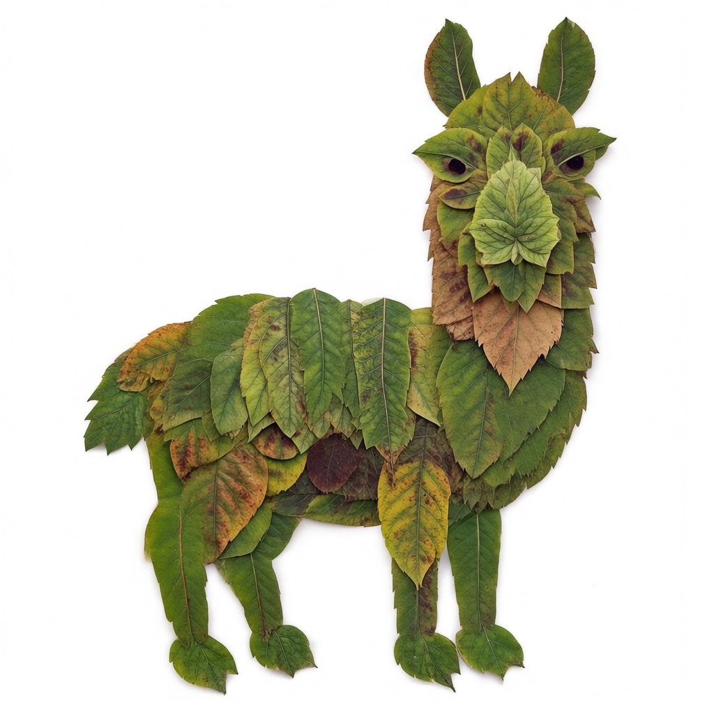 a llama made entirely from natural leaves, creative leaf collage art, layered green and dry leaves forming body, face and clothes, visible leaf veins and textures, handcrafted botanical art style, clean white background, top-down flat lay composition, highly detailed, soft natural lighting, realistic leaf textures, 8k