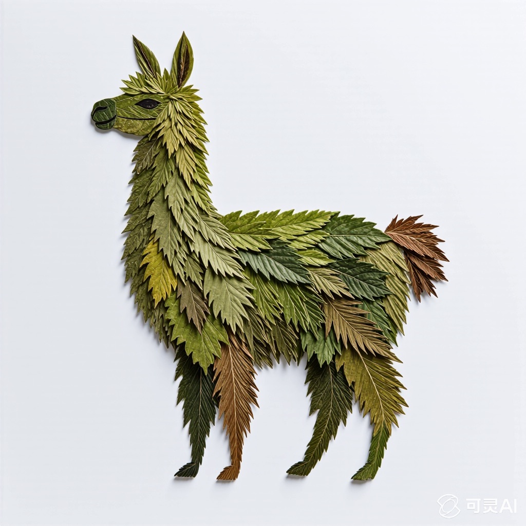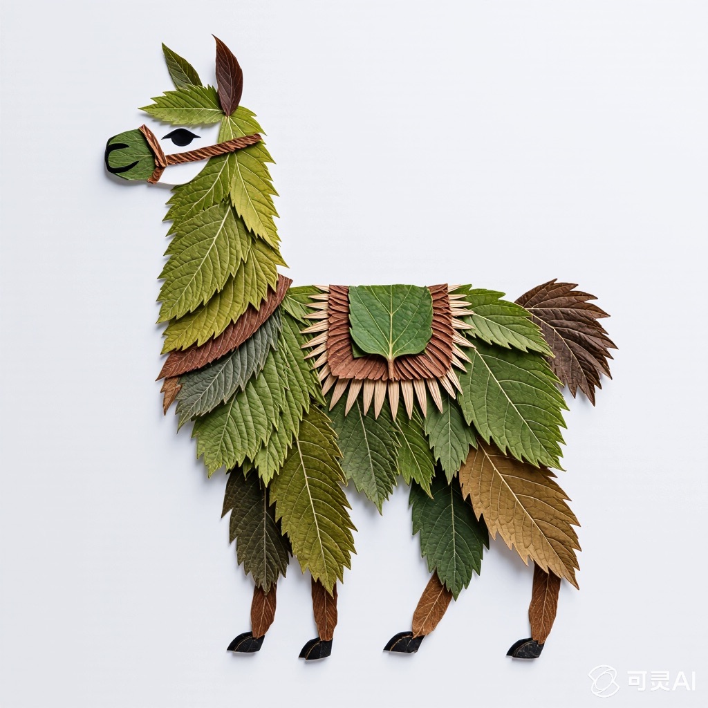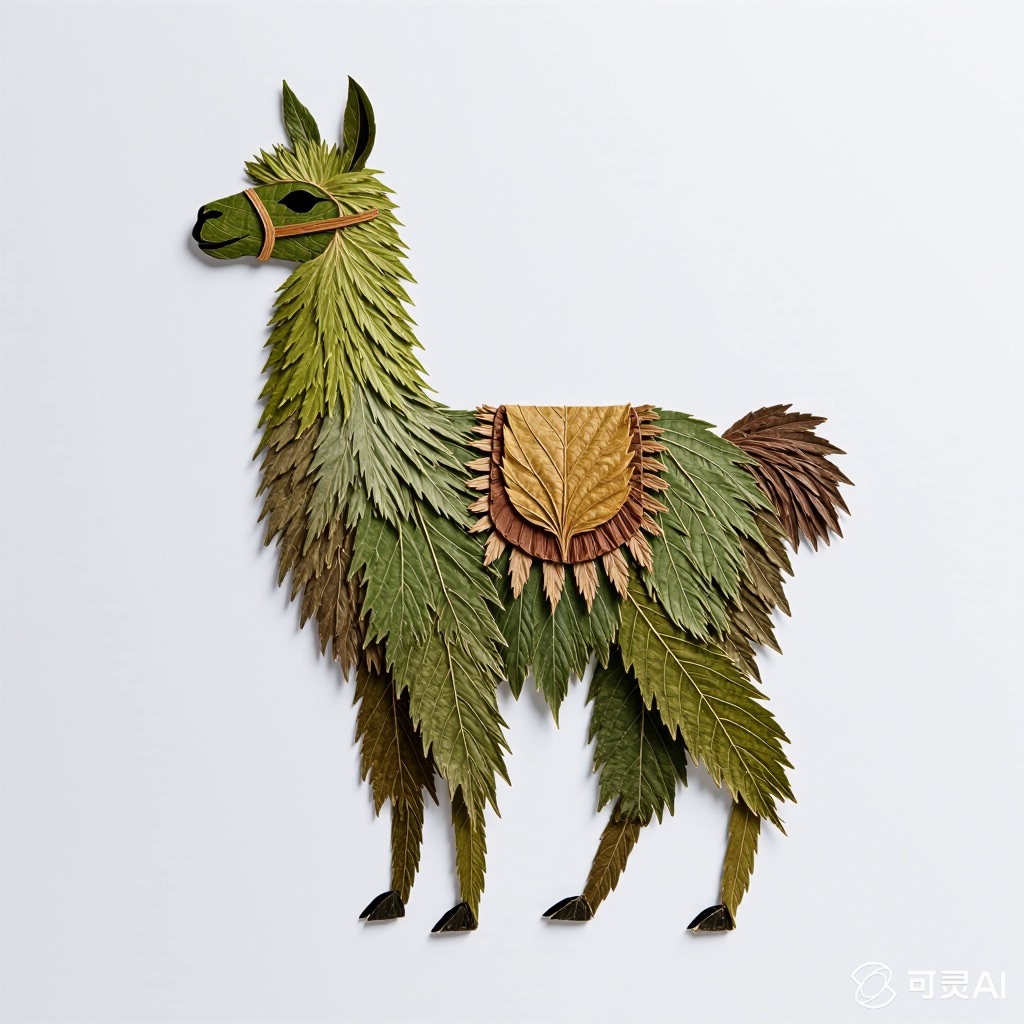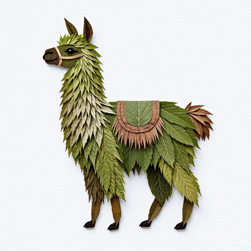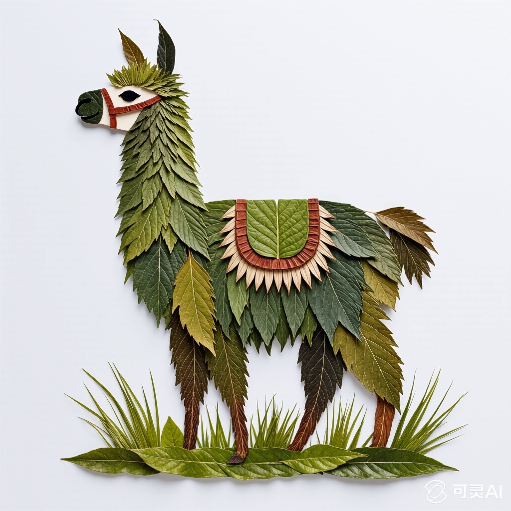 a llama made entirely from natural leaves, creative leaf collage art, layered green and dry leaves forming body, face and clothes, visible leaf veins and textures, handcrafted botanical art style, clean white background, top-down flat lay composition, highly detailed, soft natural lighting, realistic leaf textures, 8k