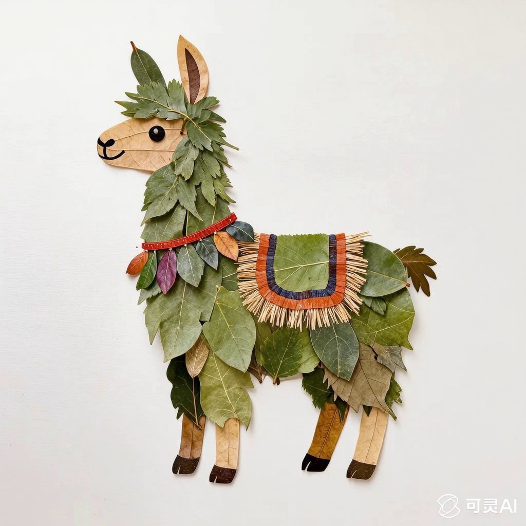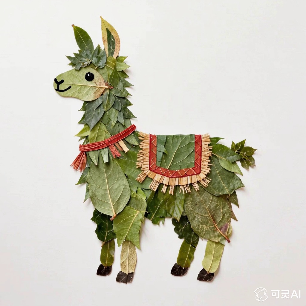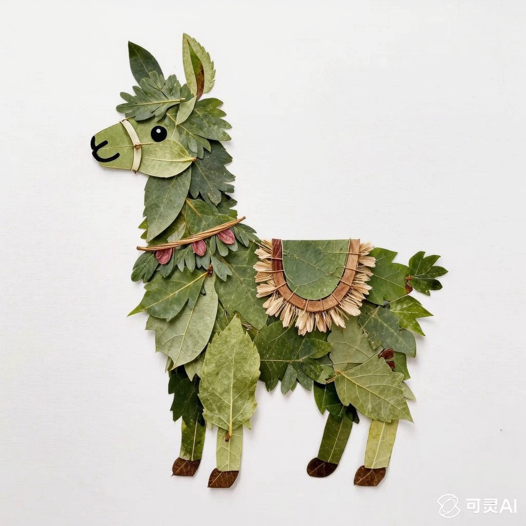 a llama made entirely from natural leaves, creative leaf collage art, layered green and dry leaves forming body, face and clothes, visible leaf veins and textures, handcrafted botanical art style, clean white background, top-down flat lay composition, highly detailed, soft natural lighting, realistic leaf textures, 8k