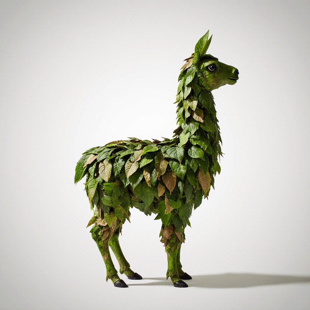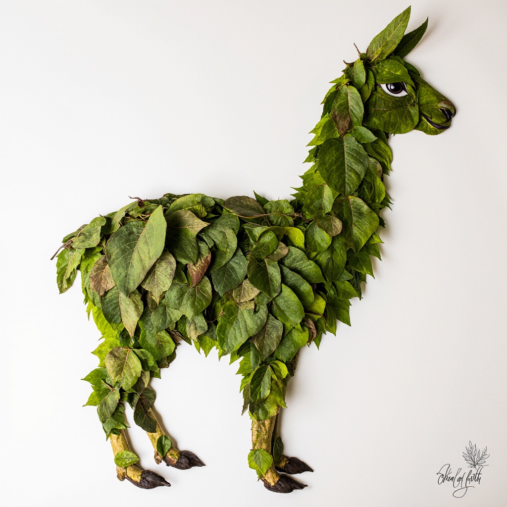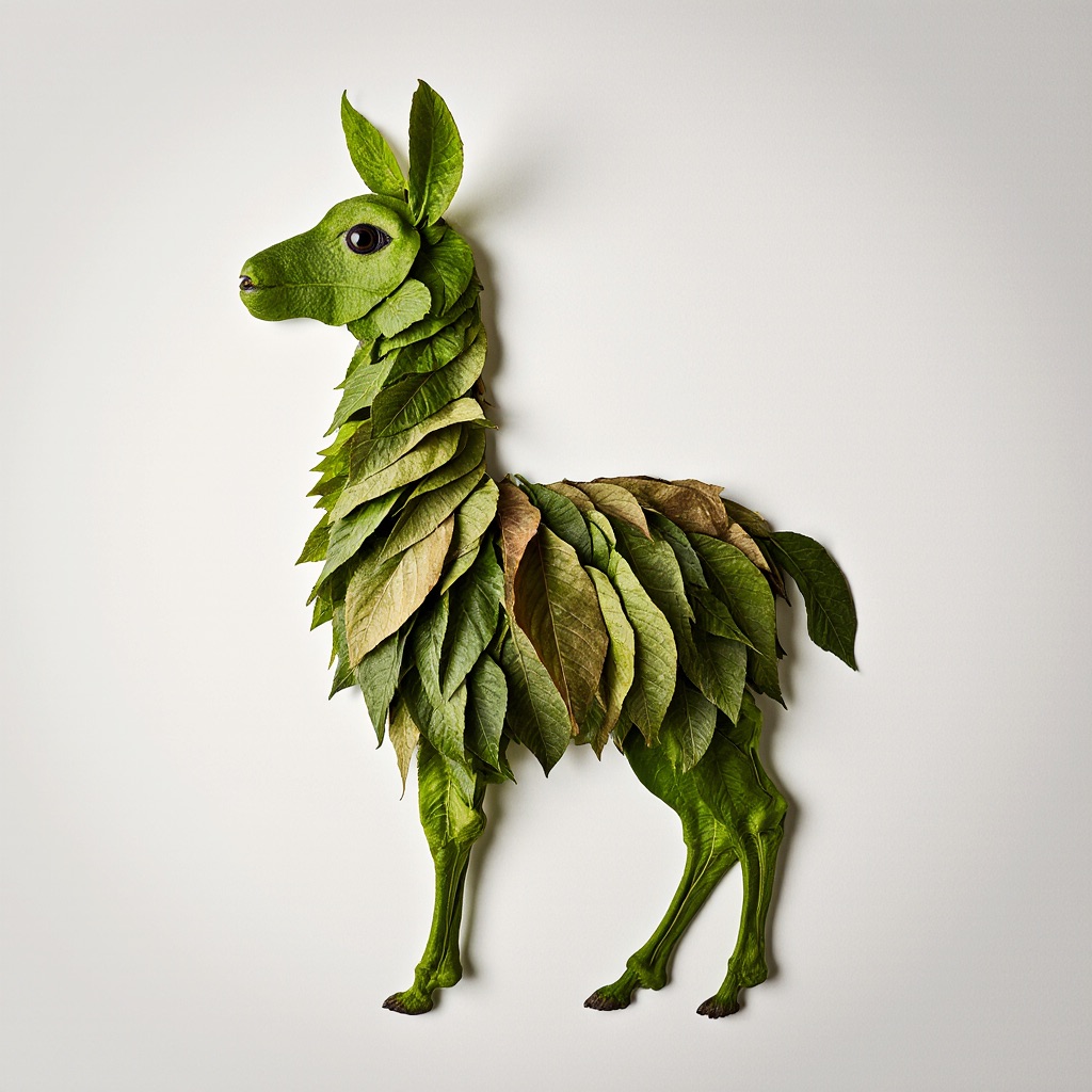 a llama made entirely from natural leaves, creative leaf collage art, layered green and dry leaves forming body, face and clothes, visible leaf veins and textures, handcrafted botanical art style, clean white background, top-down flat lay composition, highly detailed, soft natural lighting, realistic leaf textures, 8k
