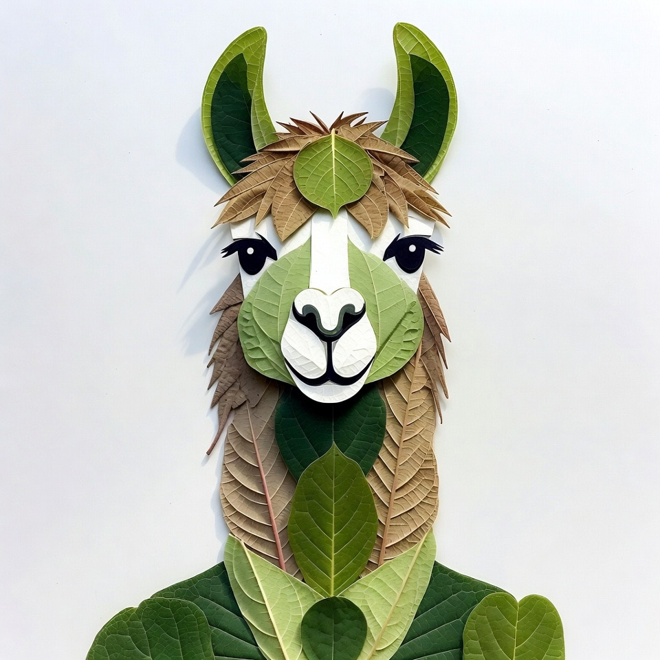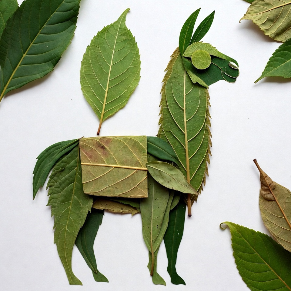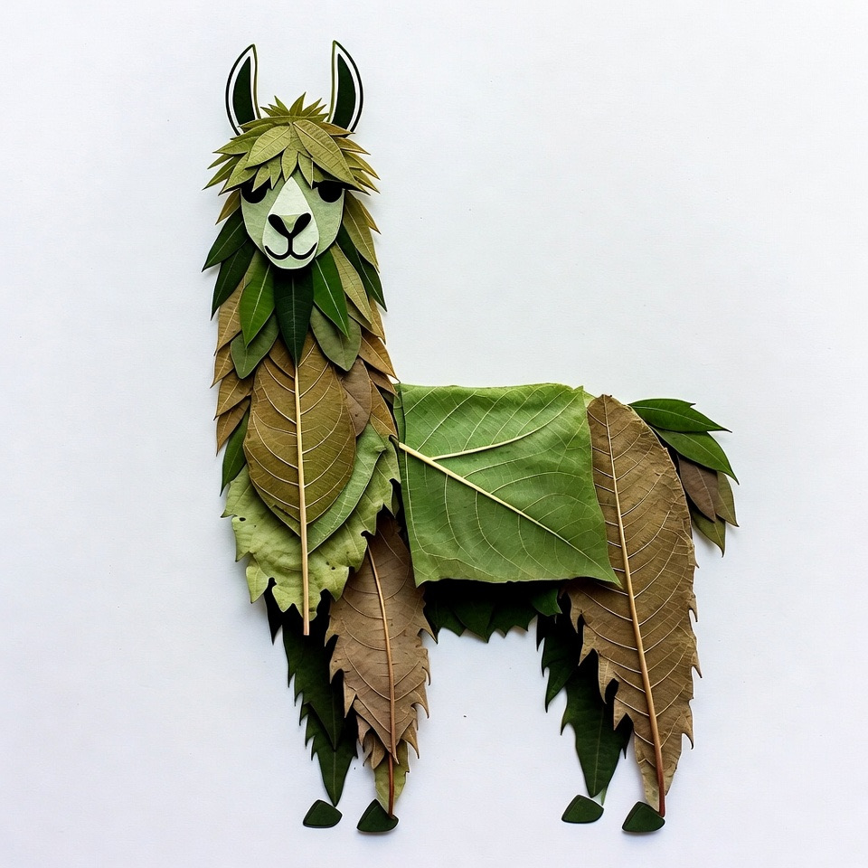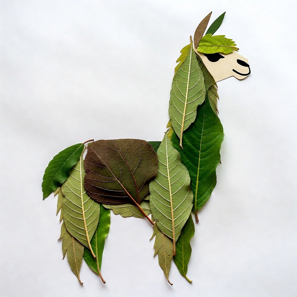 a llama made entirely from natural leaves, creative leaf collage art, layered green and dry leaves forming body, face and clothes, visible leaf veins and textures, handcrafted botanical art style, clean white background, top-down flat lay composition, highly detailed, soft natural lighting, realistic leaf textures, 8k