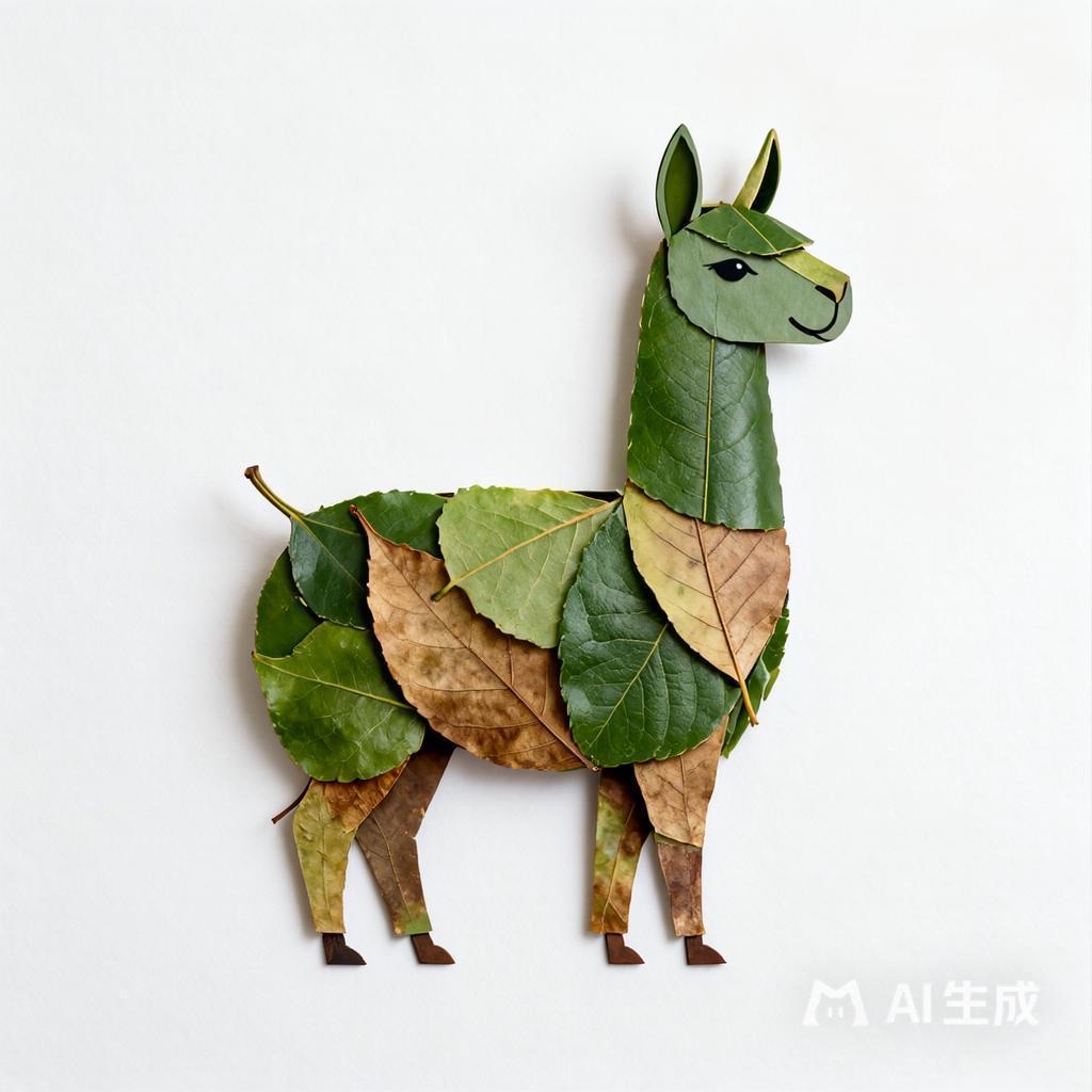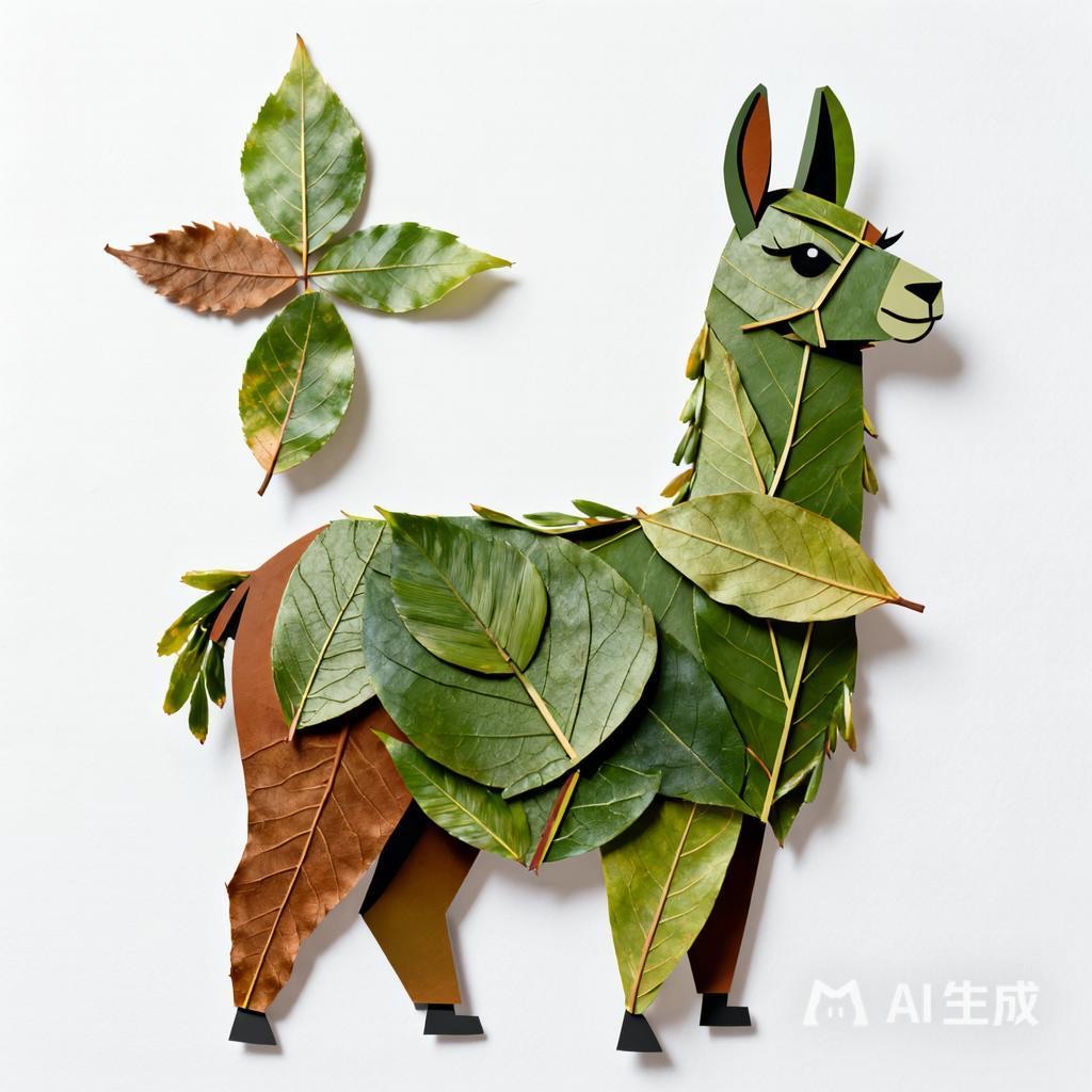 a llama made entirely from natural leaves, creative leaf collage art, layered green and dry leaves forming body, face and clothes, visible leaf veins and textures, handcrafted botanical art style, clean white background, top-down flat lay composition, highly detailed, soft natural lighting, realistic leaf textures, 8k