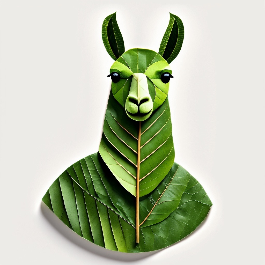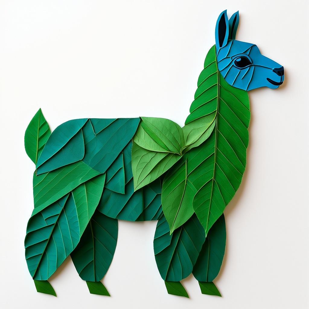 a llama made entirely from natural leaves, creative leaf collage art, layered green and dry leaves forming body, face and clothes, visible leaf veins and textures, handcrafted botanical art style, clean white background, top-down flat lay composition, highly detailed, soft natural lighting, realistic leaf textures, 8k