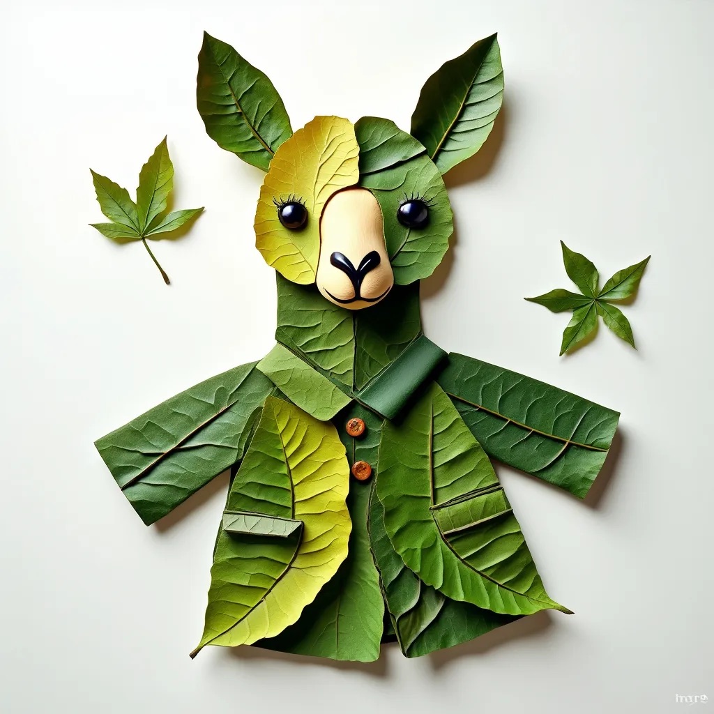 PROMPT: [subject] made entirely from natural leaves, creative leaf collage art, layered green and dry leaves forming body, face and clothes, visible leaf veins and textures, handcrafted botanical art style, clean white background, top-down flat lay composition, highly detailed, soft natural lighting, realistic leaf textures, 8k